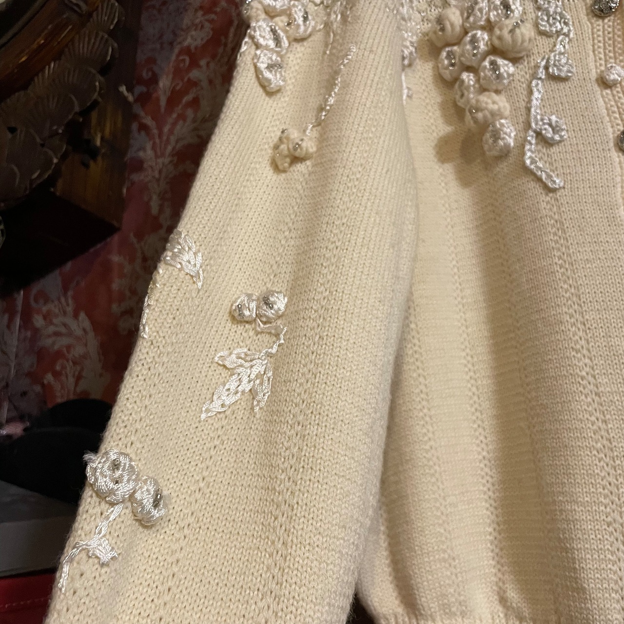 花モチーフにビーズ刺繍、そして小さなぶどうのように連なる立体装飾が印象的な、特別感あふれるウールカーディガンです。