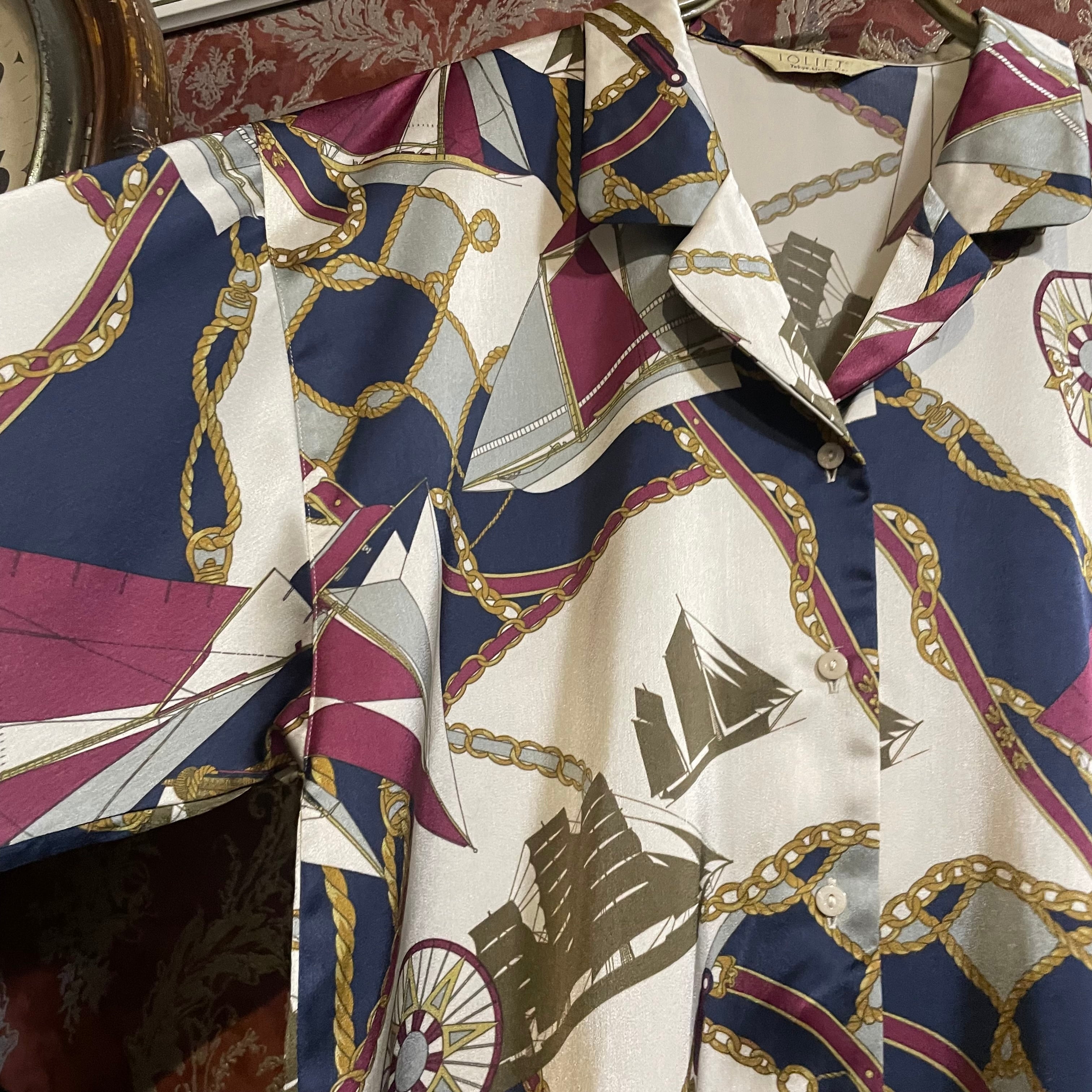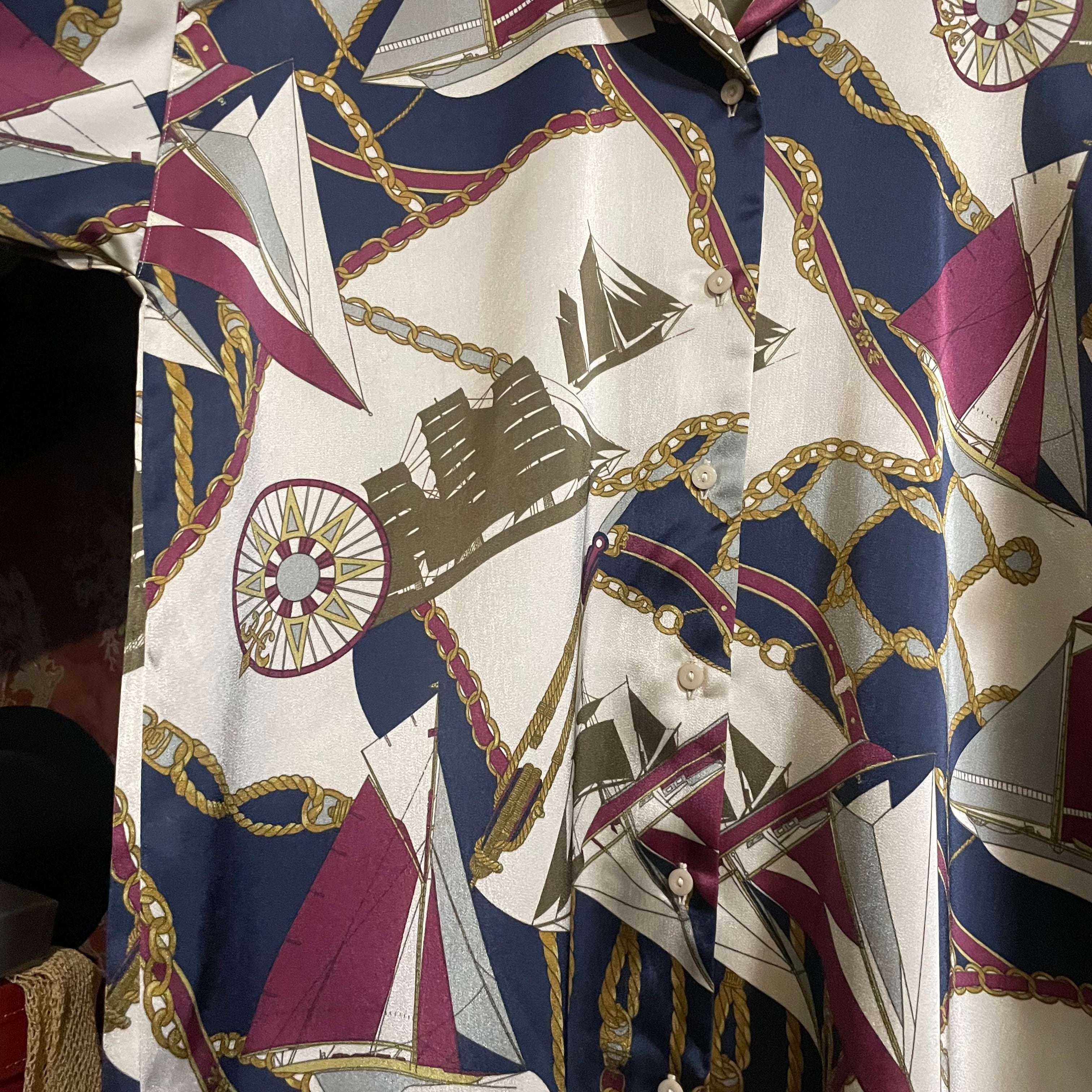 大型客船や帆船、ヨット、羅針盤、フラッグ、チェーンモチーフが組み合わされたクラシカルな総柄ブラウスです。