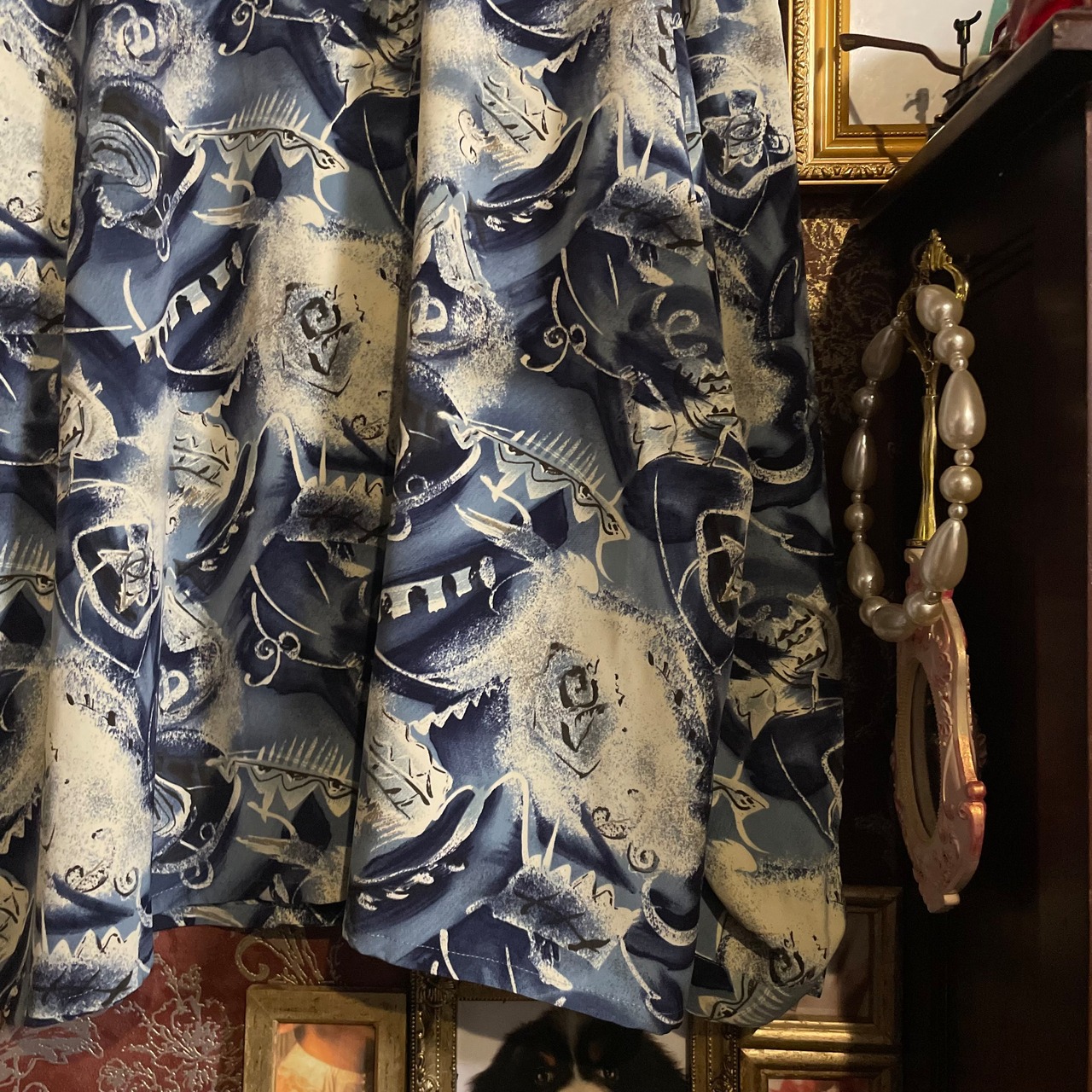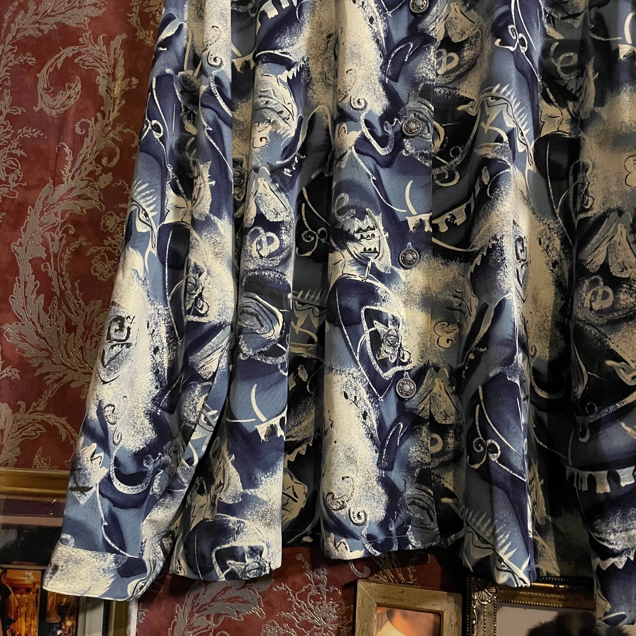 ブルー〜グレートーンをベースに、筆で描いたような模様が重なり合い、どこか幻想的な個性をまとった一枚です。