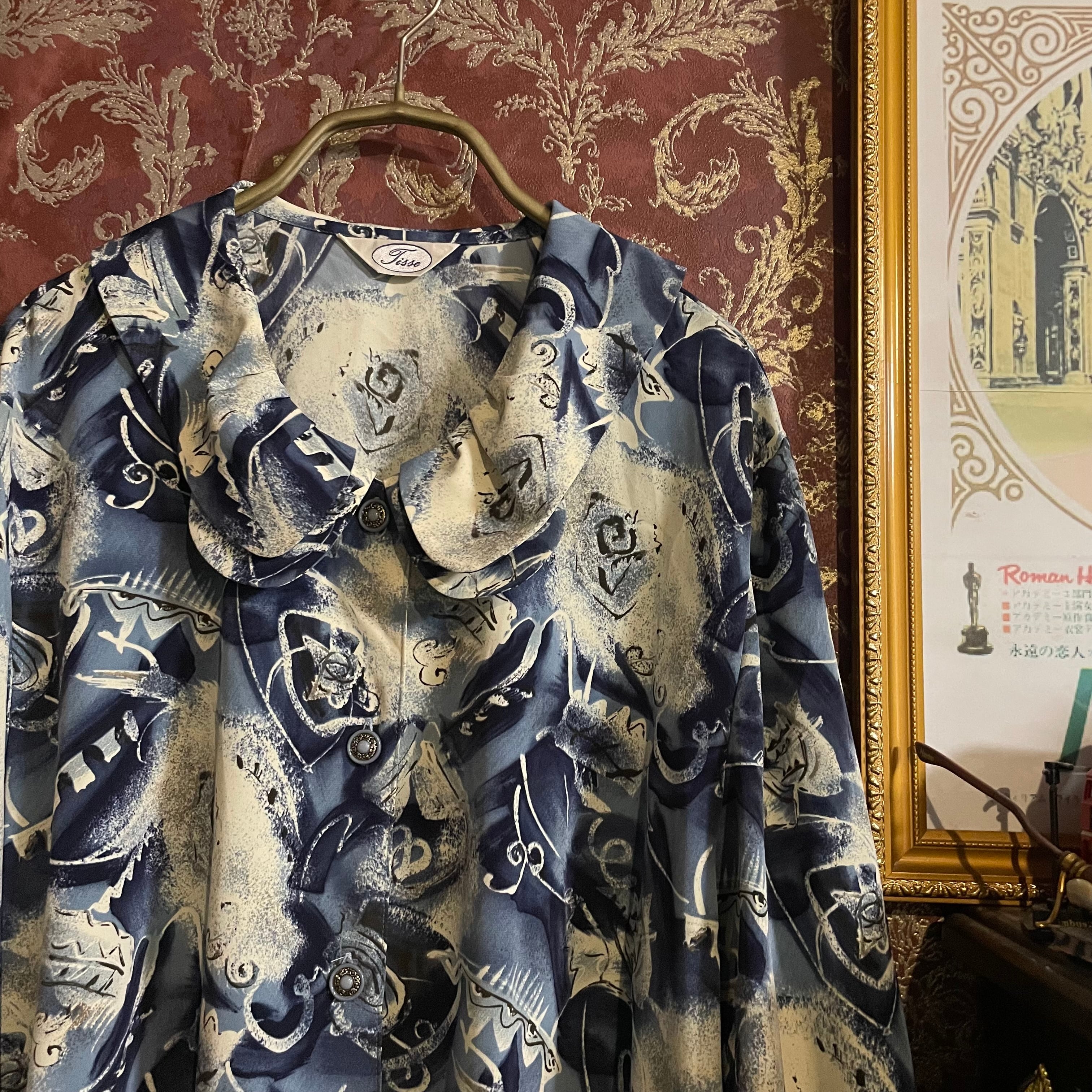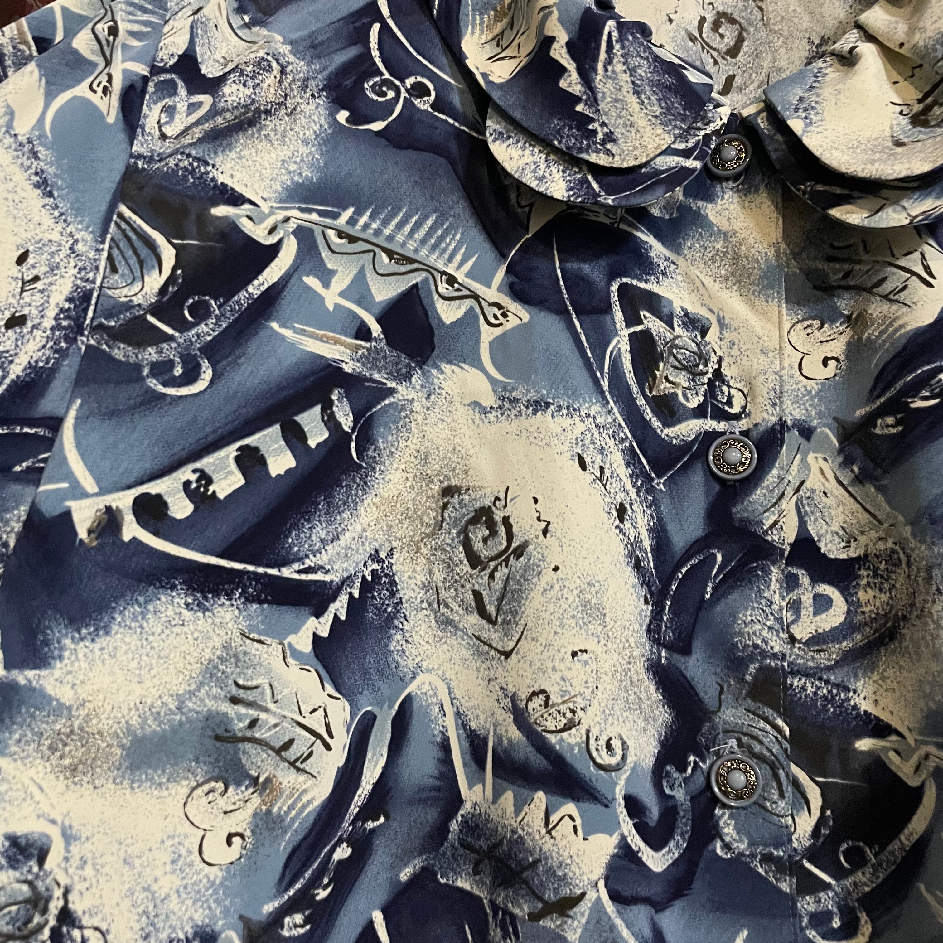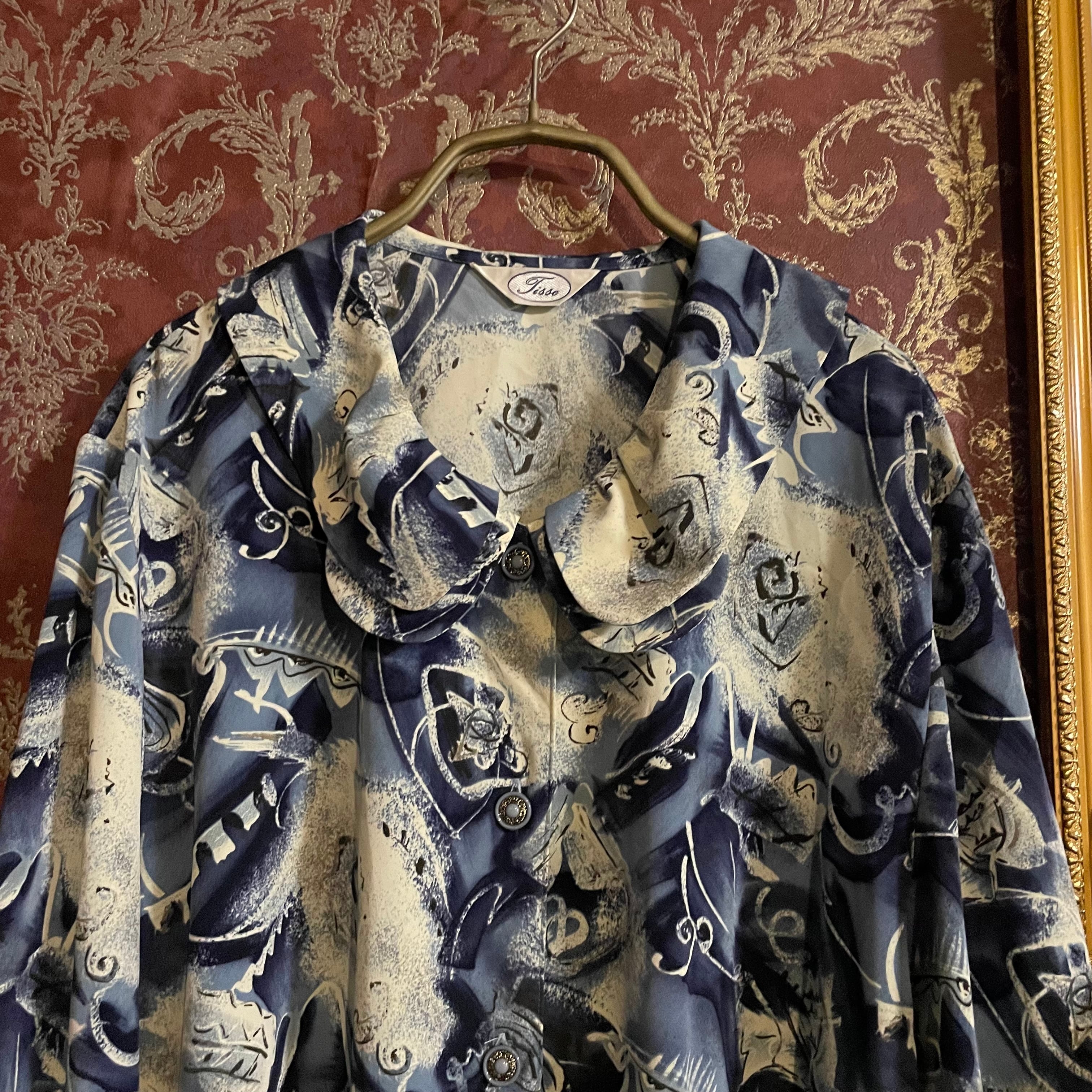 抽象的なモチーフが全面に描かれた、アート感のある総柄ブラウスです。