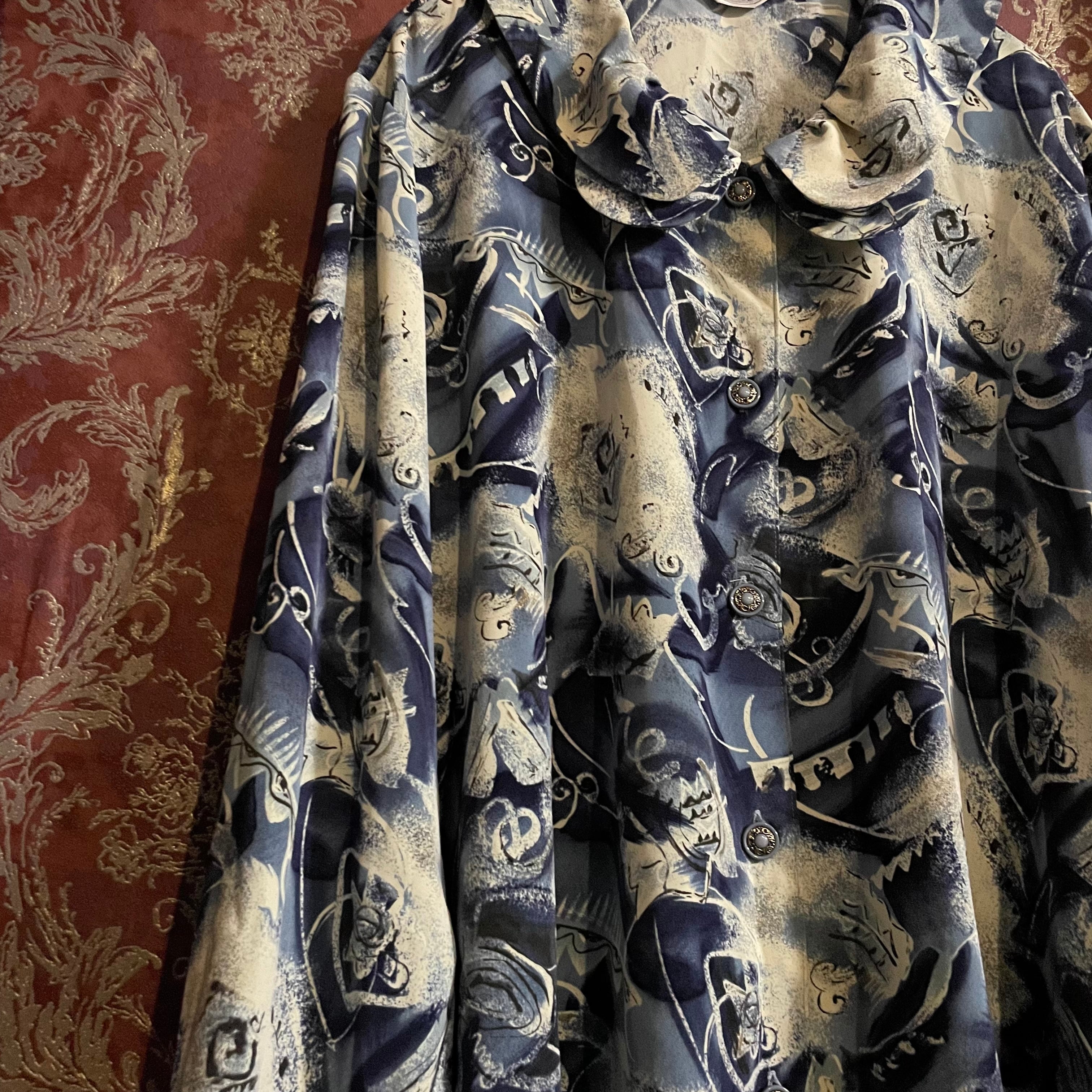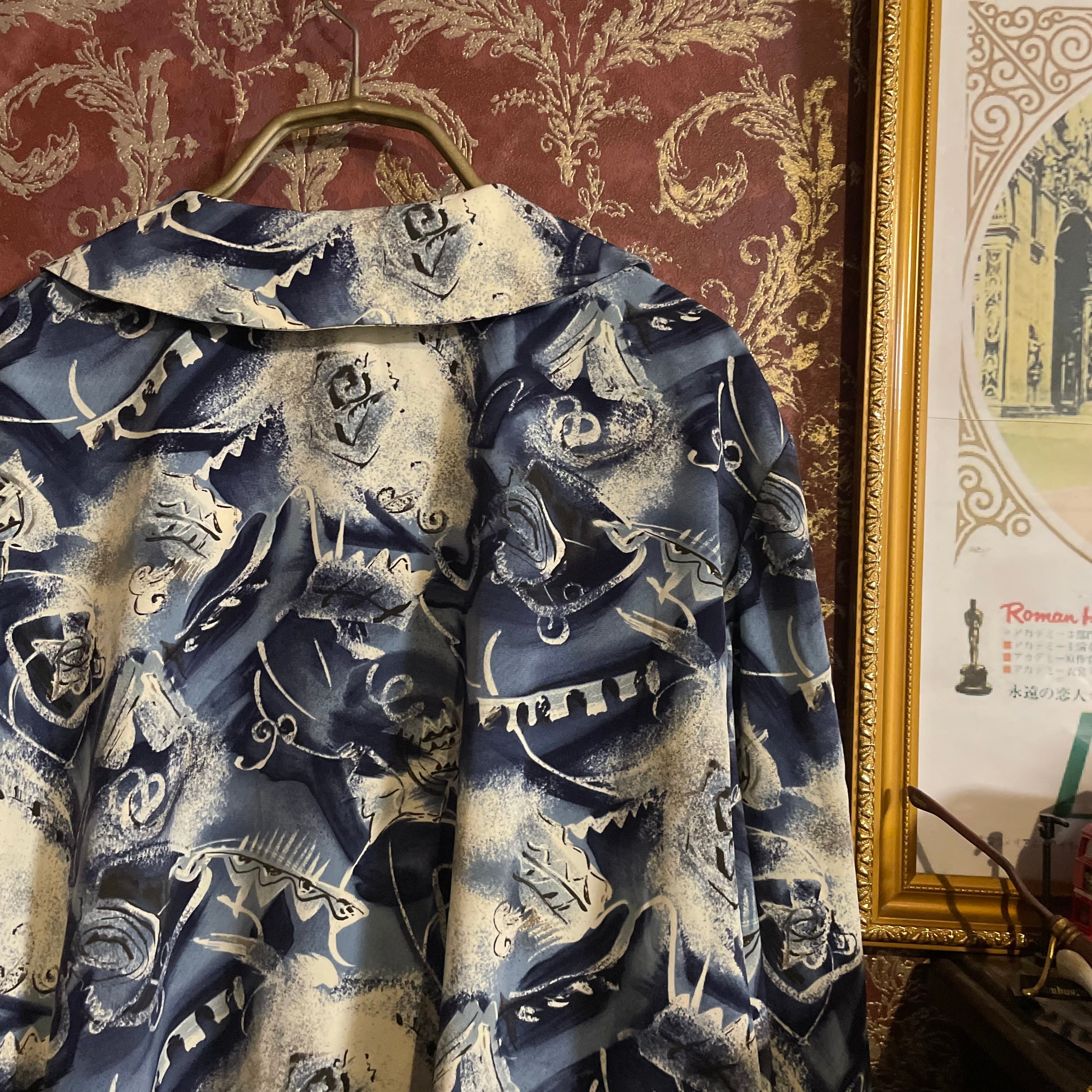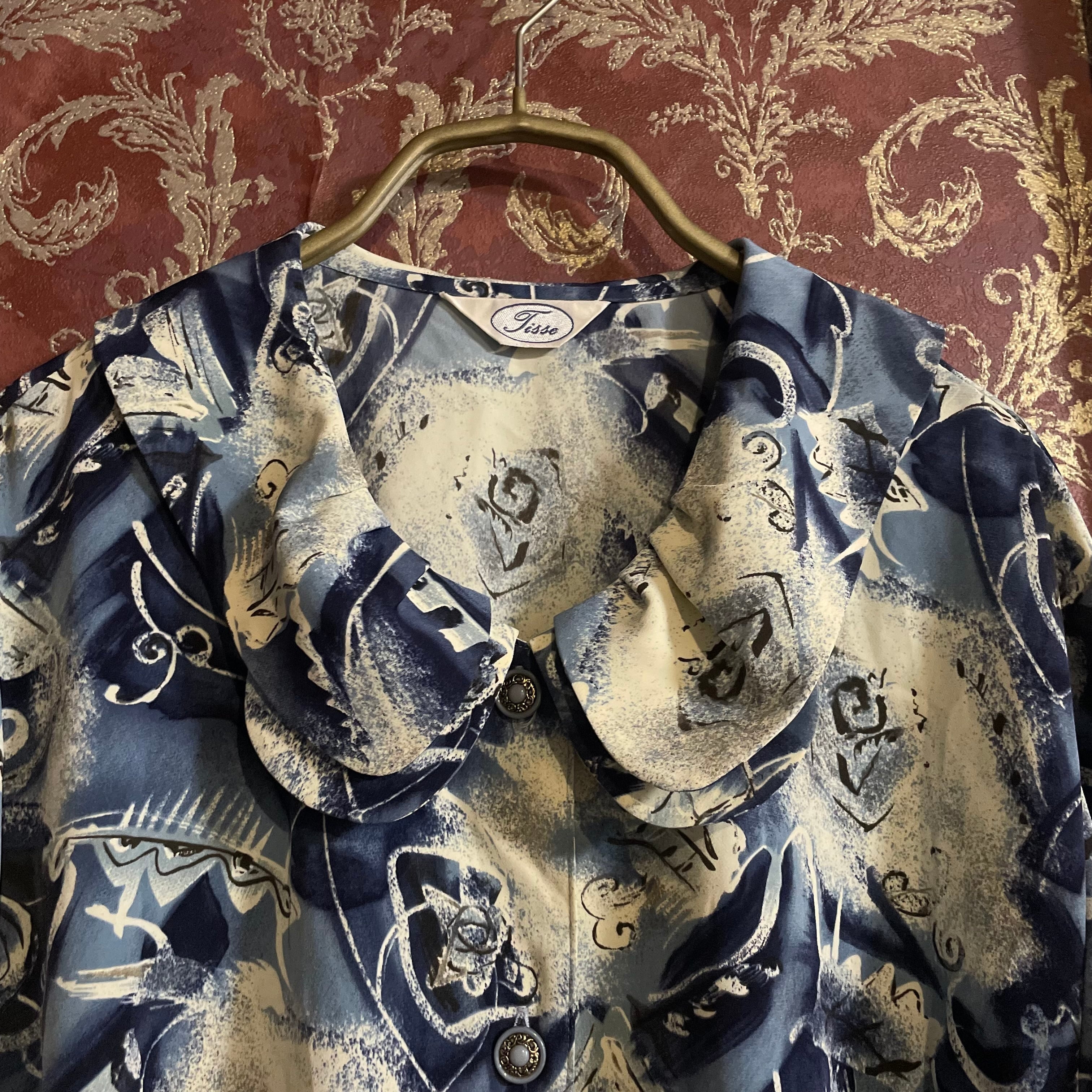 抽象的なモチーフが全面に描かれた、アート感のある総柄ブラウスです。