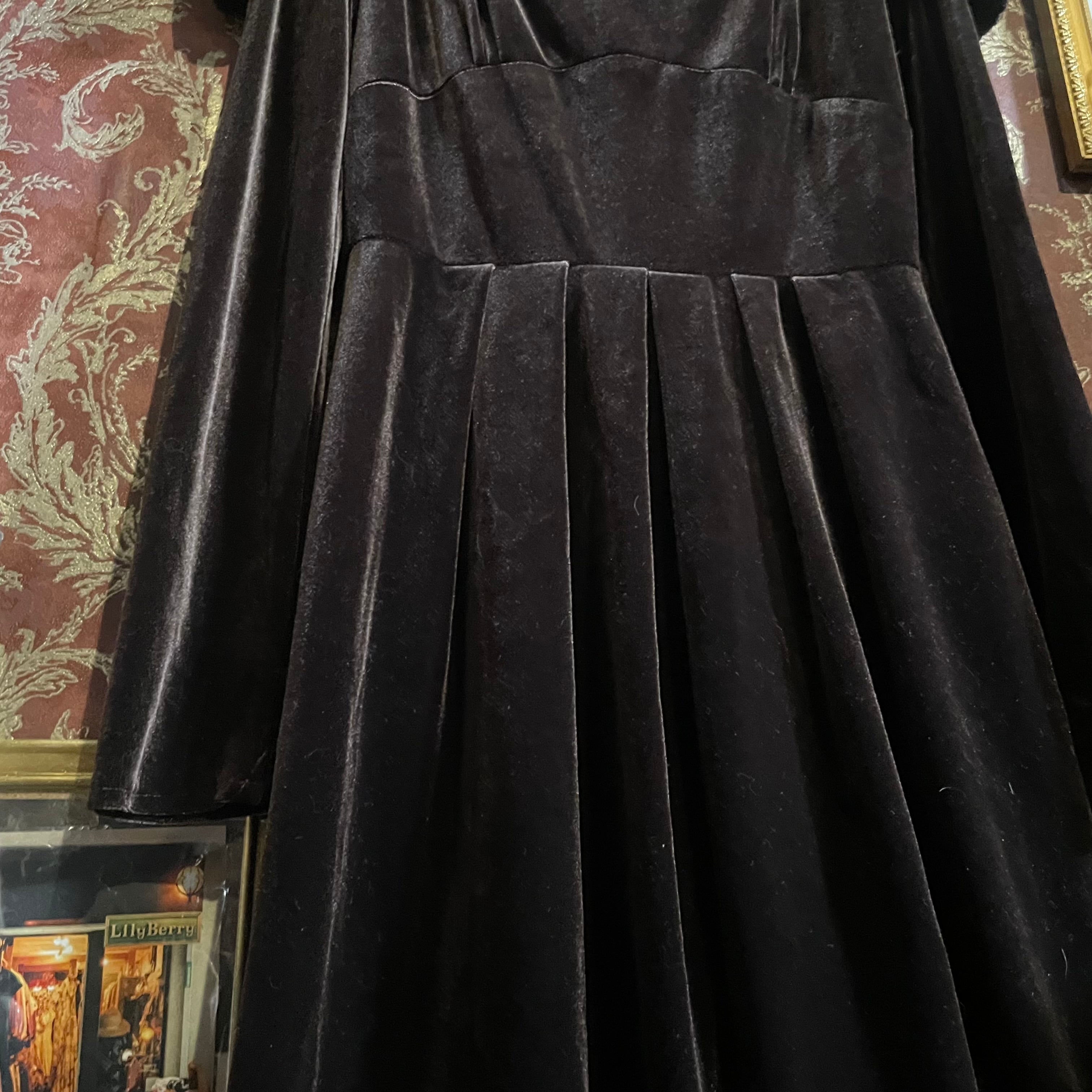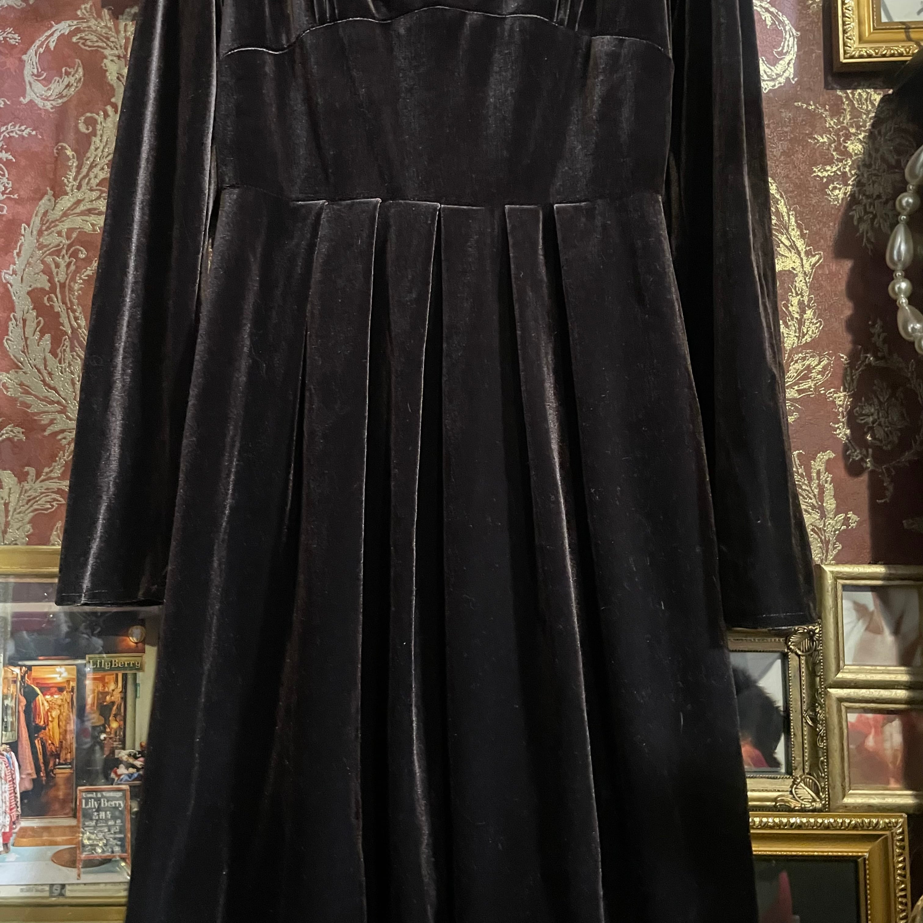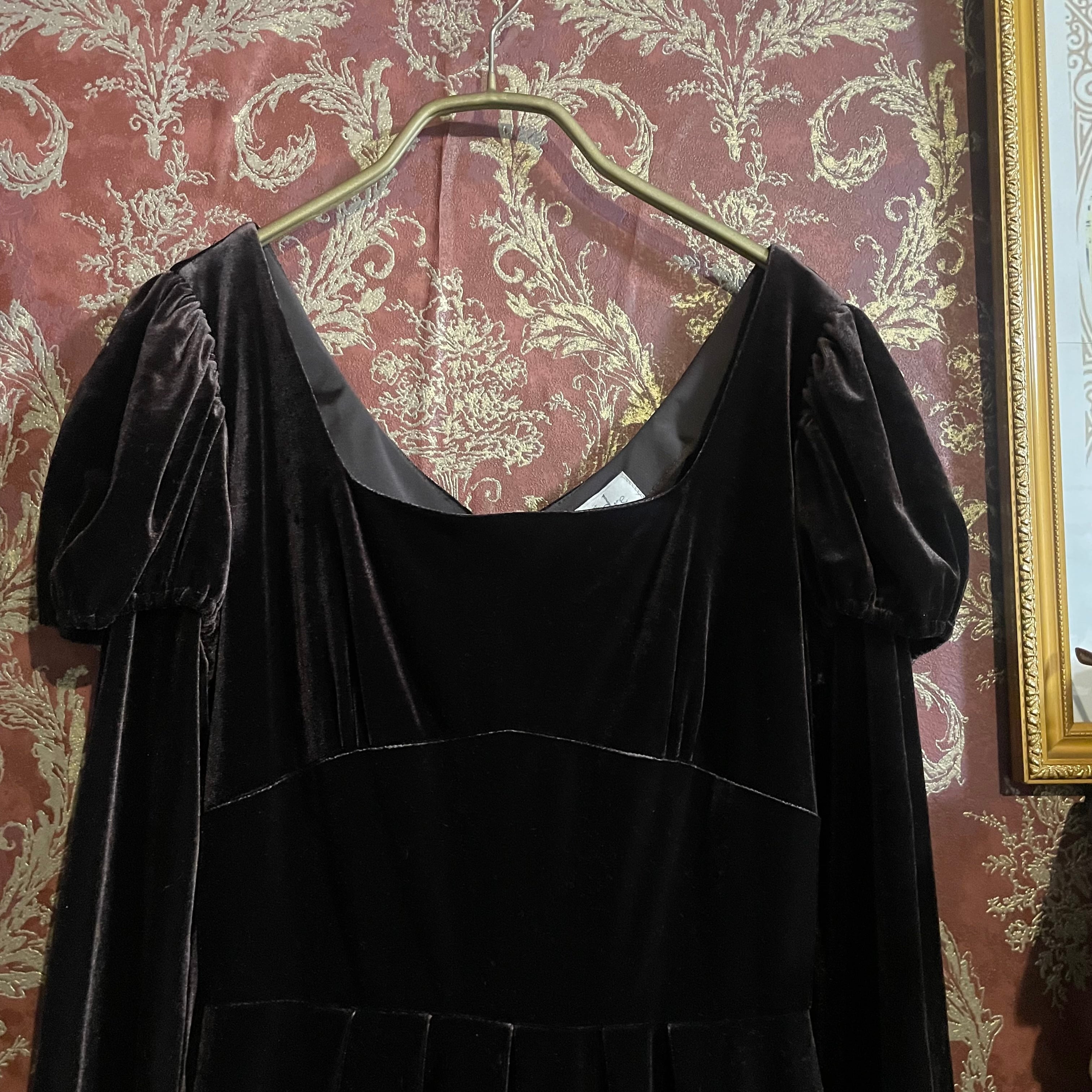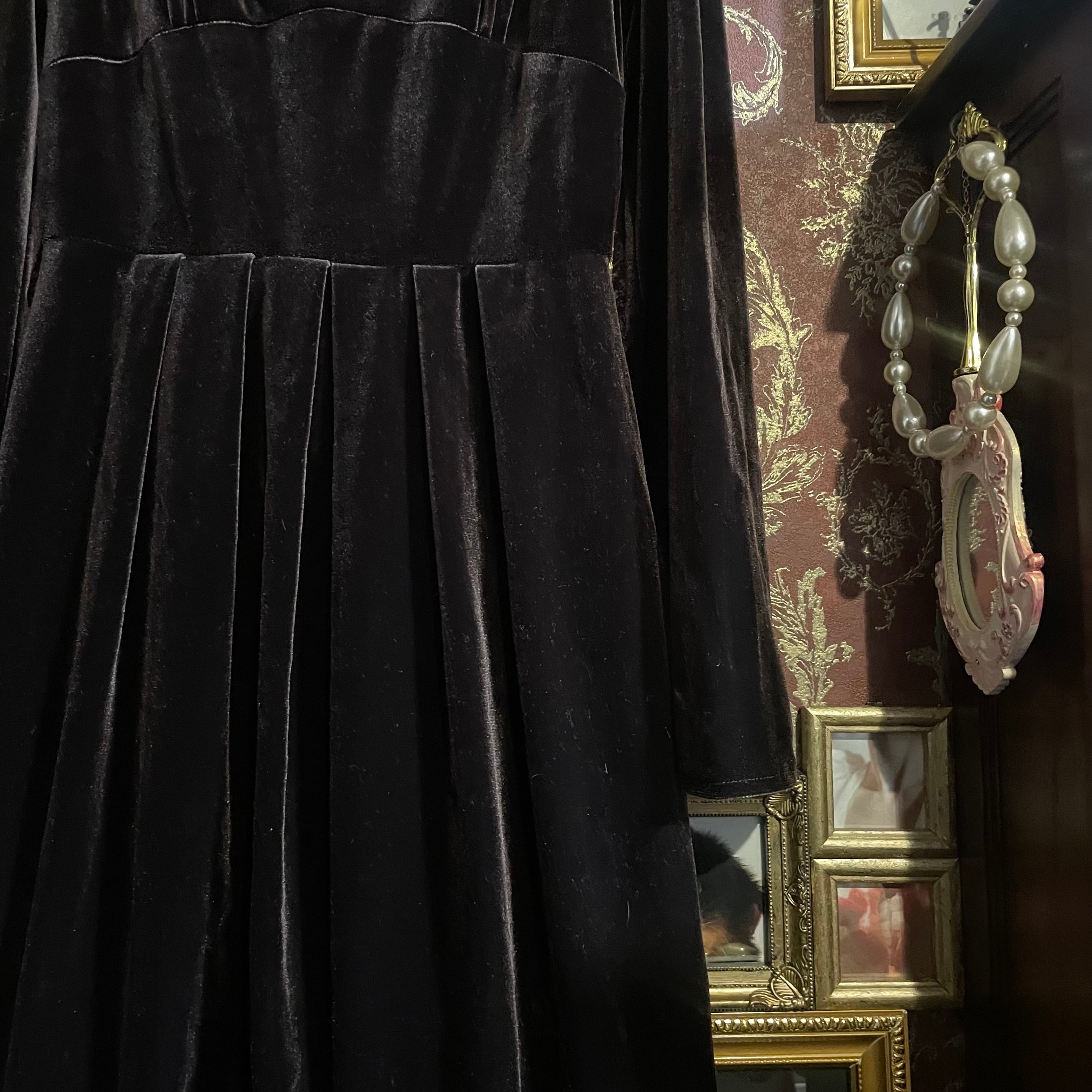 深みのあるビターチョコレートのようなダークブラウン(#1f1210)が印象的な、クラシカルなベロアワンピースです。