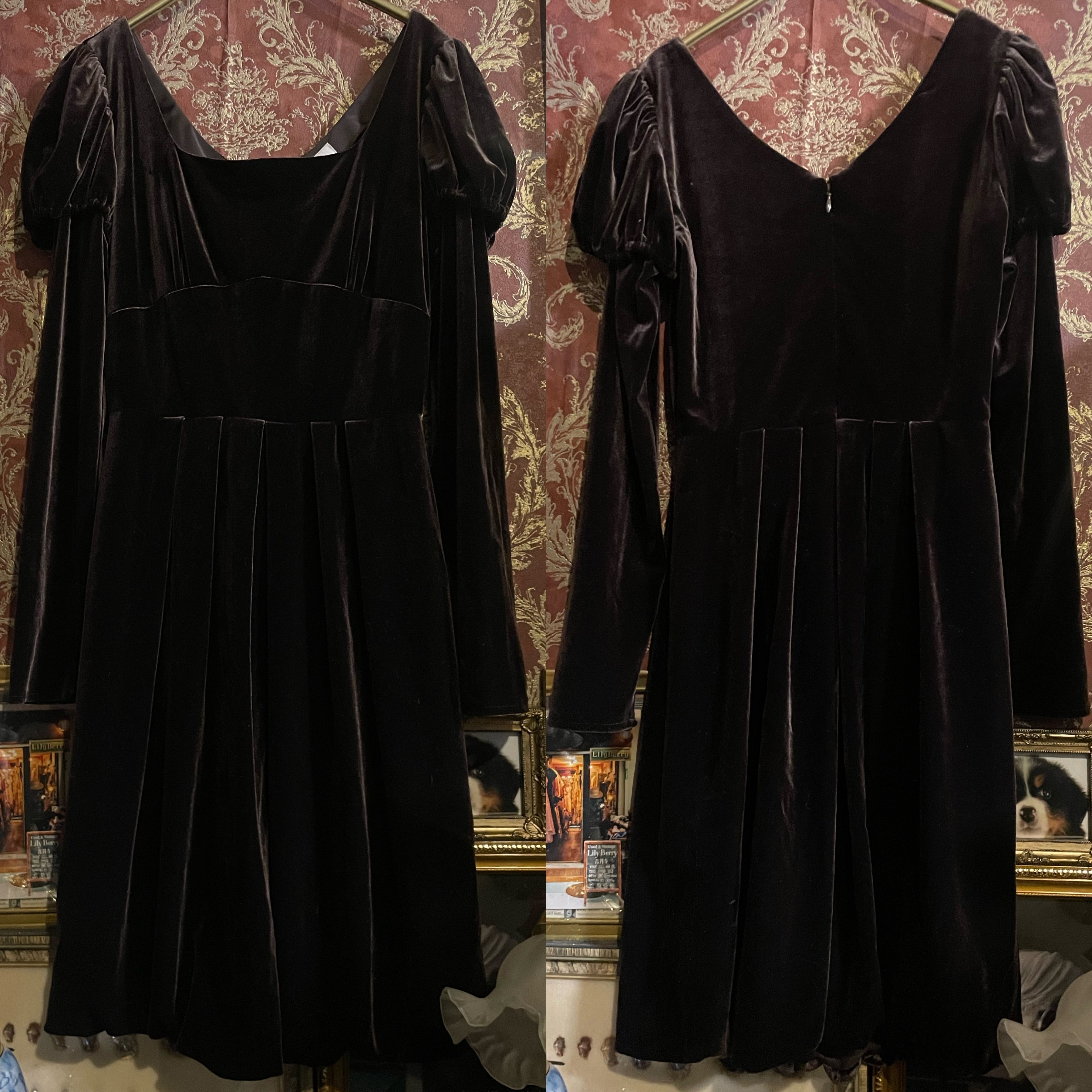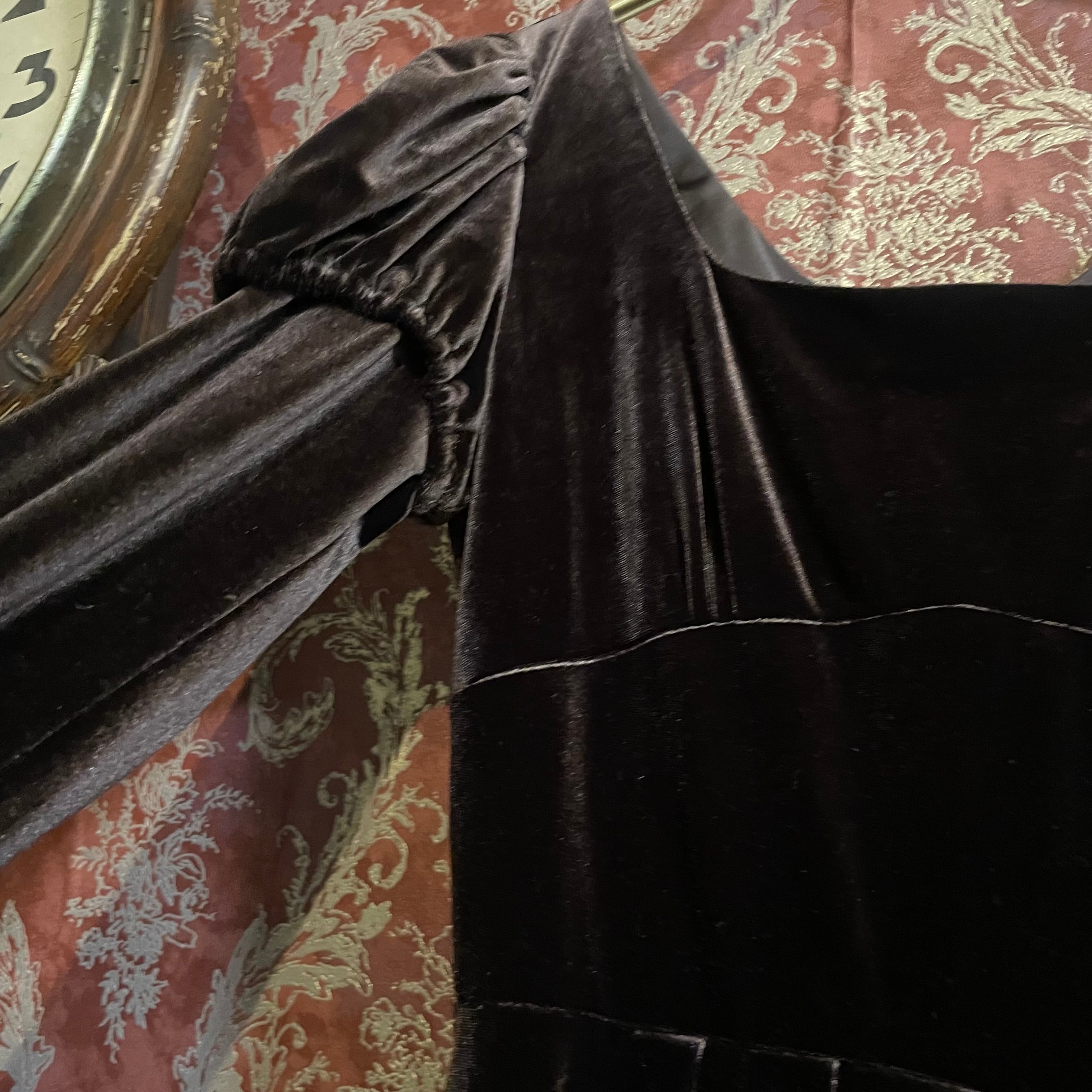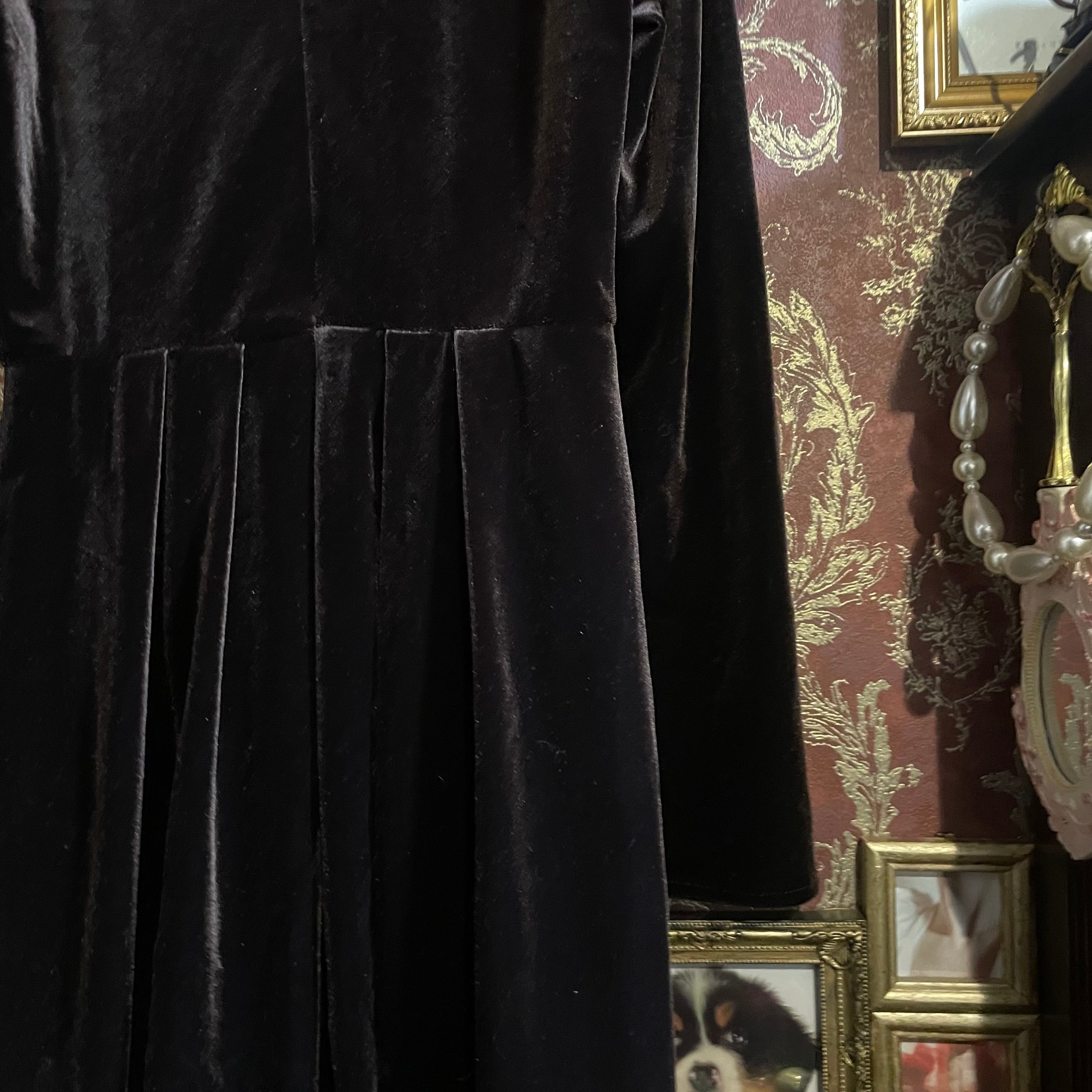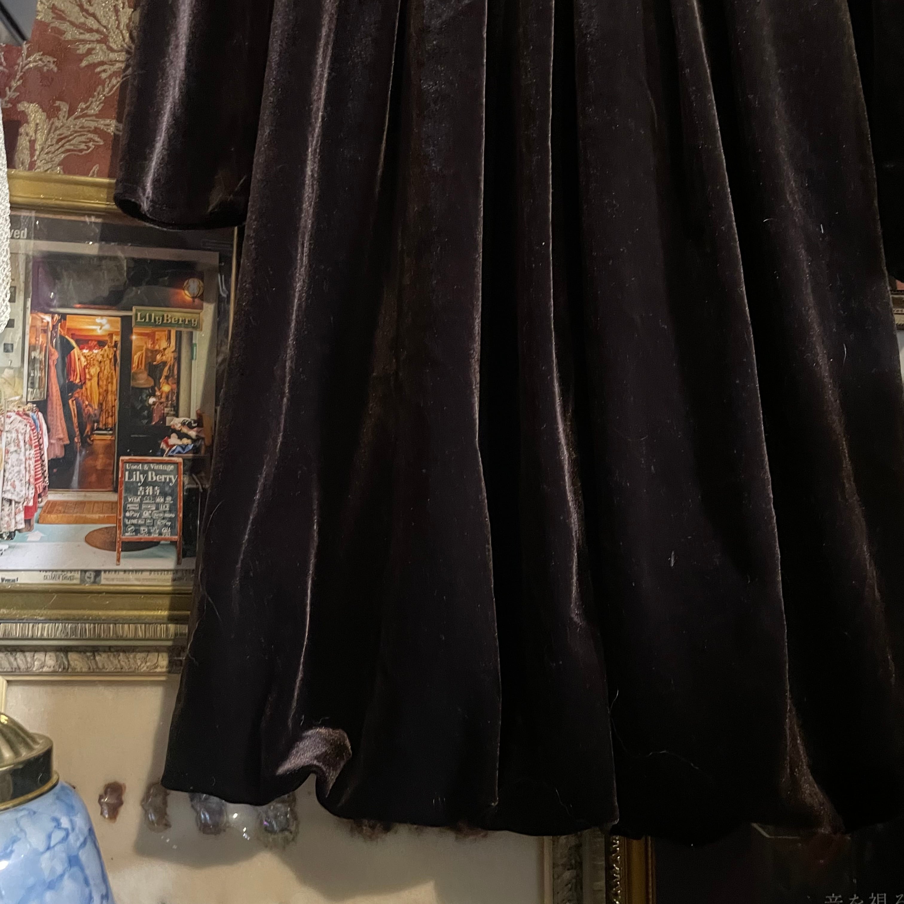 深みのあるビターチョコレートのようなダークブラウン(#1f1210)が印象的な、クラシカルなベロアワンピースです。