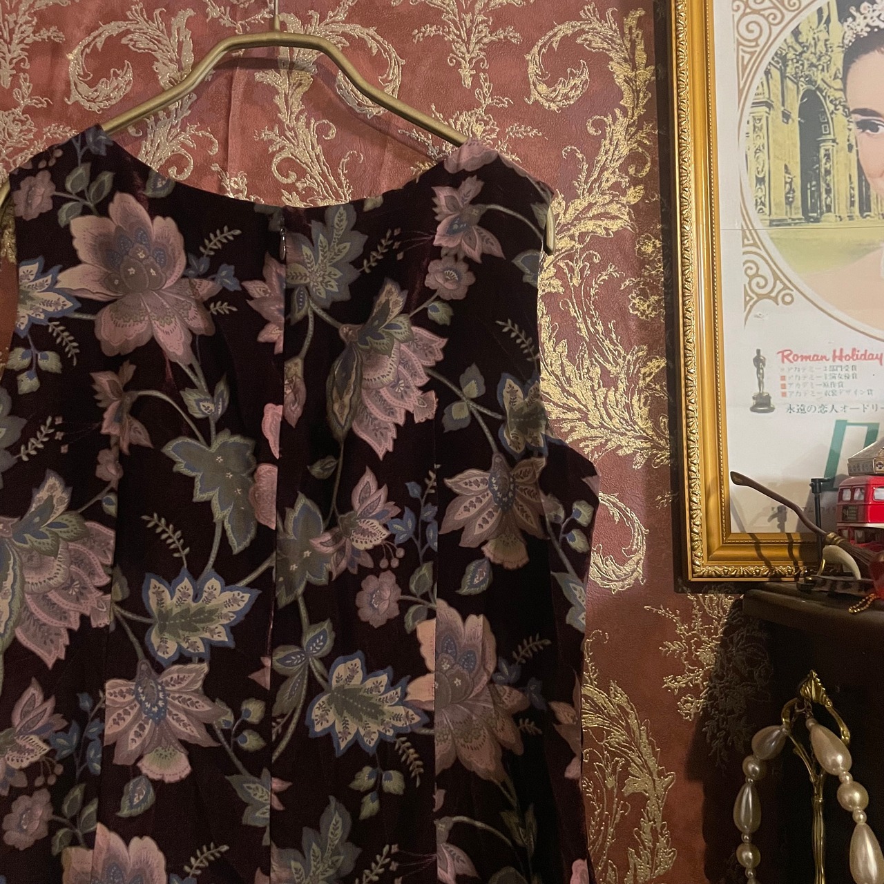 深みのあるダークブラウン(#241215)をベースに、繊細なフラワーモチーフが浮かび上がる、クラシカルなワンピースです。