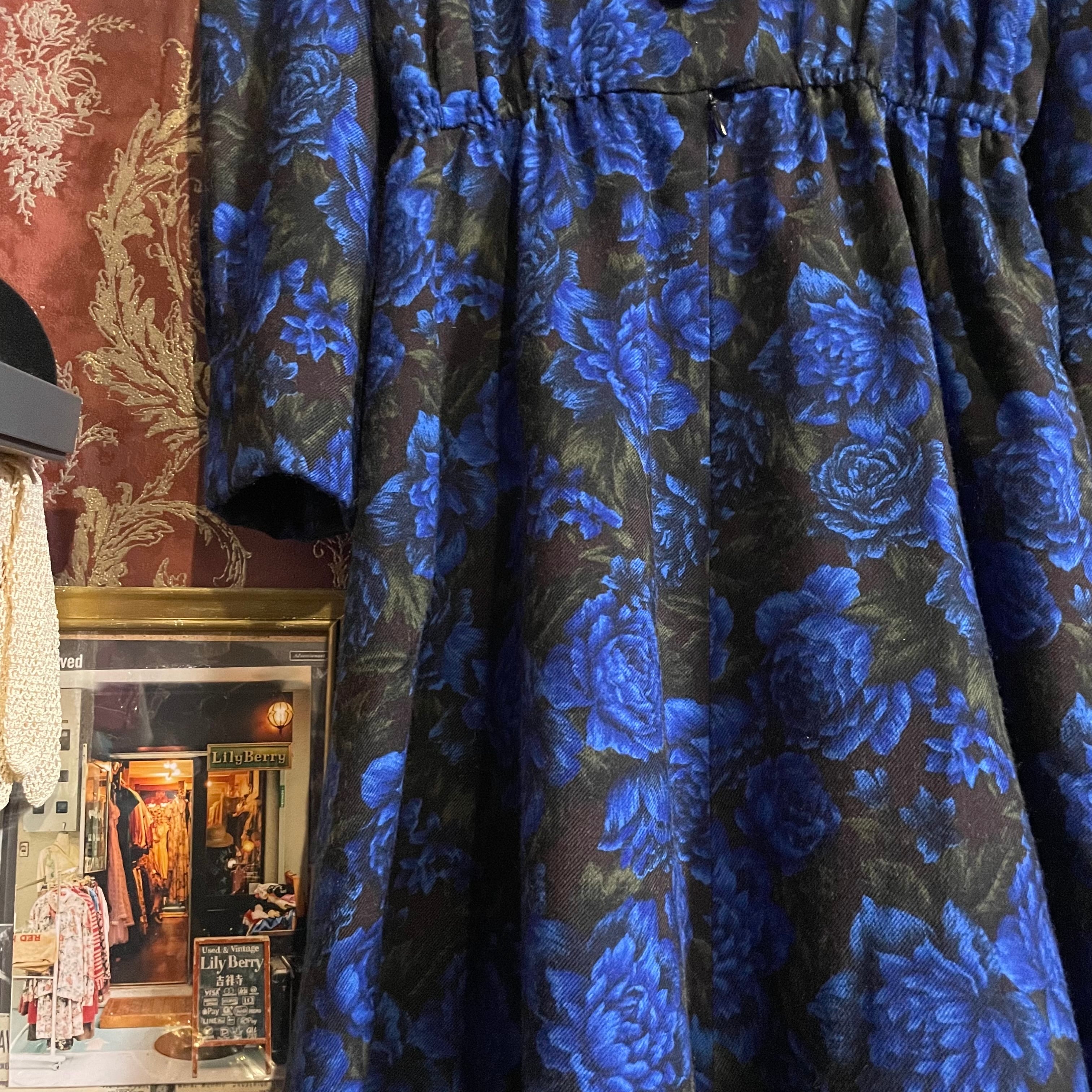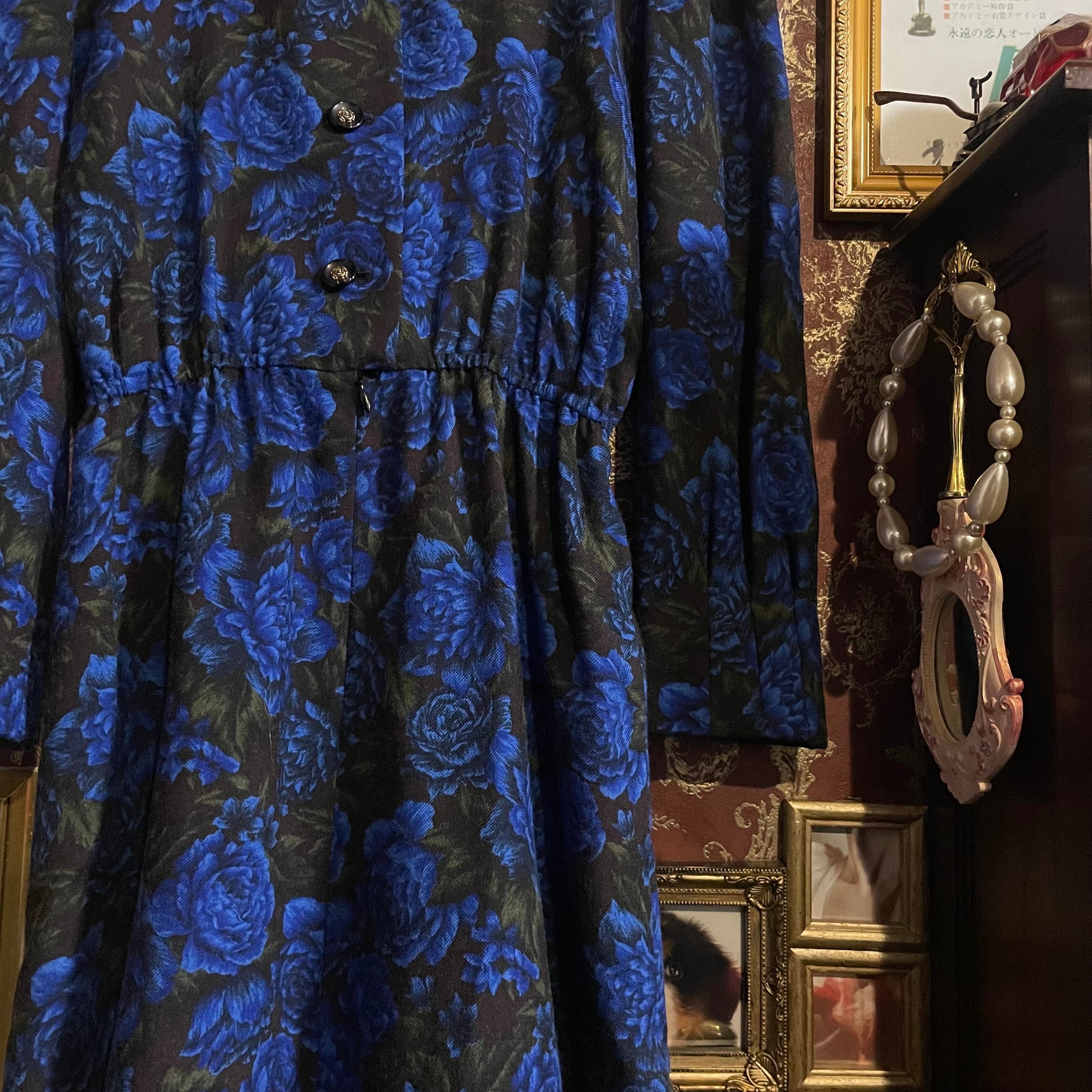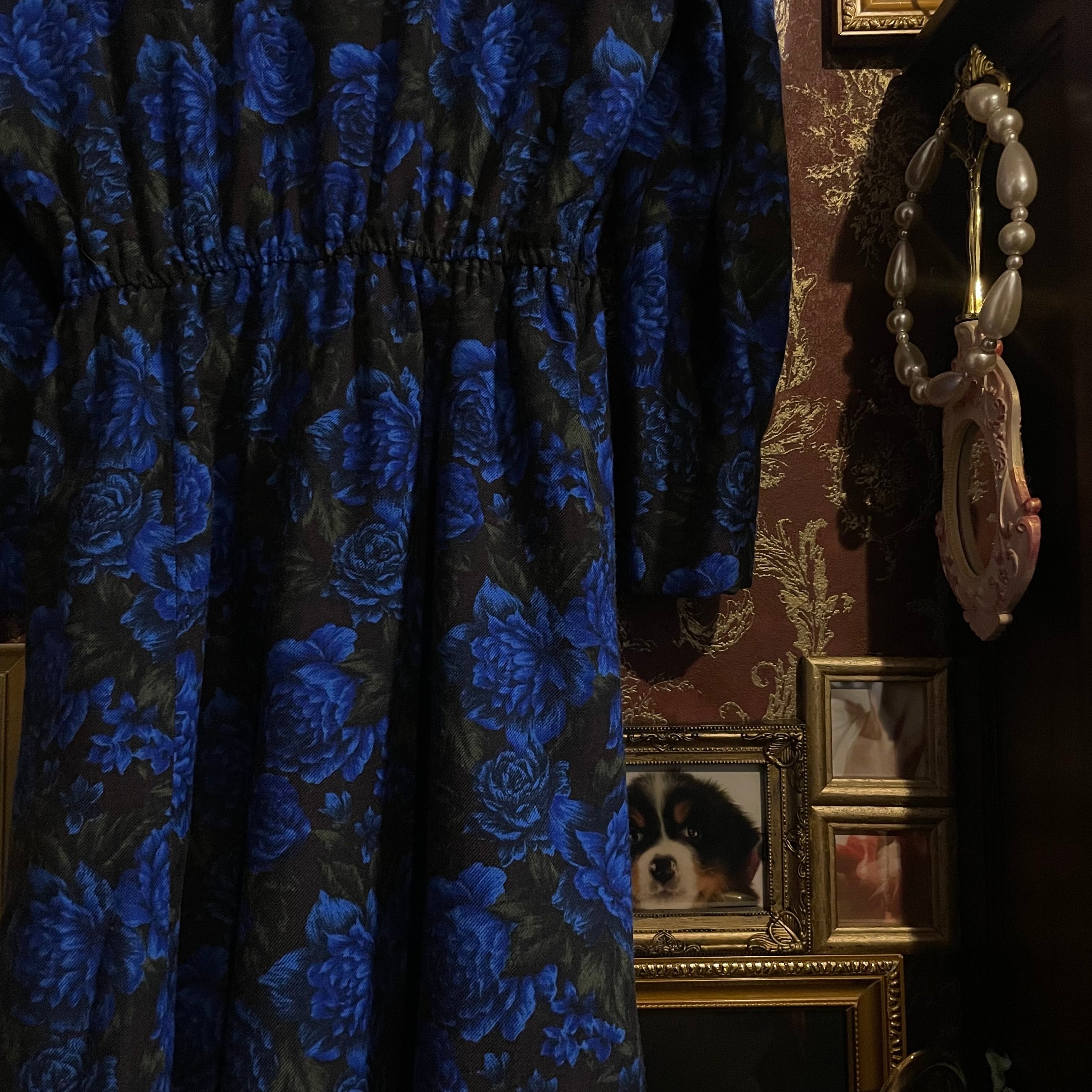 ブラックをベースに、深く鮮やかなブルーローズが全面に咲き誇る、存在感のあるロングワンピースです。