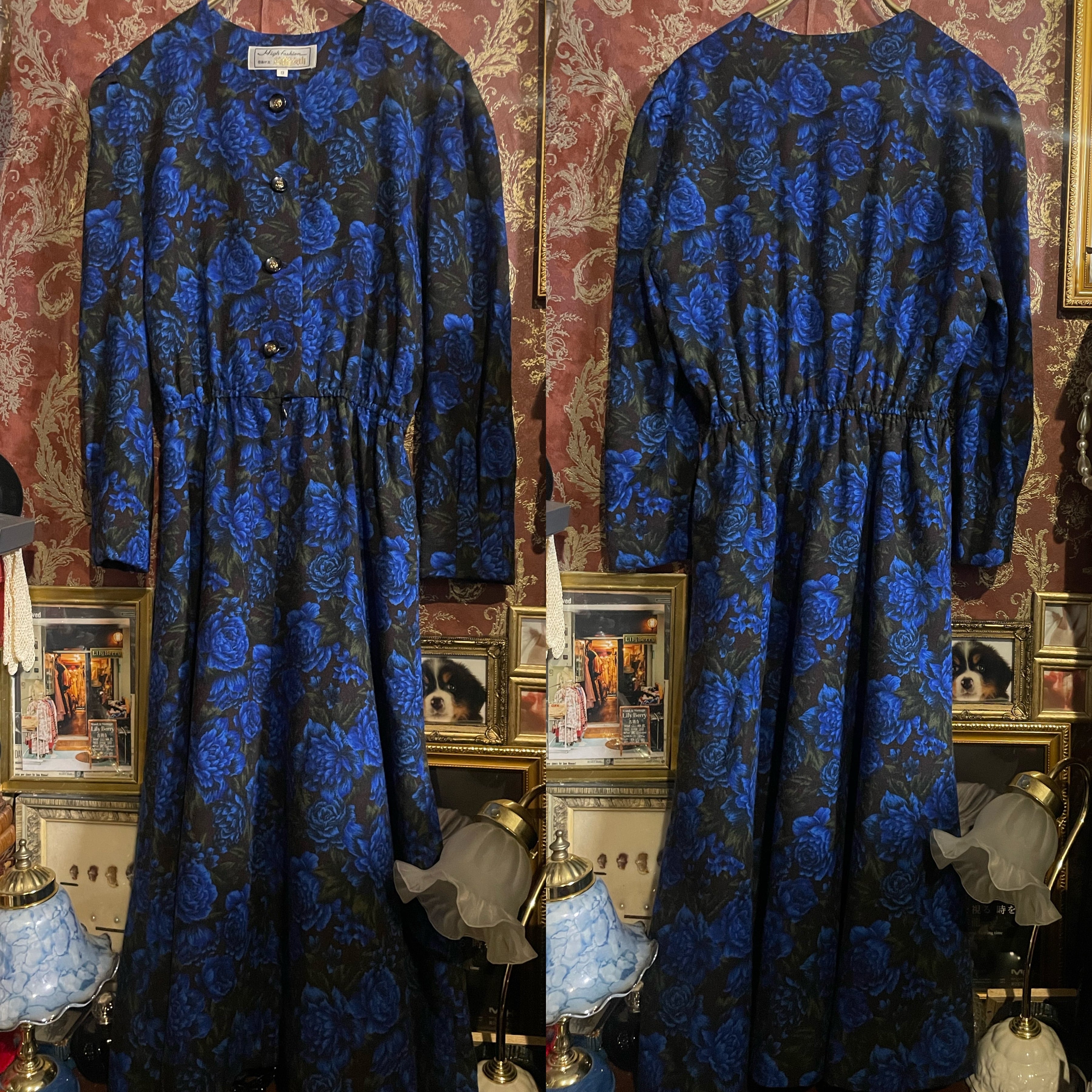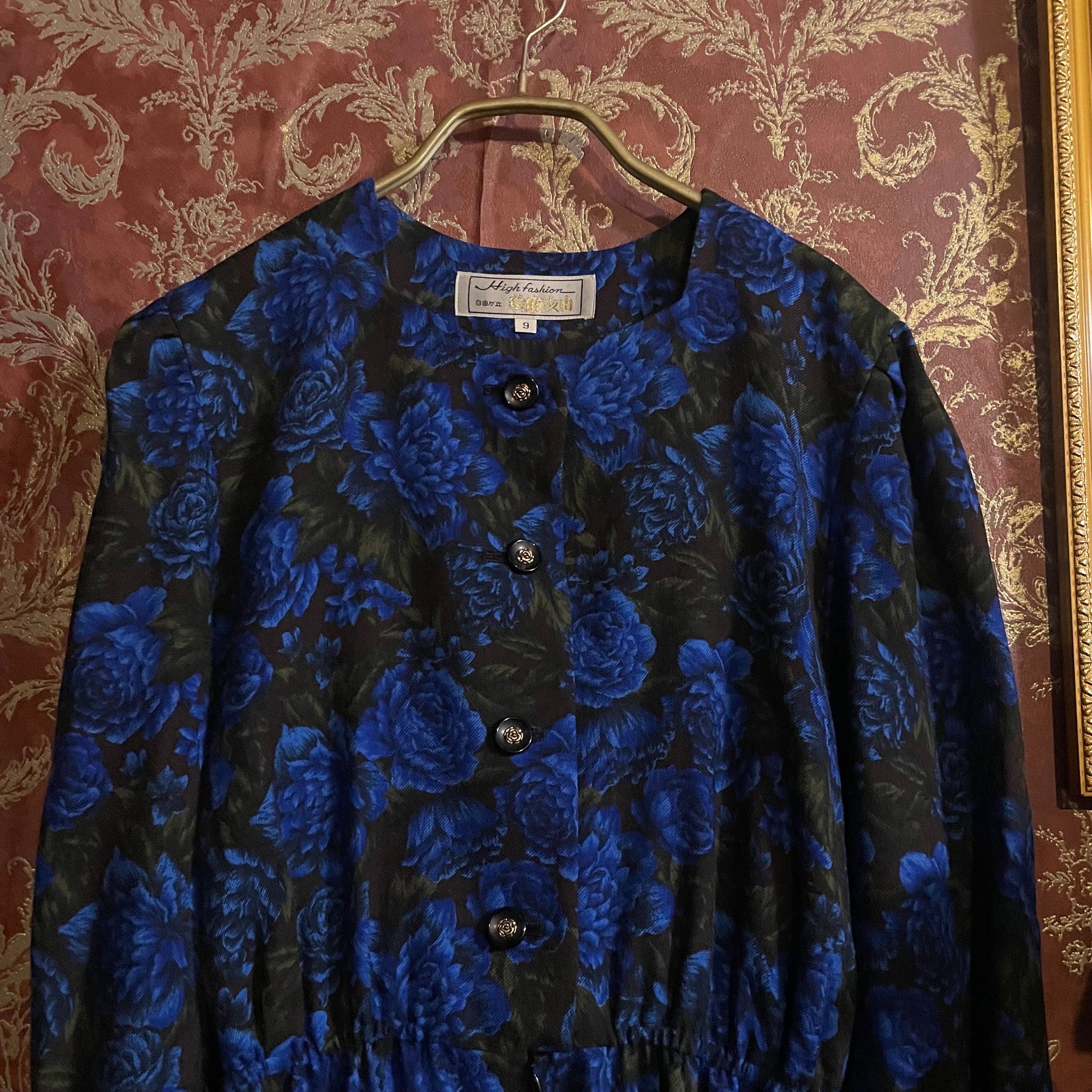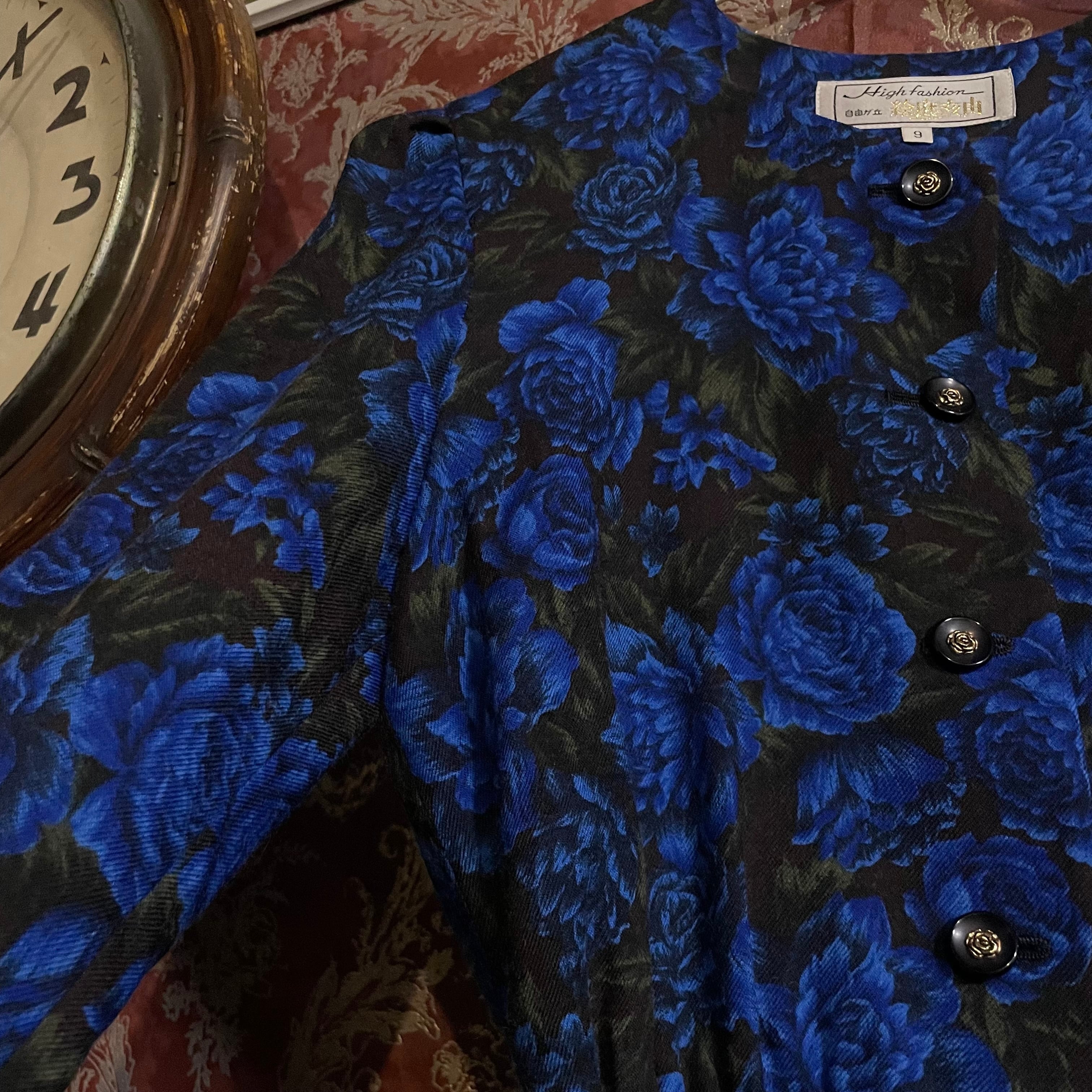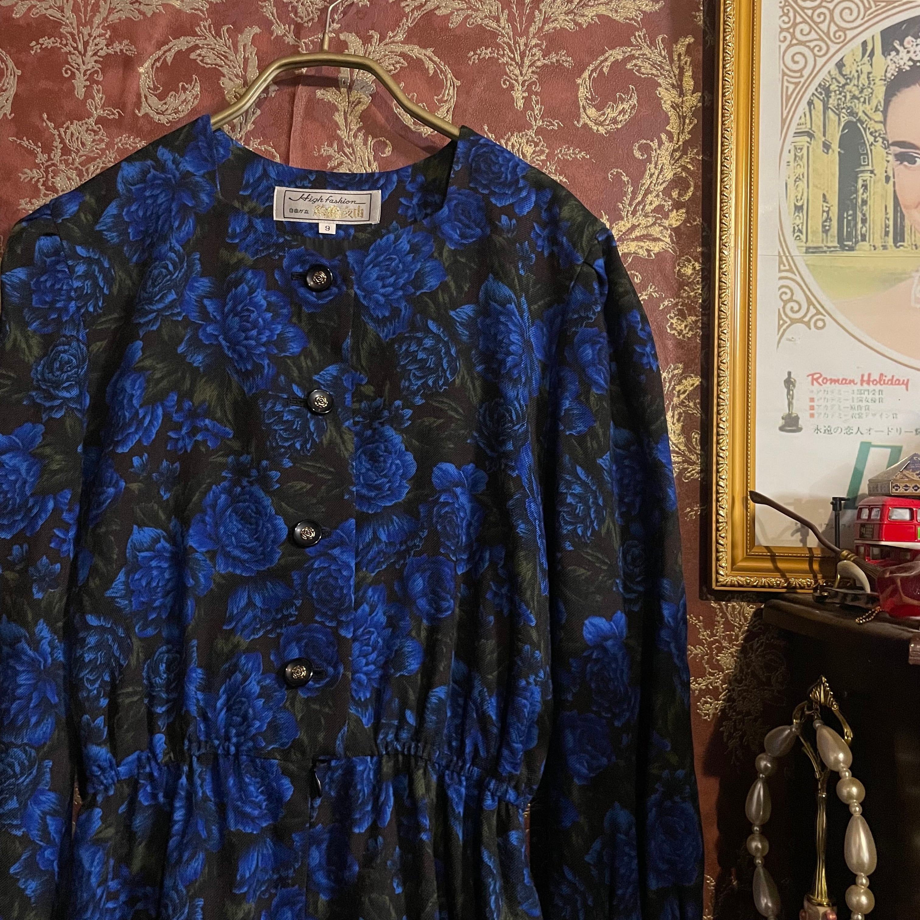 ブラックをベースに、深く鮮やかなブルーローズが全面に咲き誇る、存在感のあるロングワンピースです。