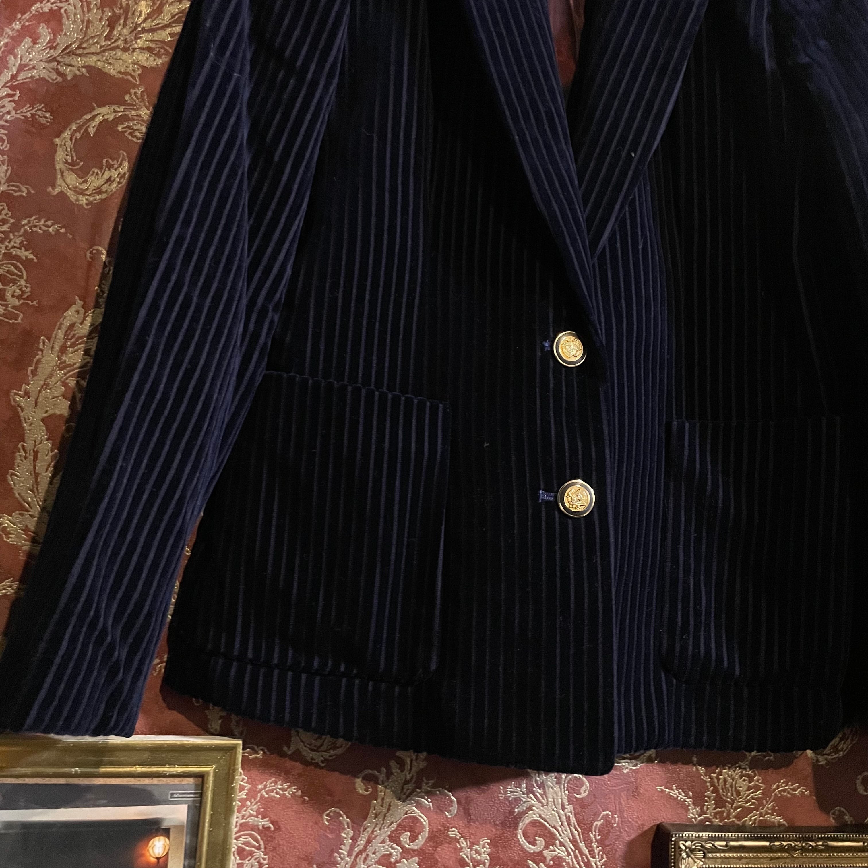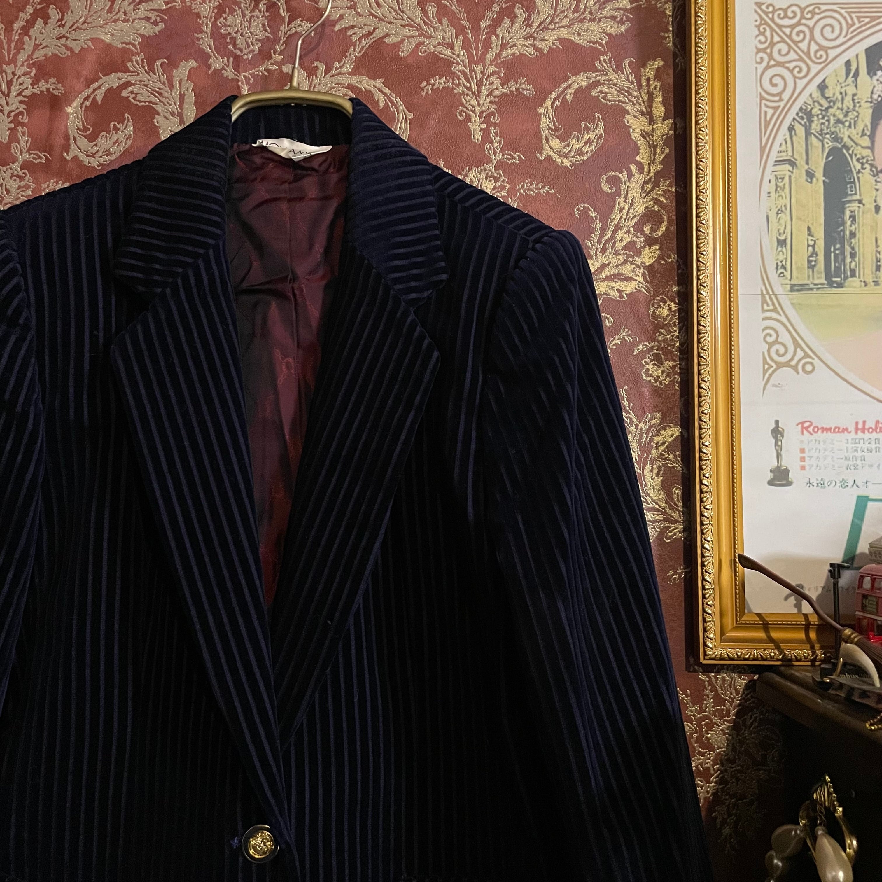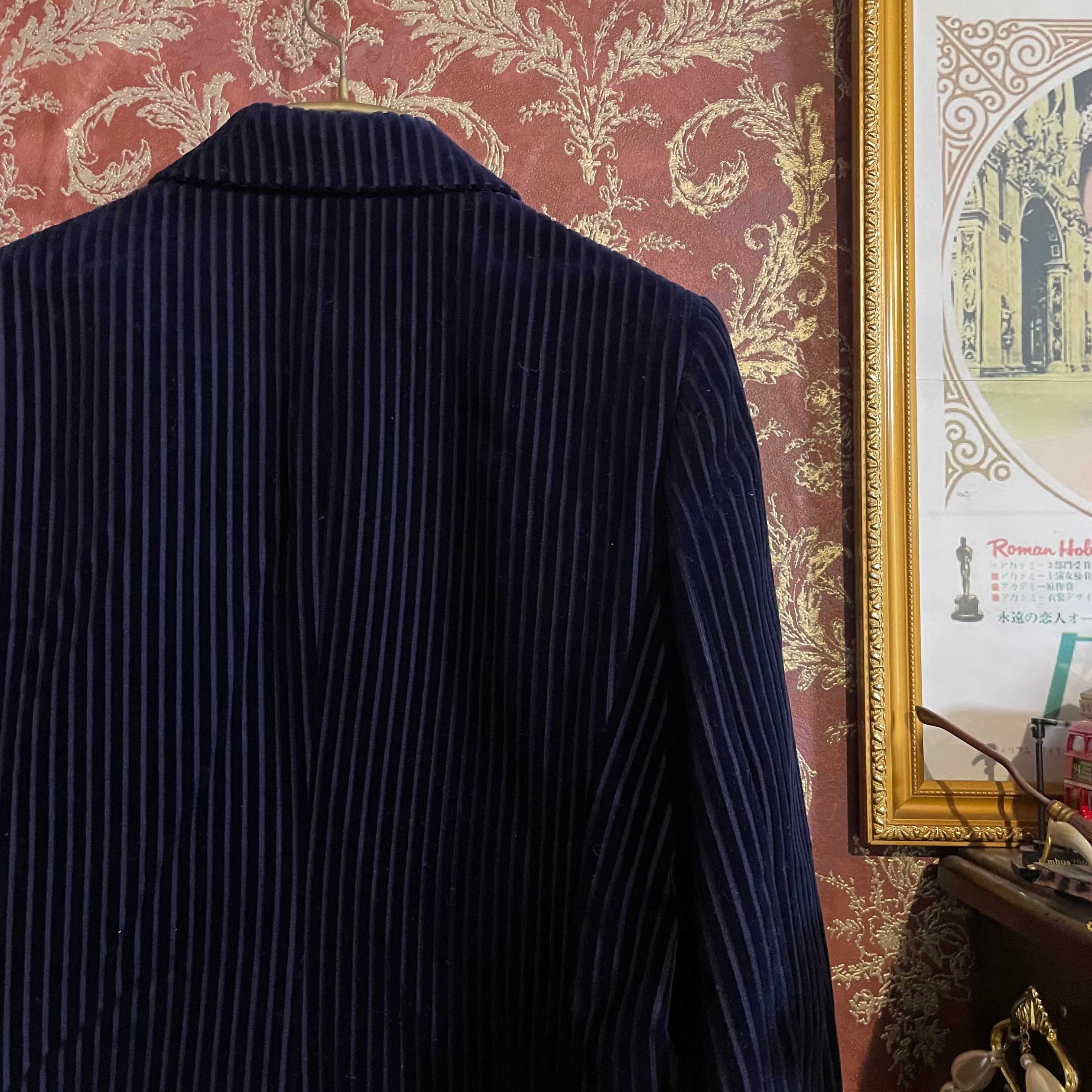 深みのあるダークネイビーに、繊細な縦ストライプが浮かび上がる、上品なセットアップです。