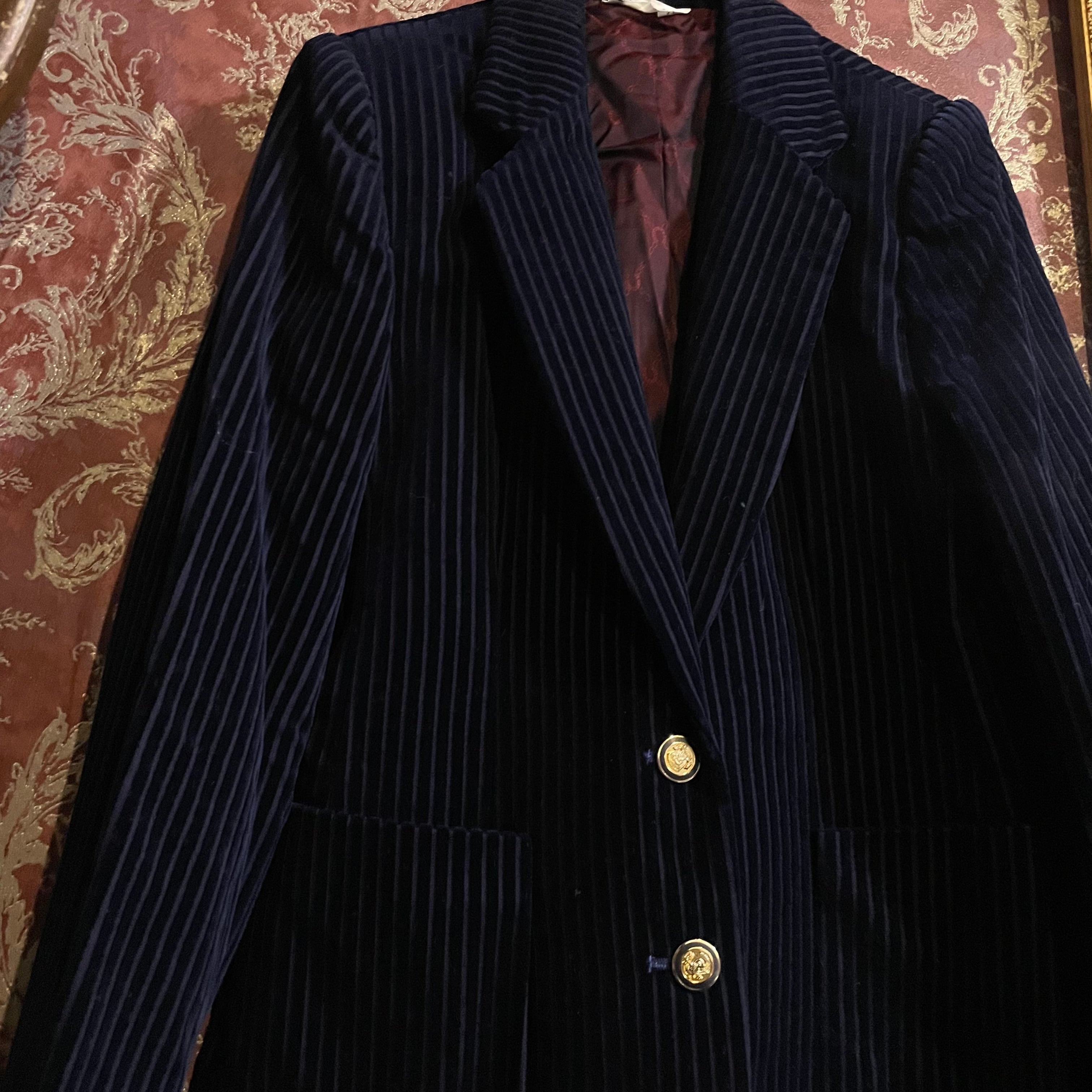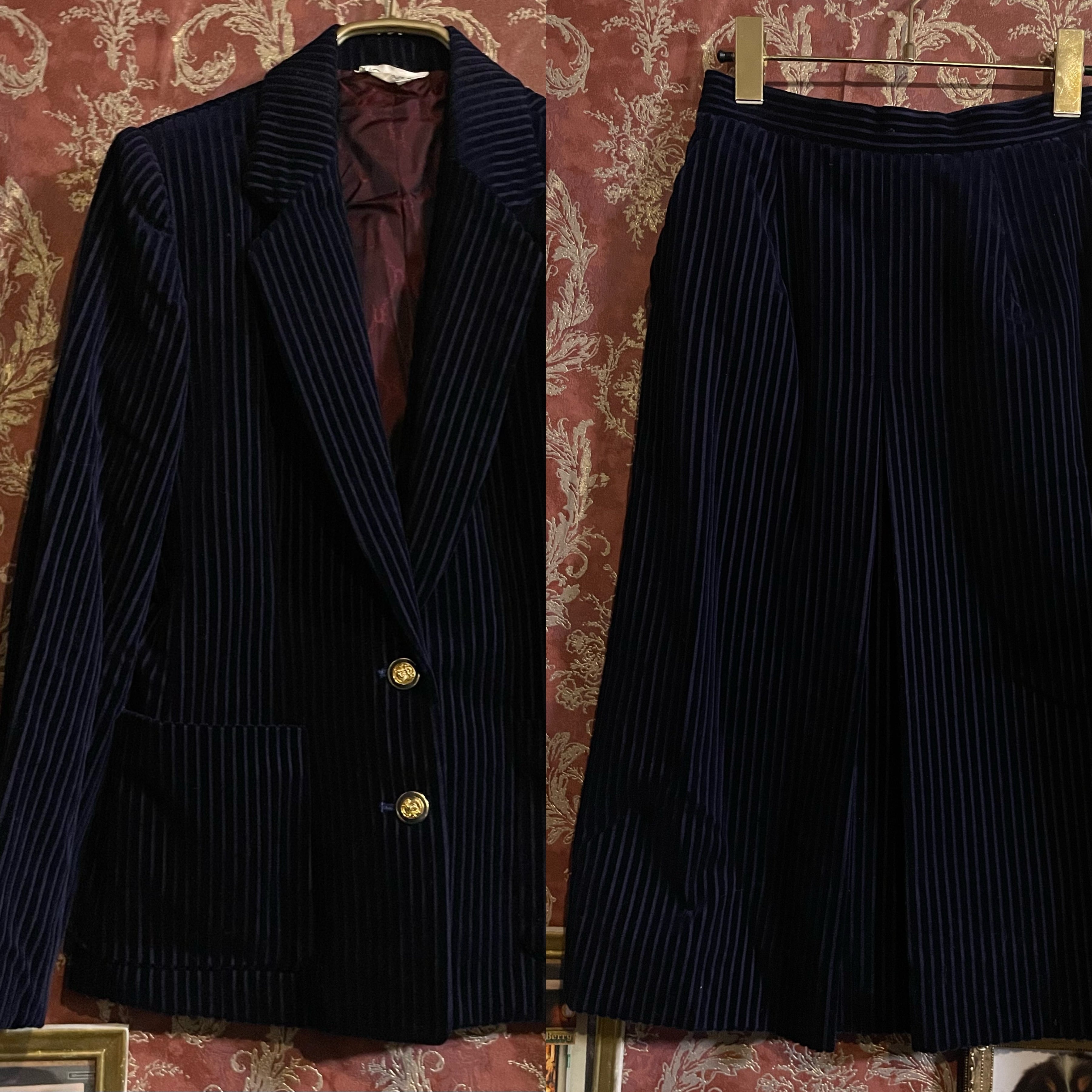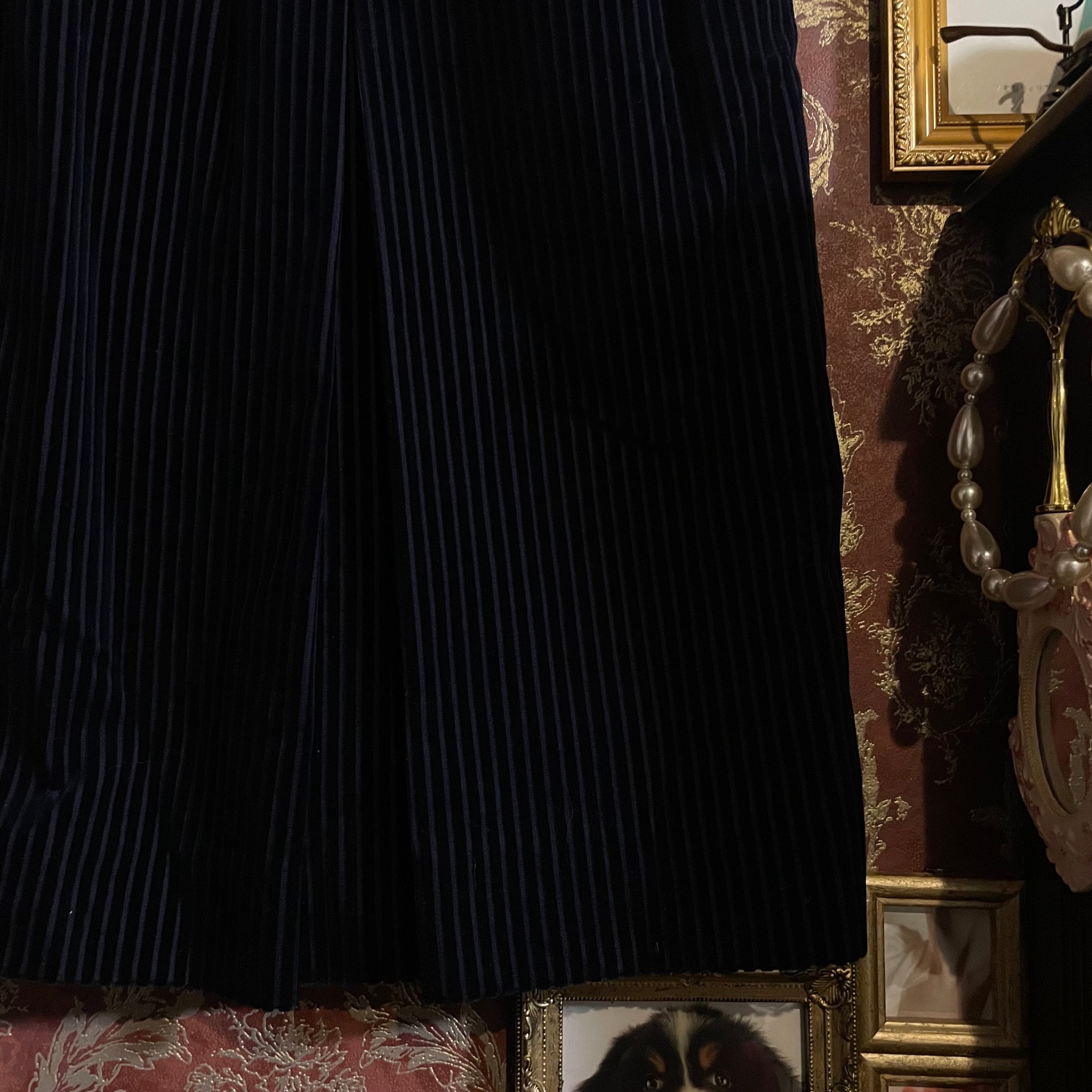 深みのあるダークネイビーに、繊細な縦ストライプが浮かび上がる、上品なセットアップです。