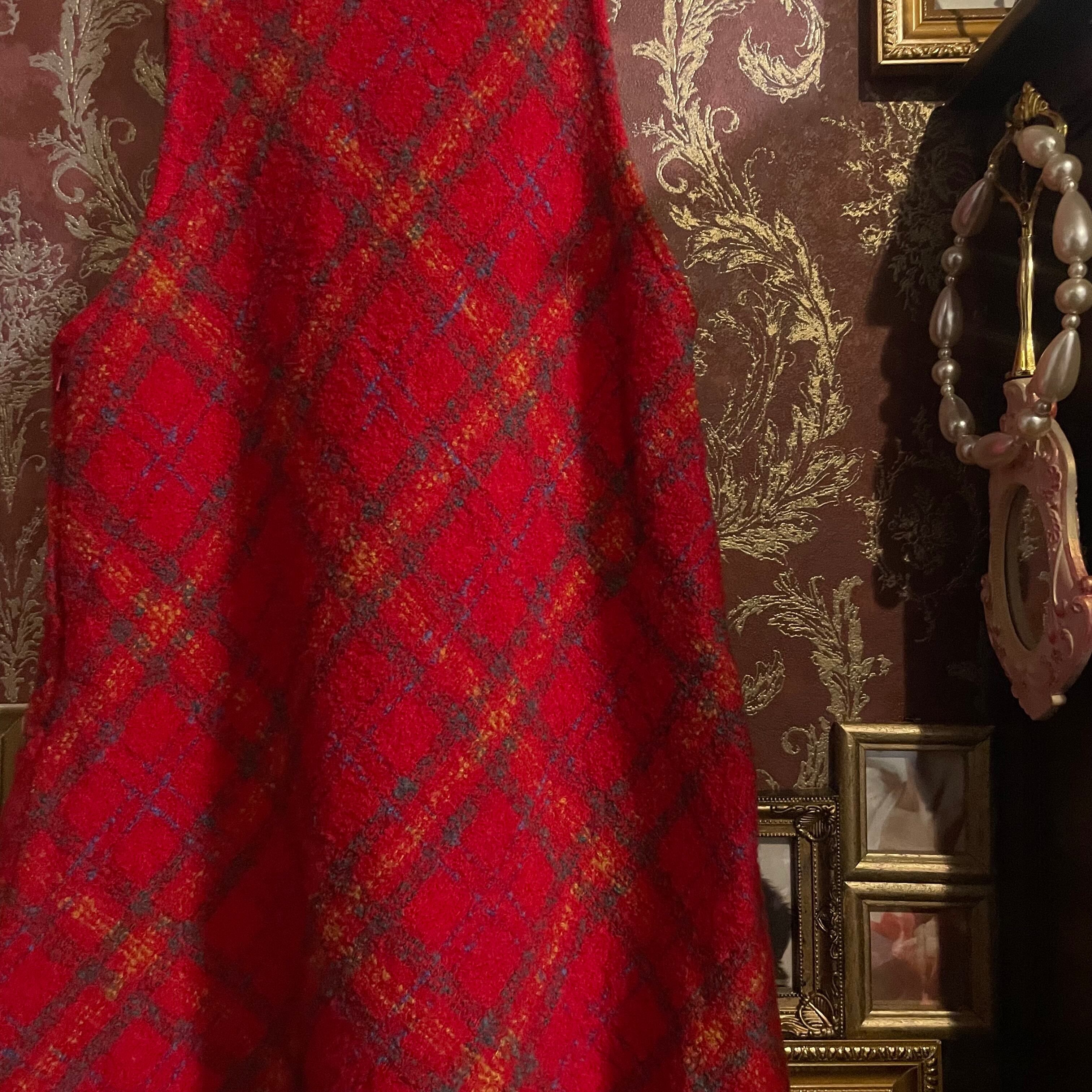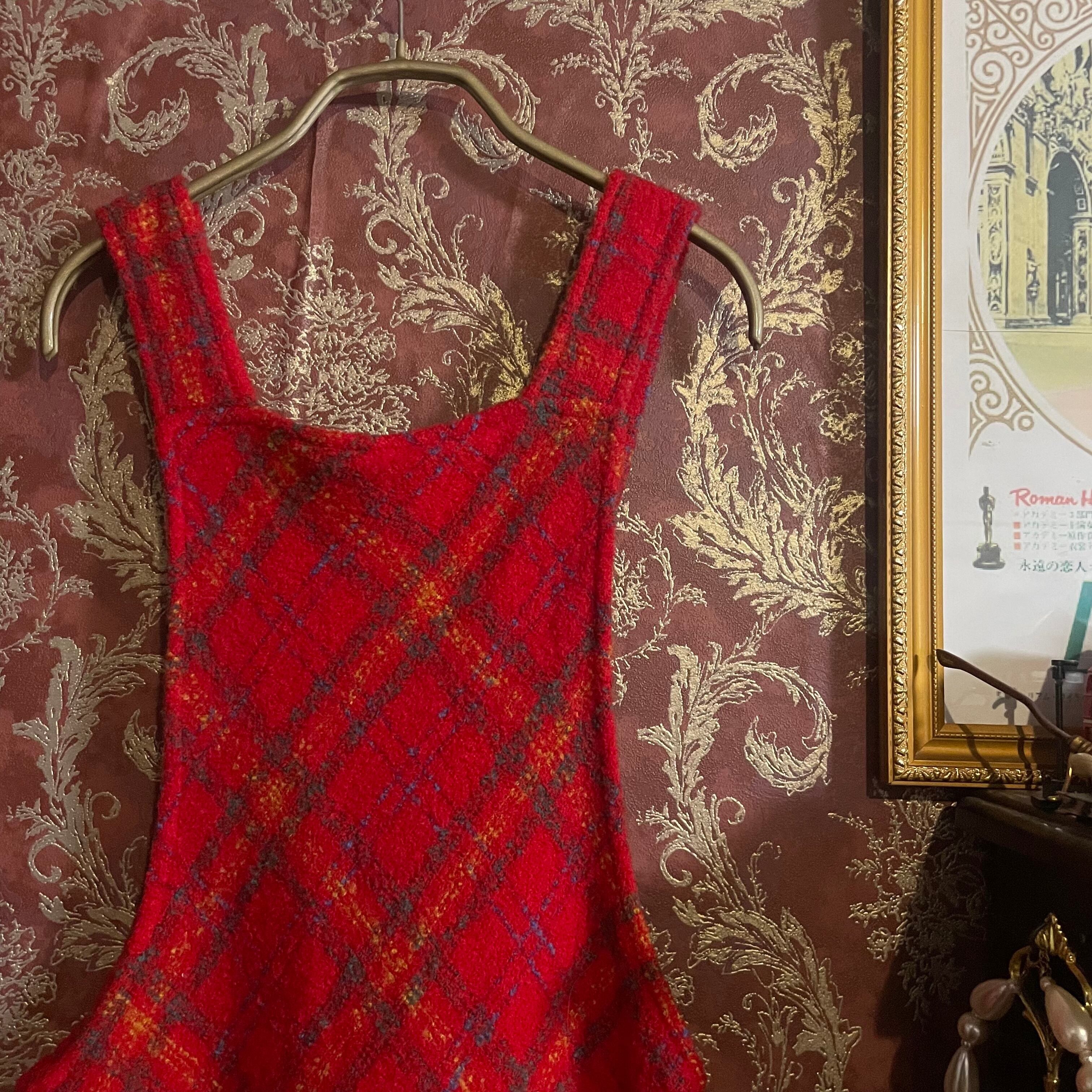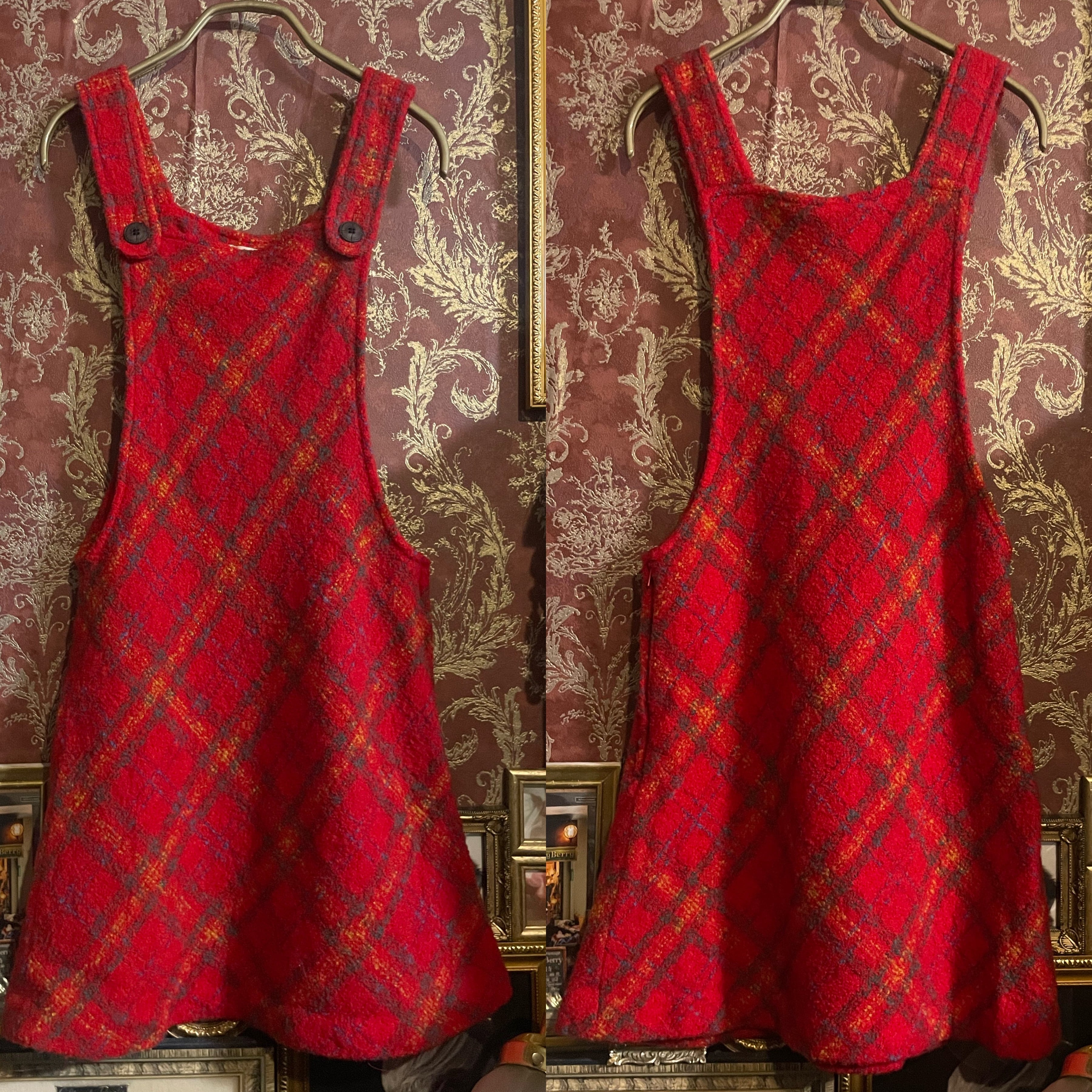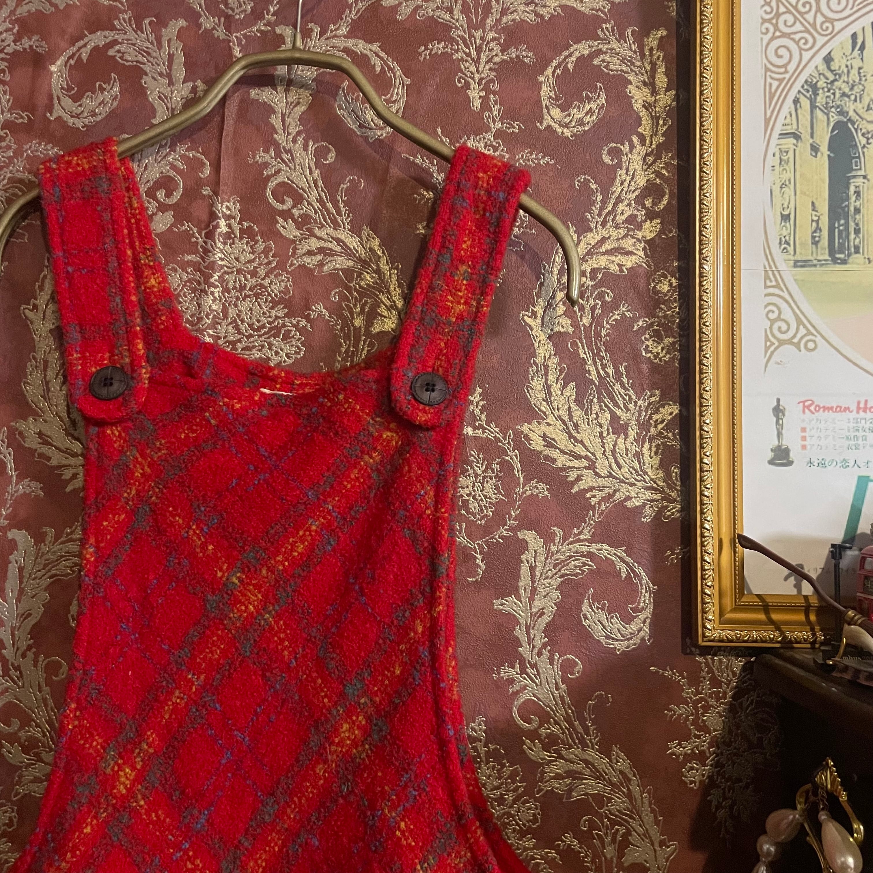 温かみのある赤をベースに、オレンジやブルーが織り交ぜられたチェック柄が印象的なジャンパースカートです。