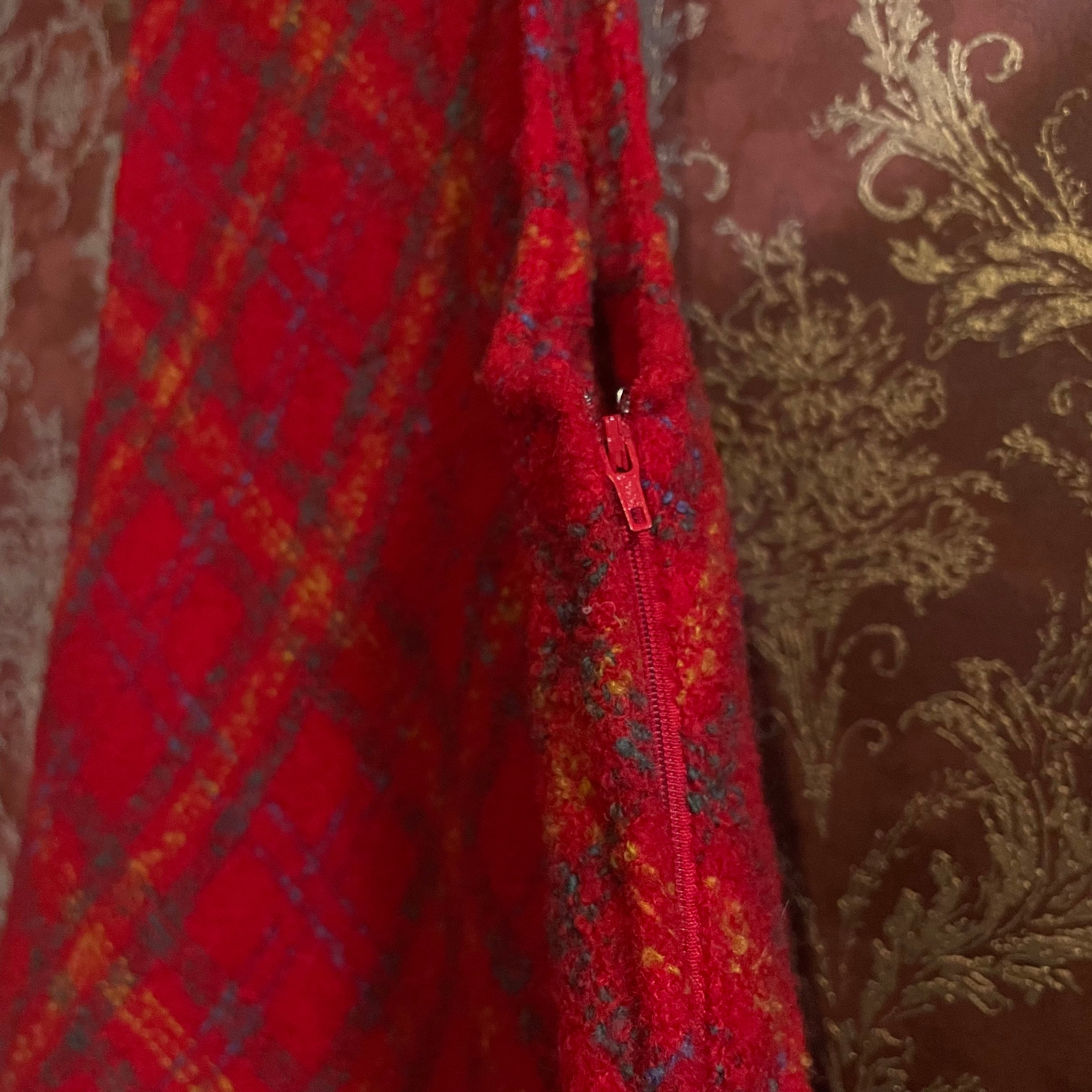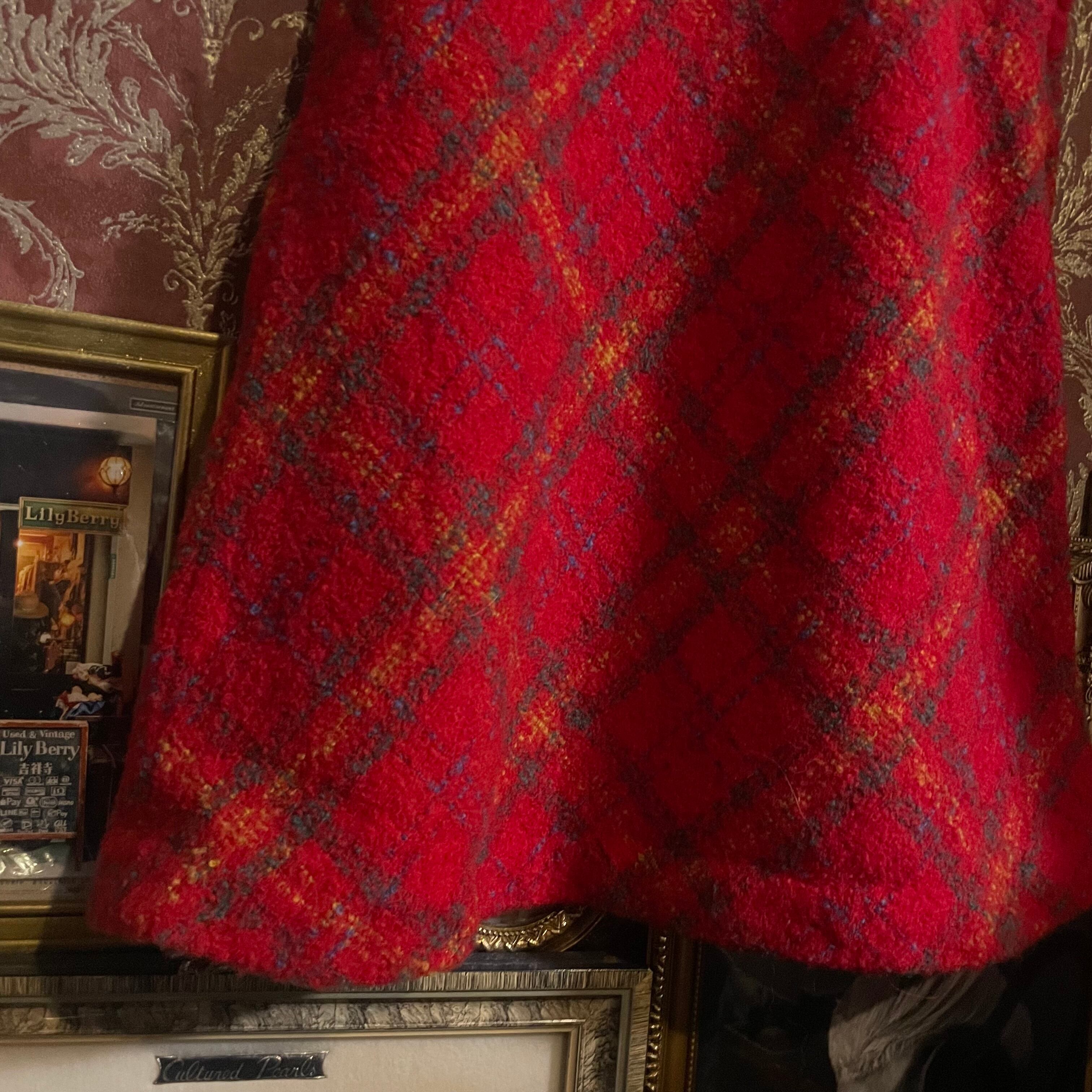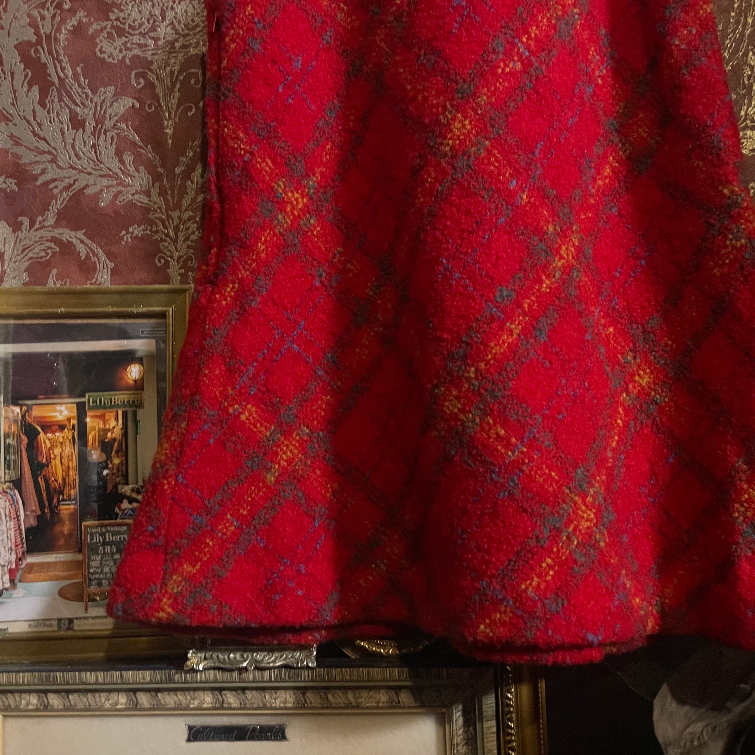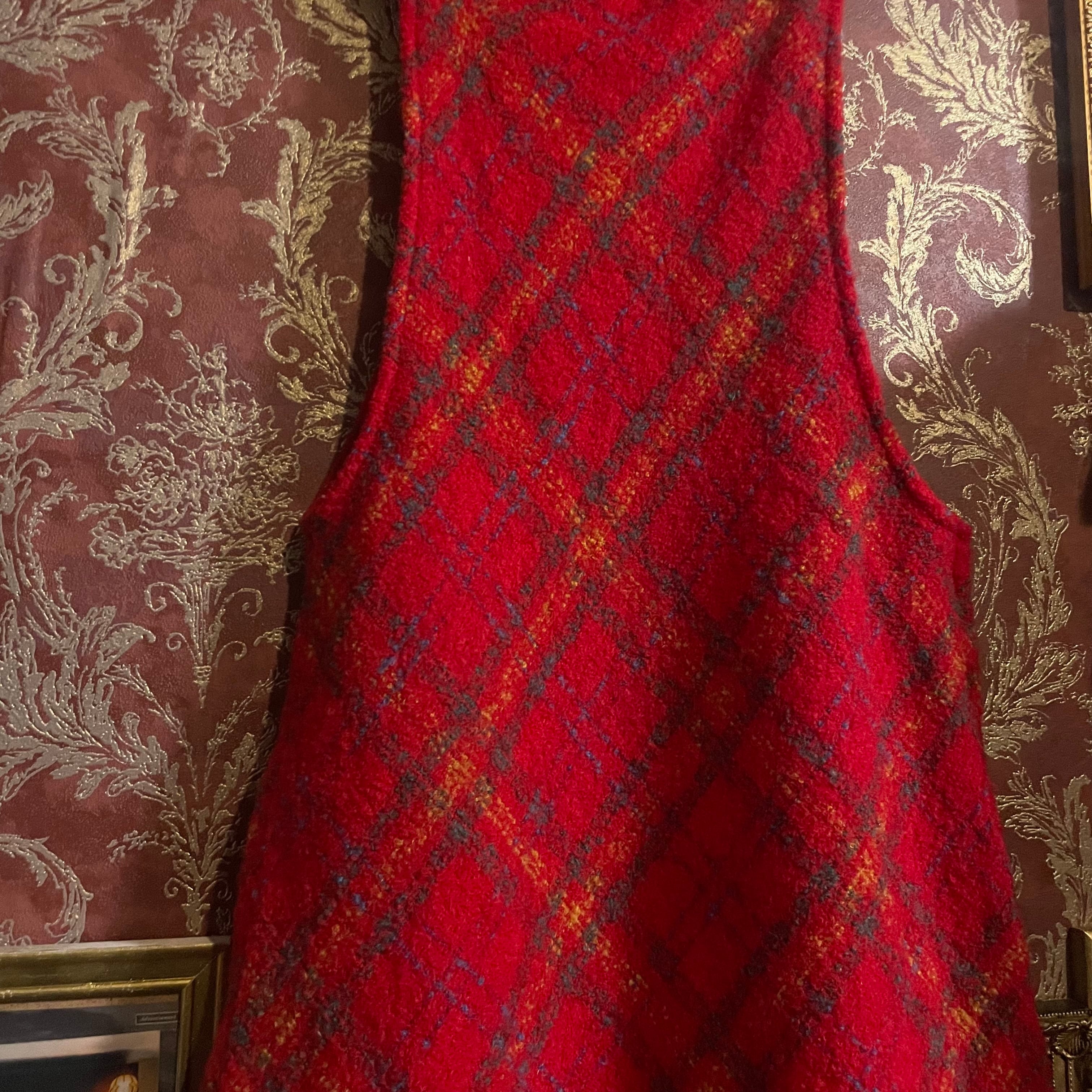 温かみのある赤をベースに、オレンジやブルーが織り交ぜられたチェック柄が印象的なジャンパースカートです。