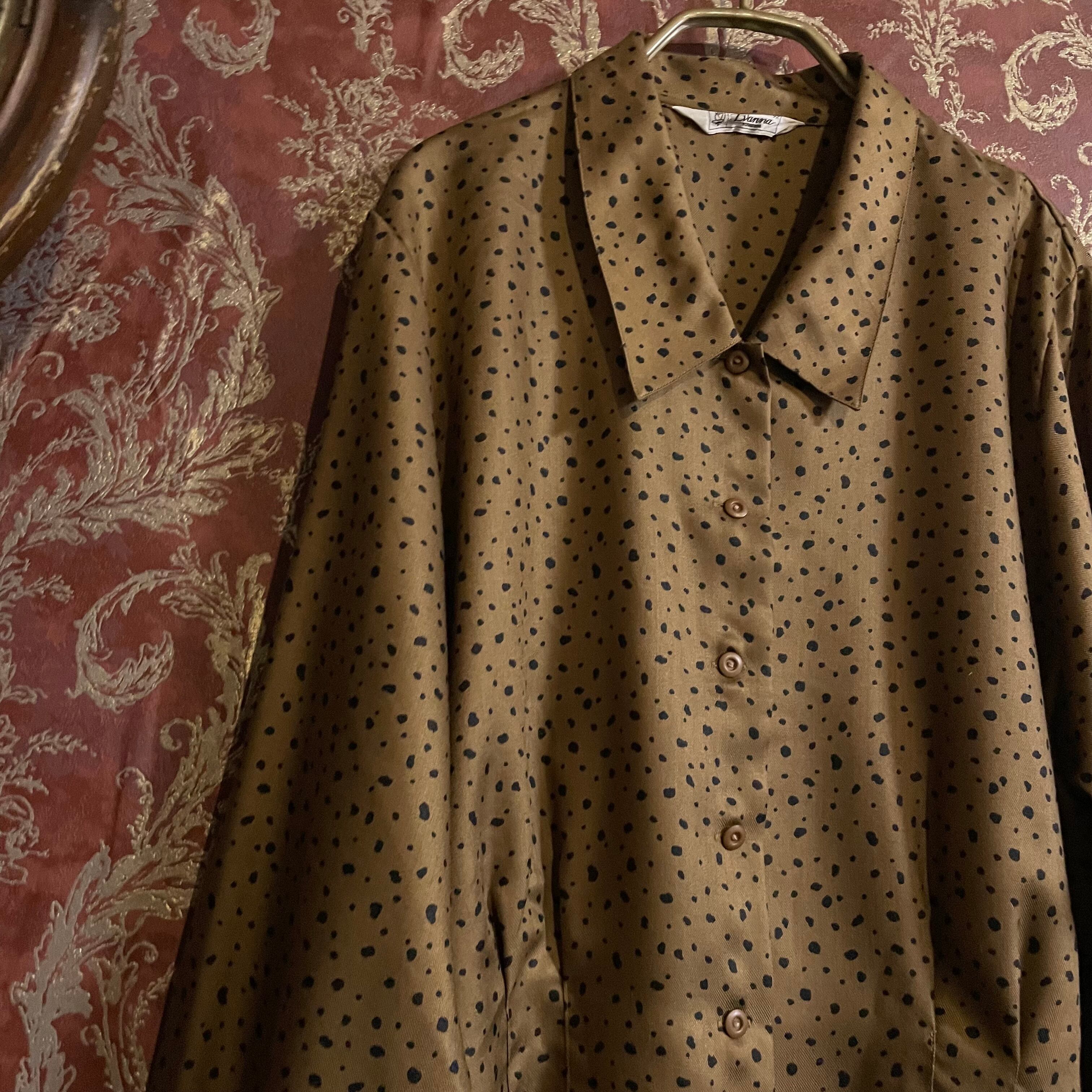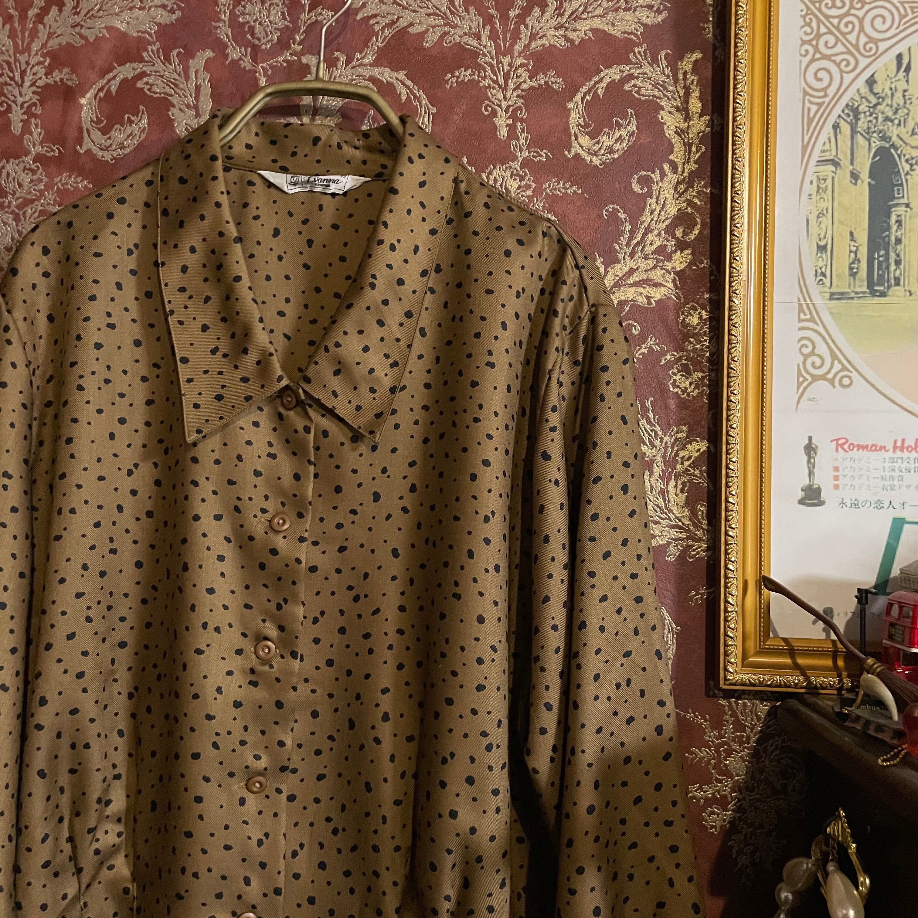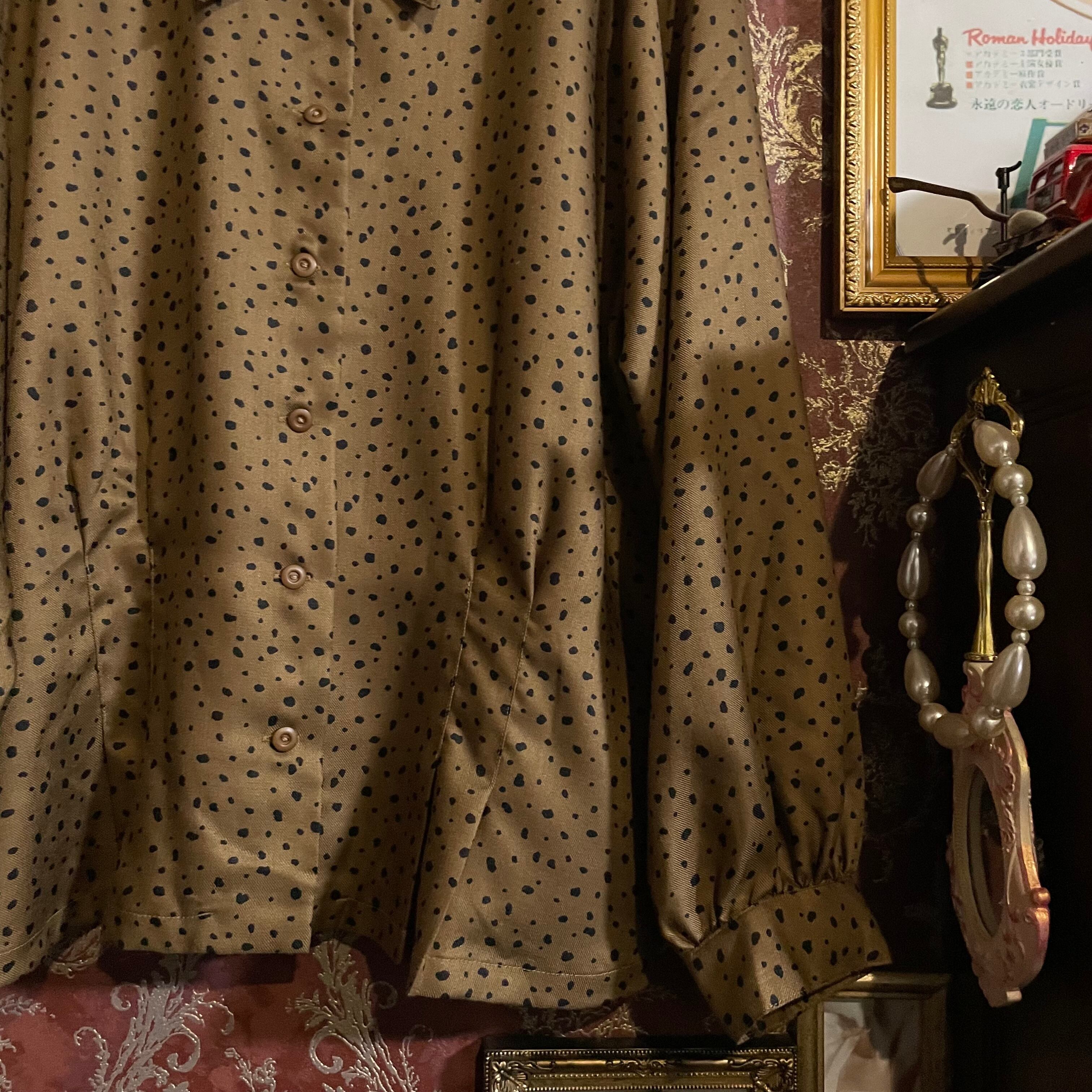 落ち着いたゴールド調のブラウンベースに、不規則な変形ブラックドットが散りばめられたヴィンテージブラウスです。