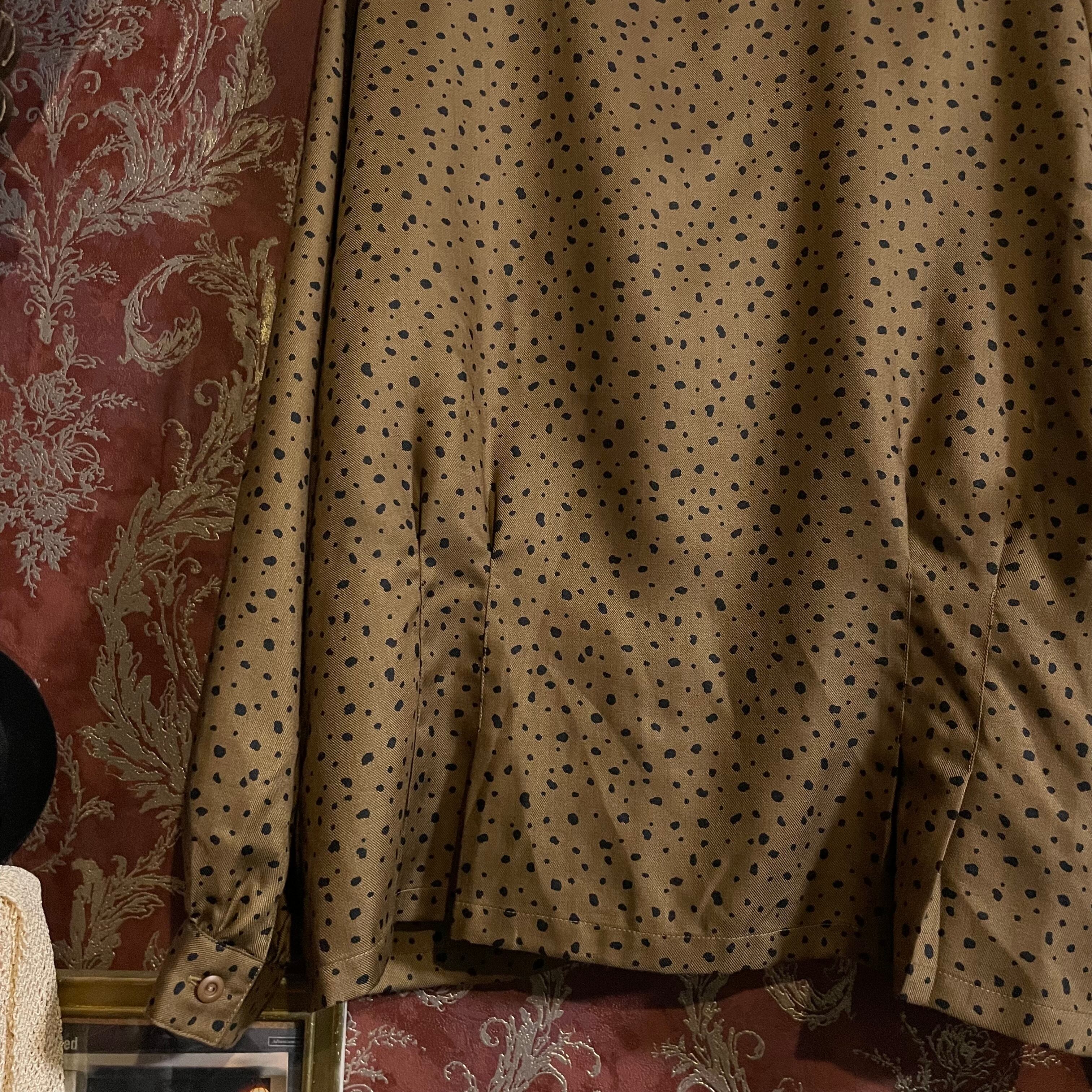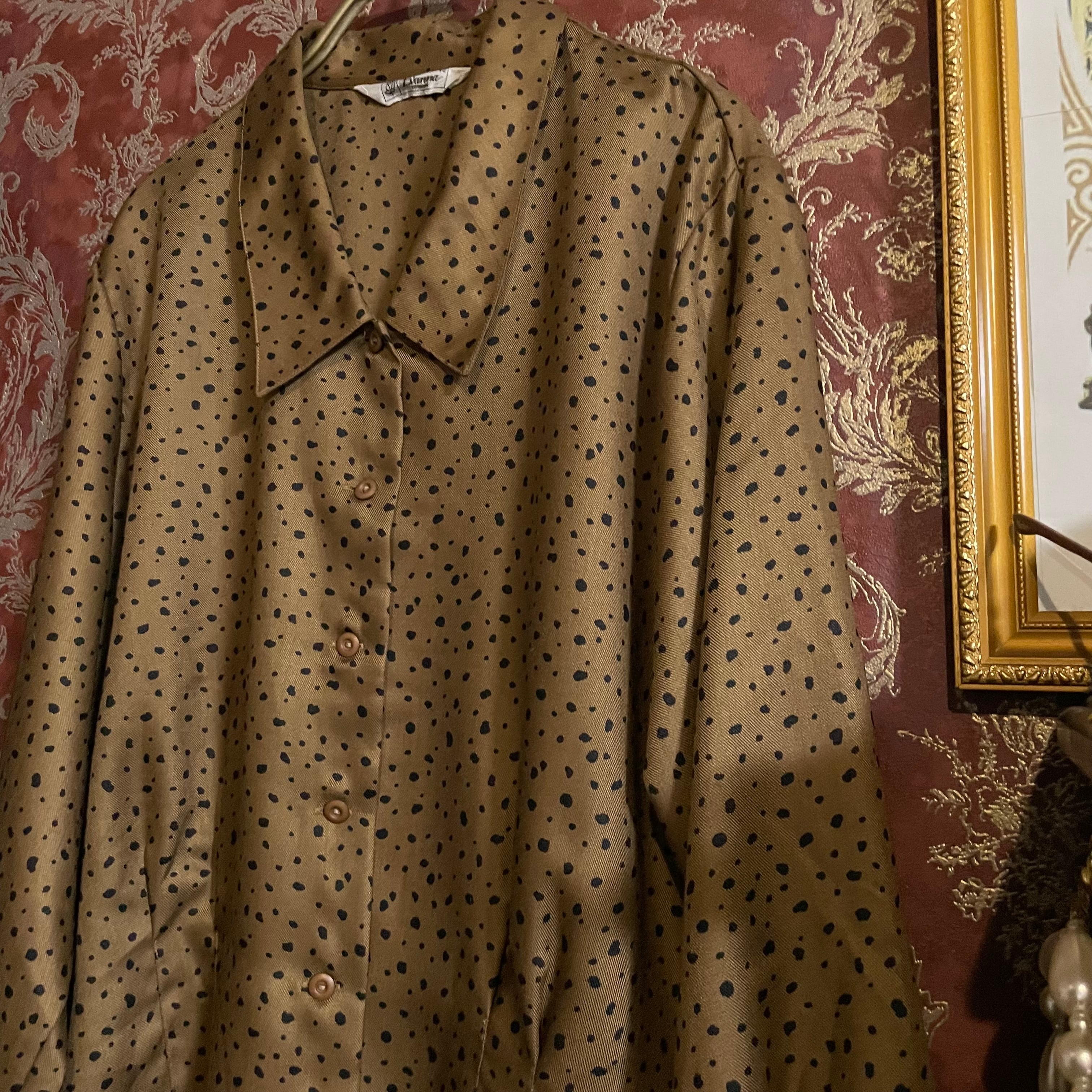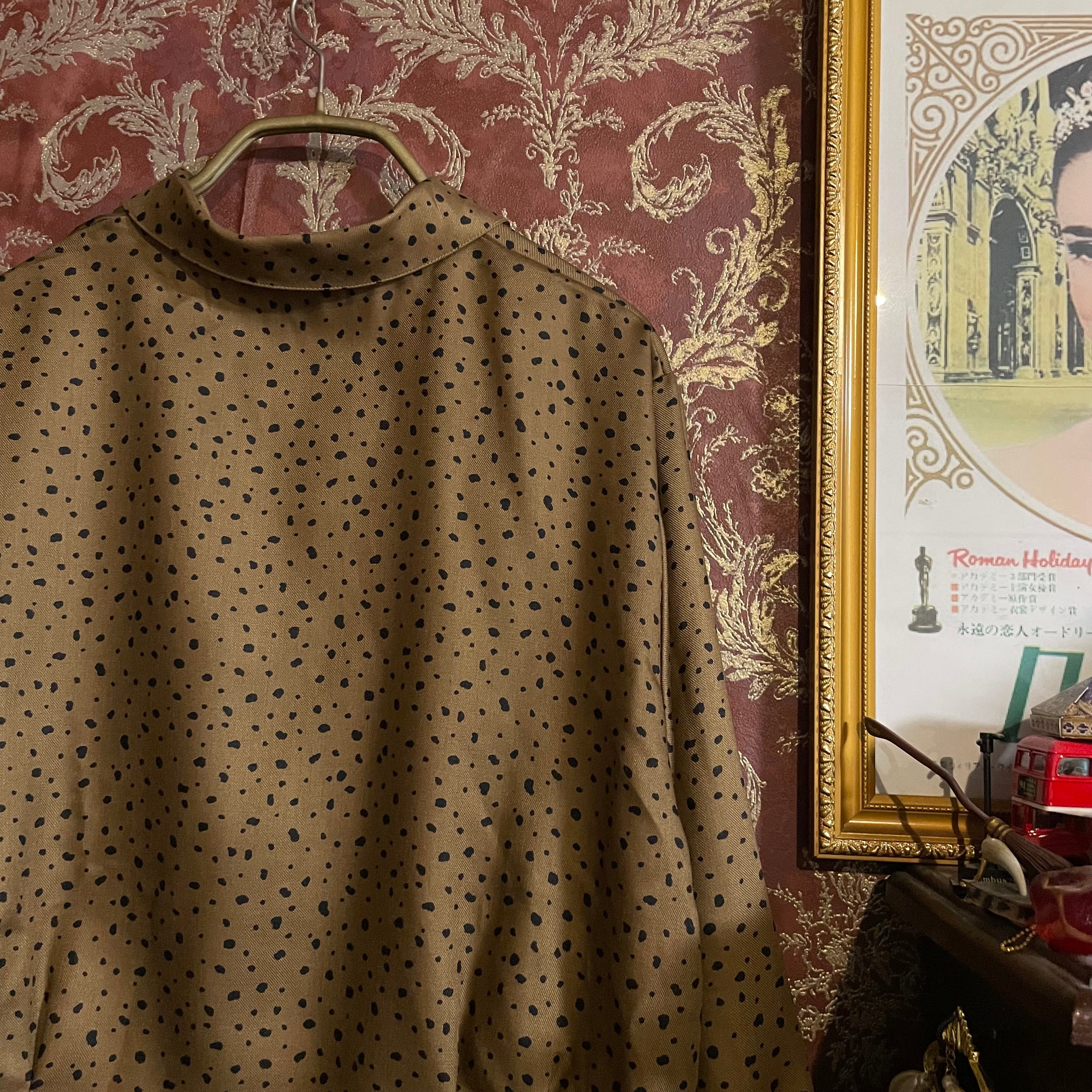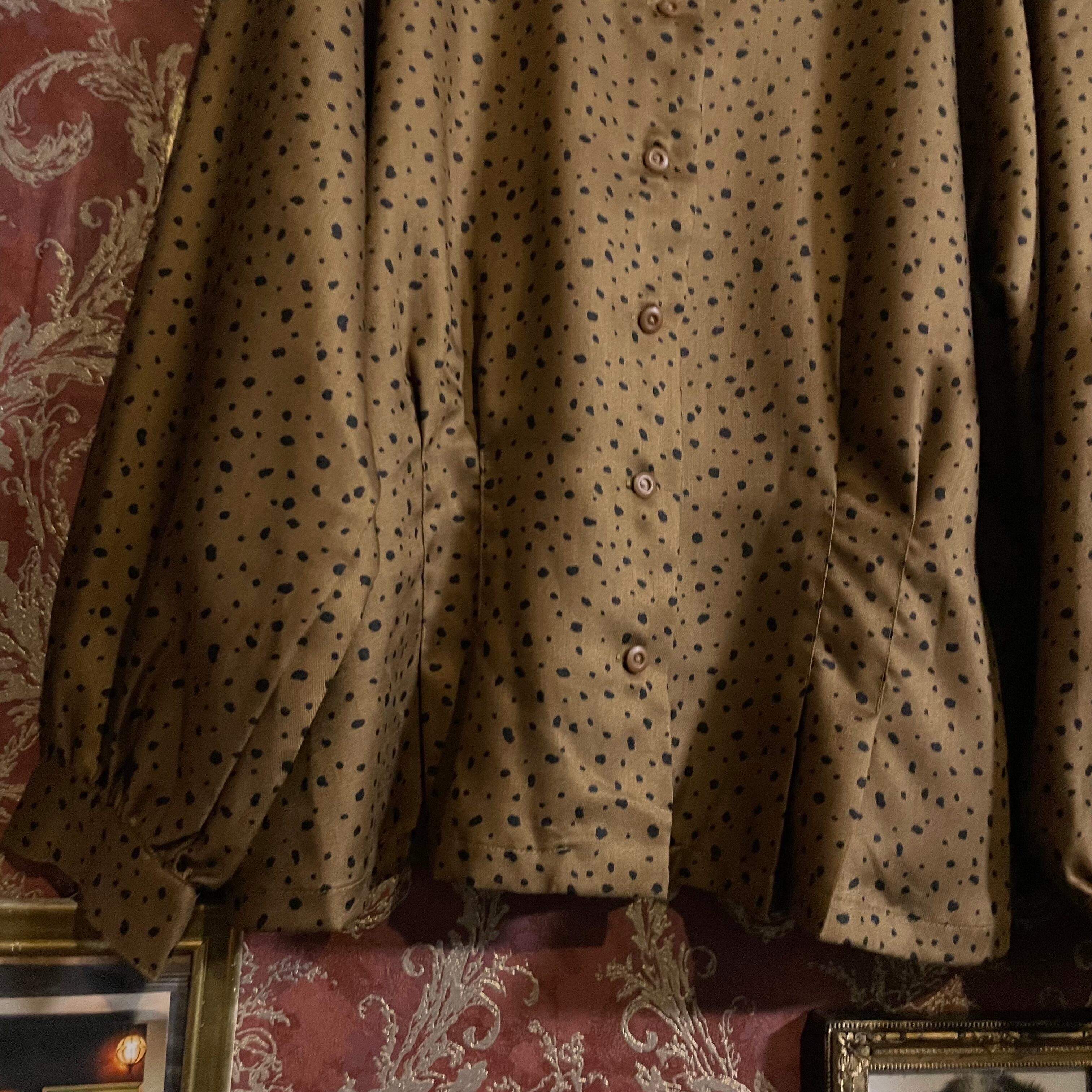 落ち着いたゴールド調のブラウンベースに、不規則な変形ブラックドットが散りばめられたヴィンテージブラウスです。