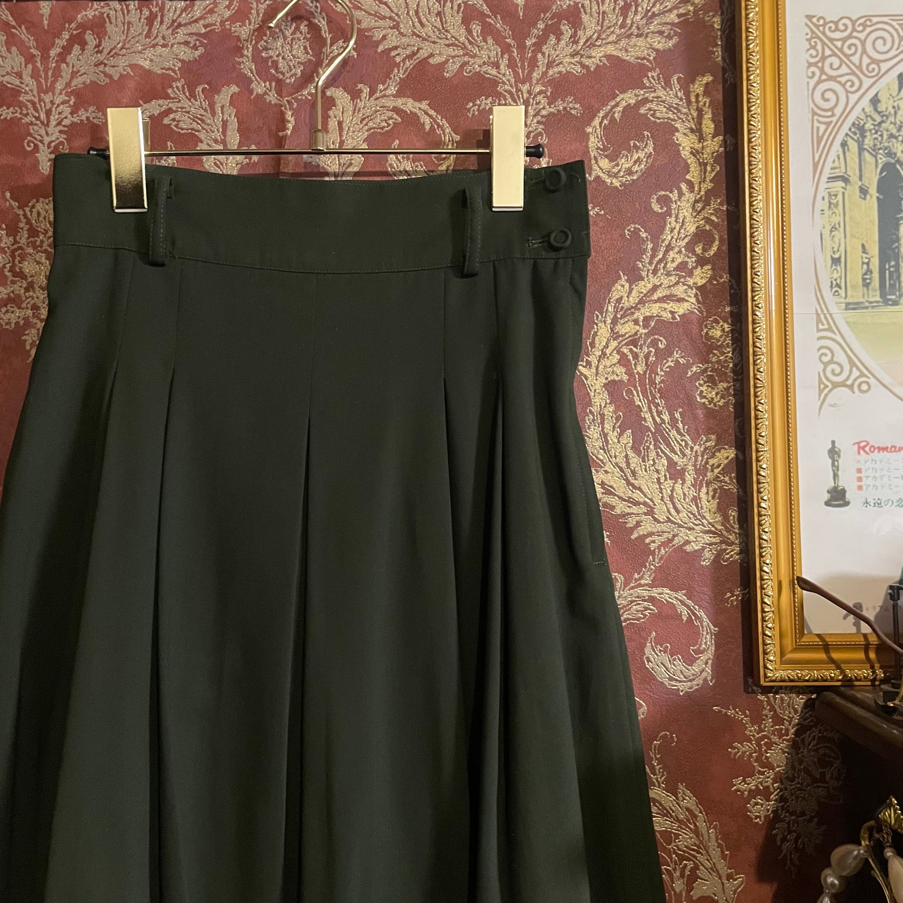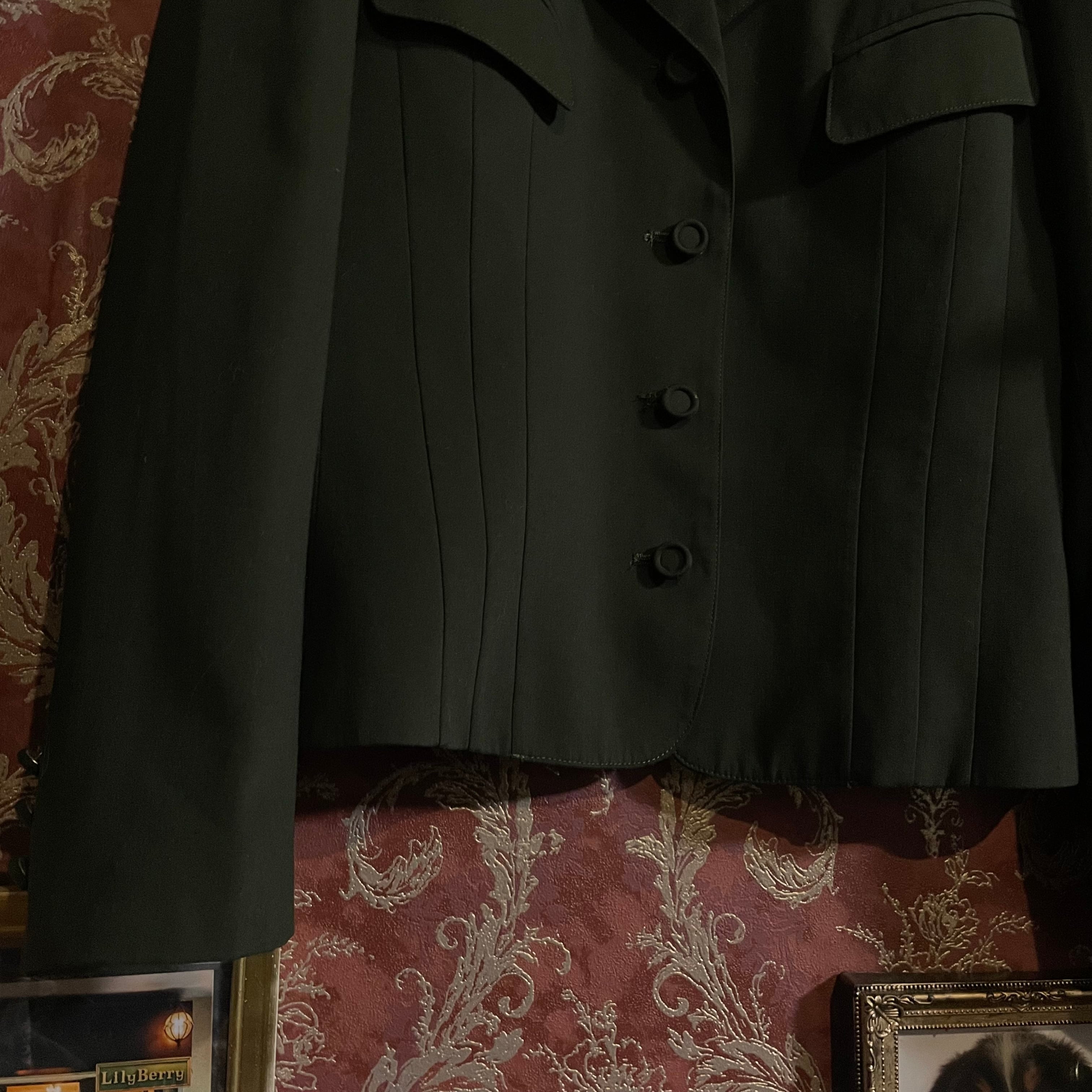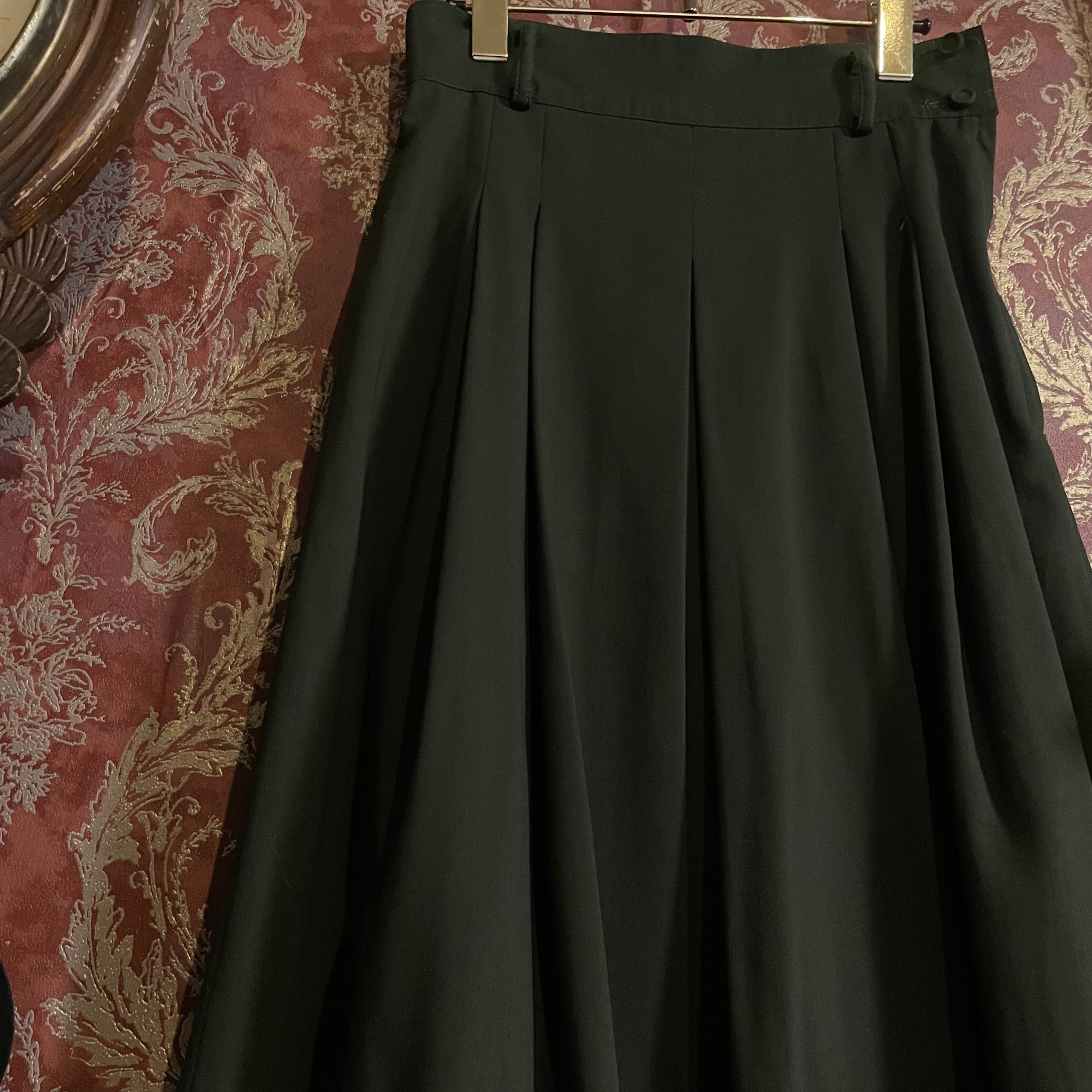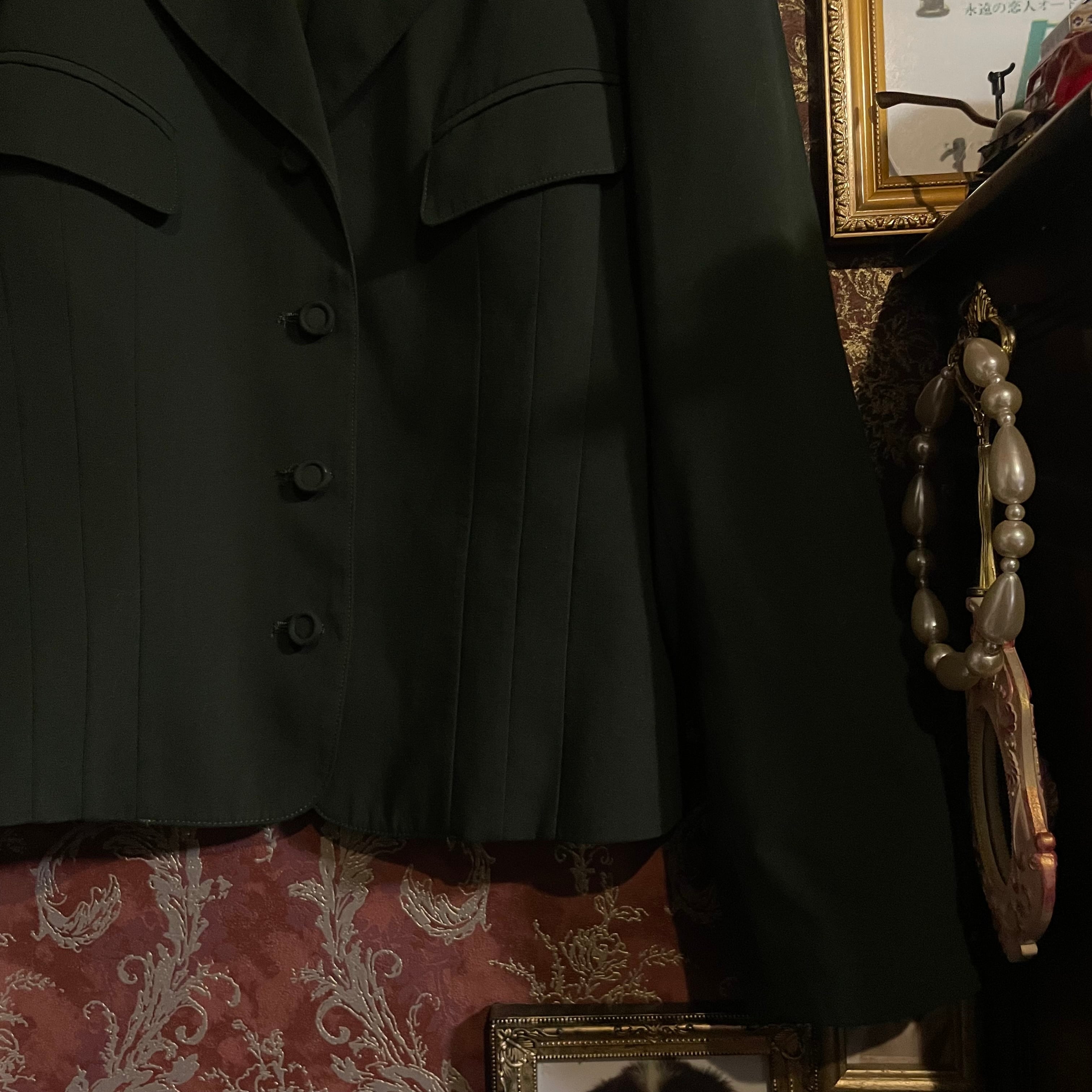 端正なテーラードジャケットとプリーツスカートの組み合わせで、当時の国産プレタポルテらしい丁寧な仕立てが感じられる一着です。