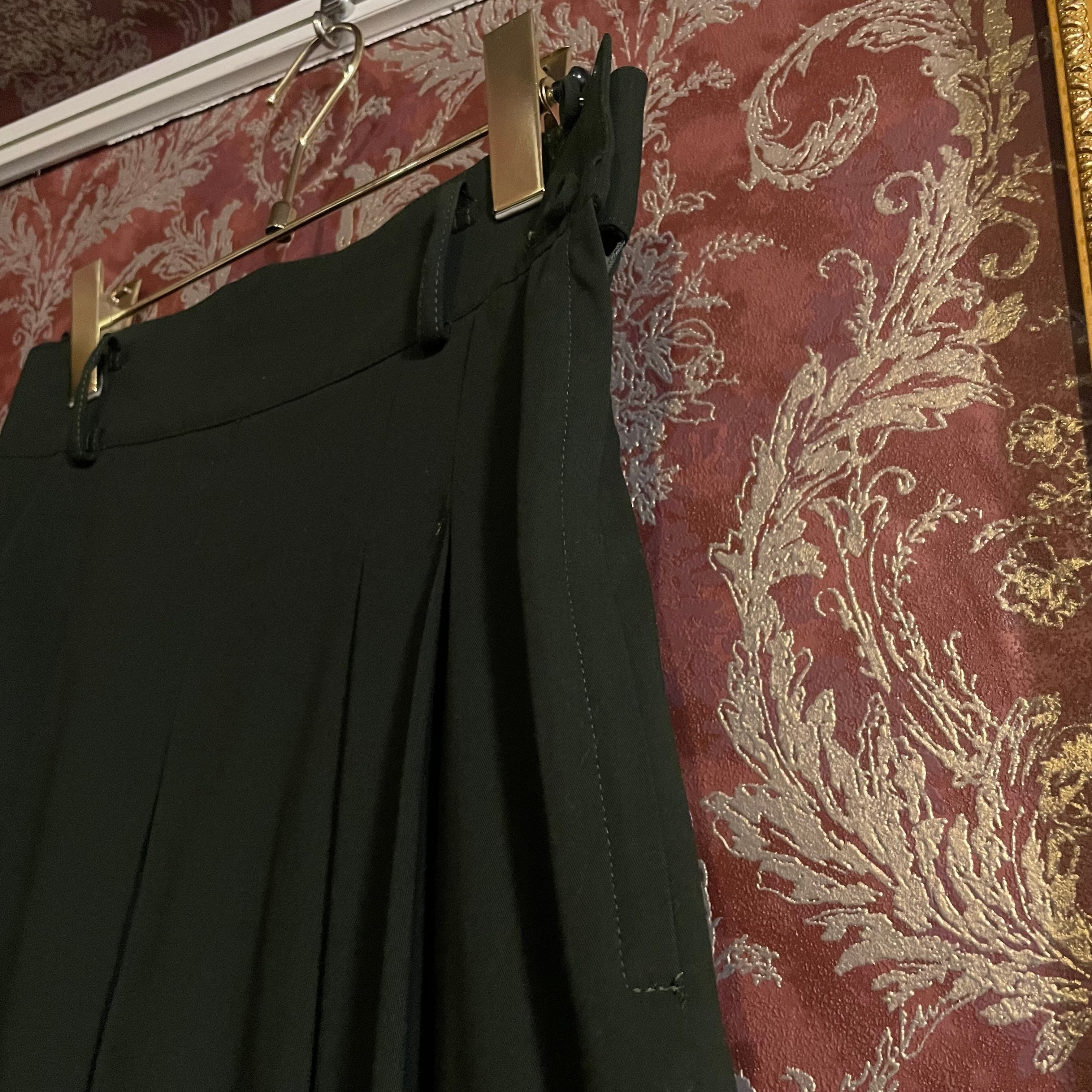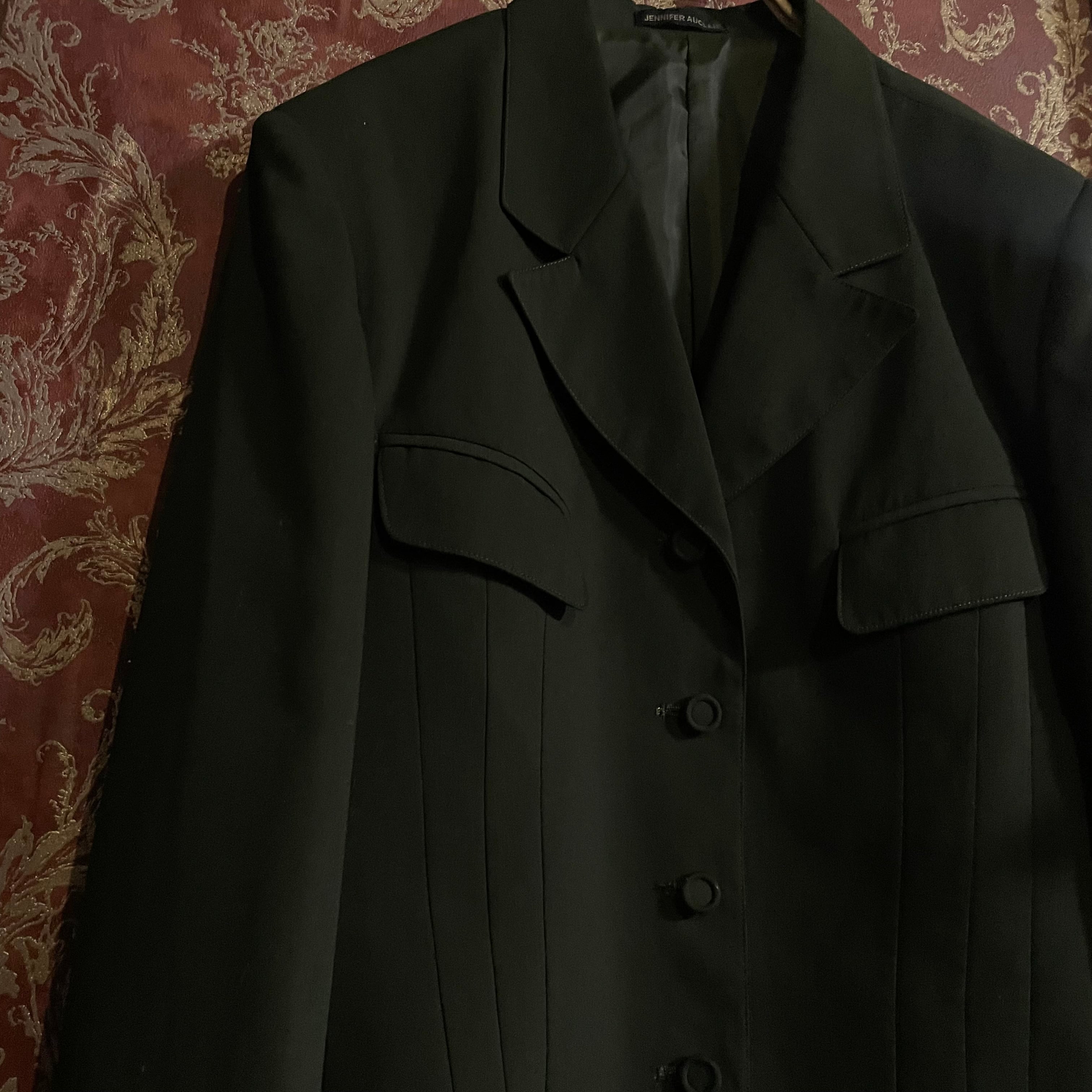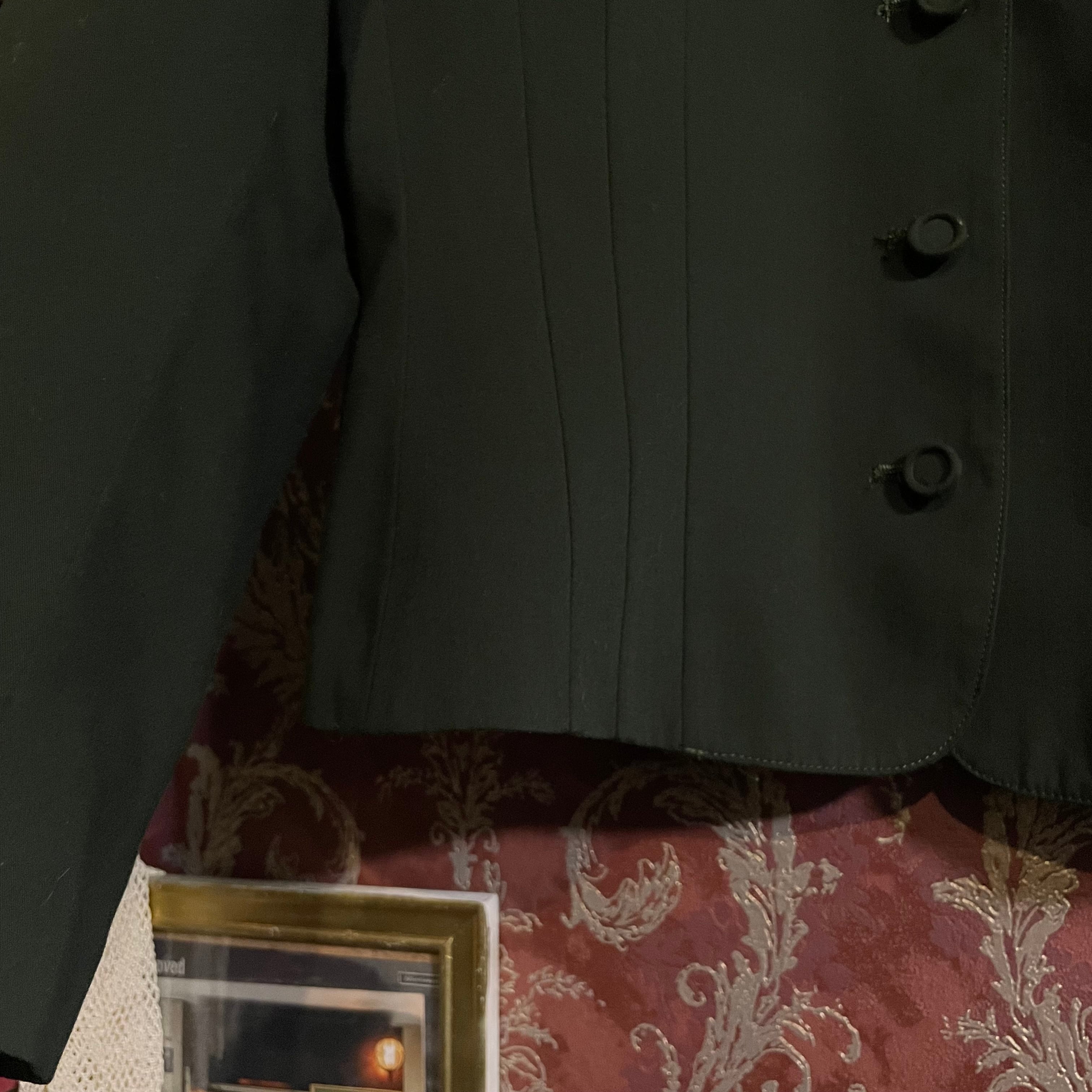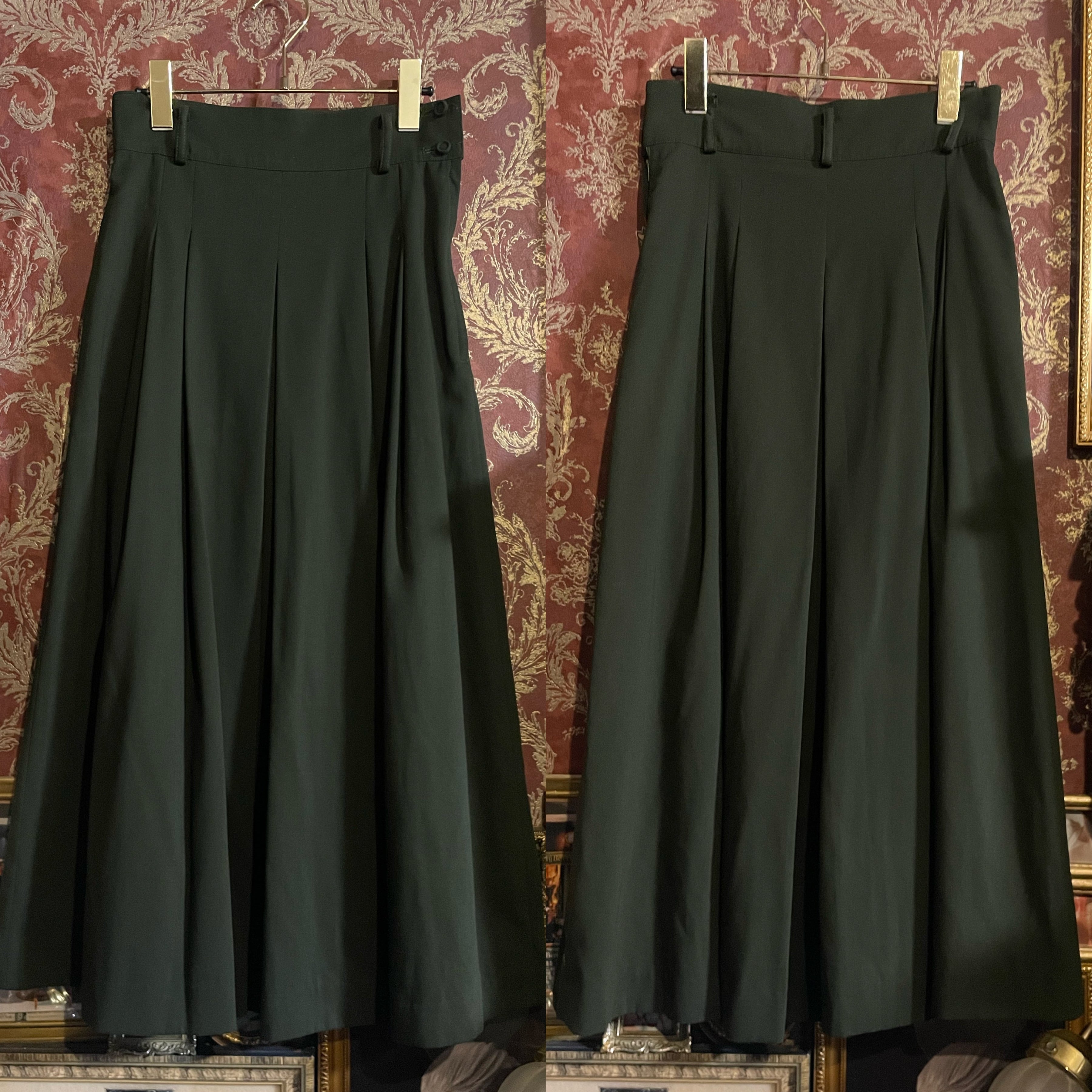 端正なテーラードジャケットとプリーツスカートの組み合わせで、当時の国産プレタポルテらしい丁寧な仕立てが感じられる一着です。