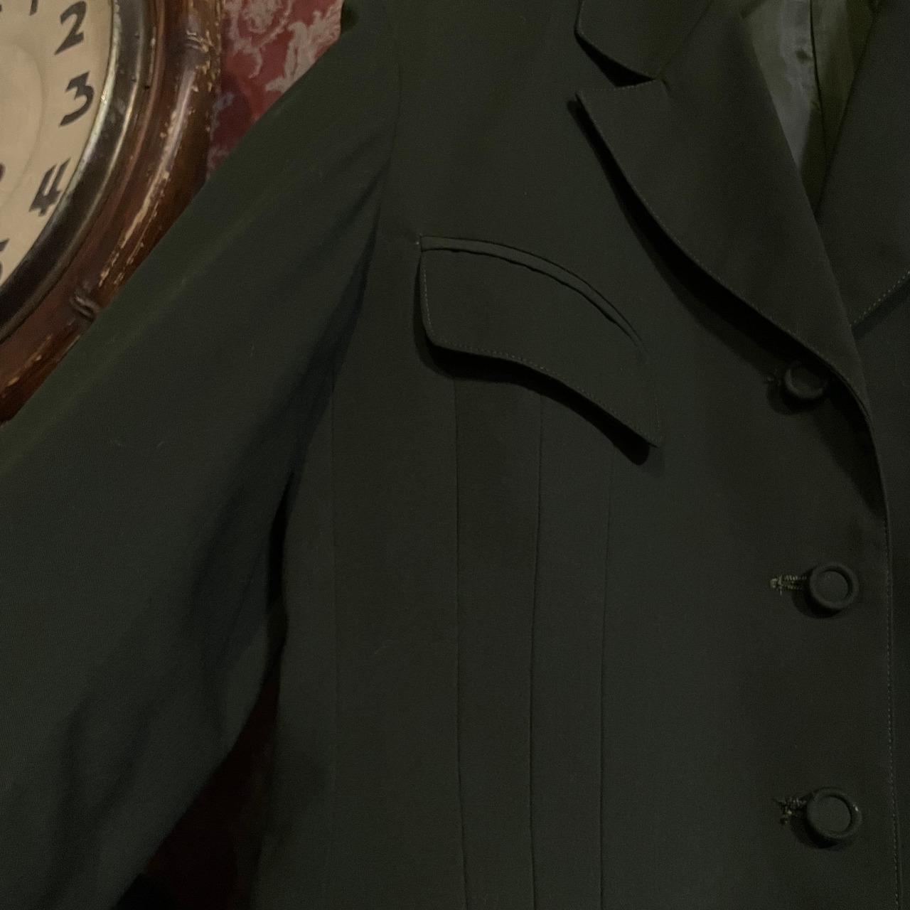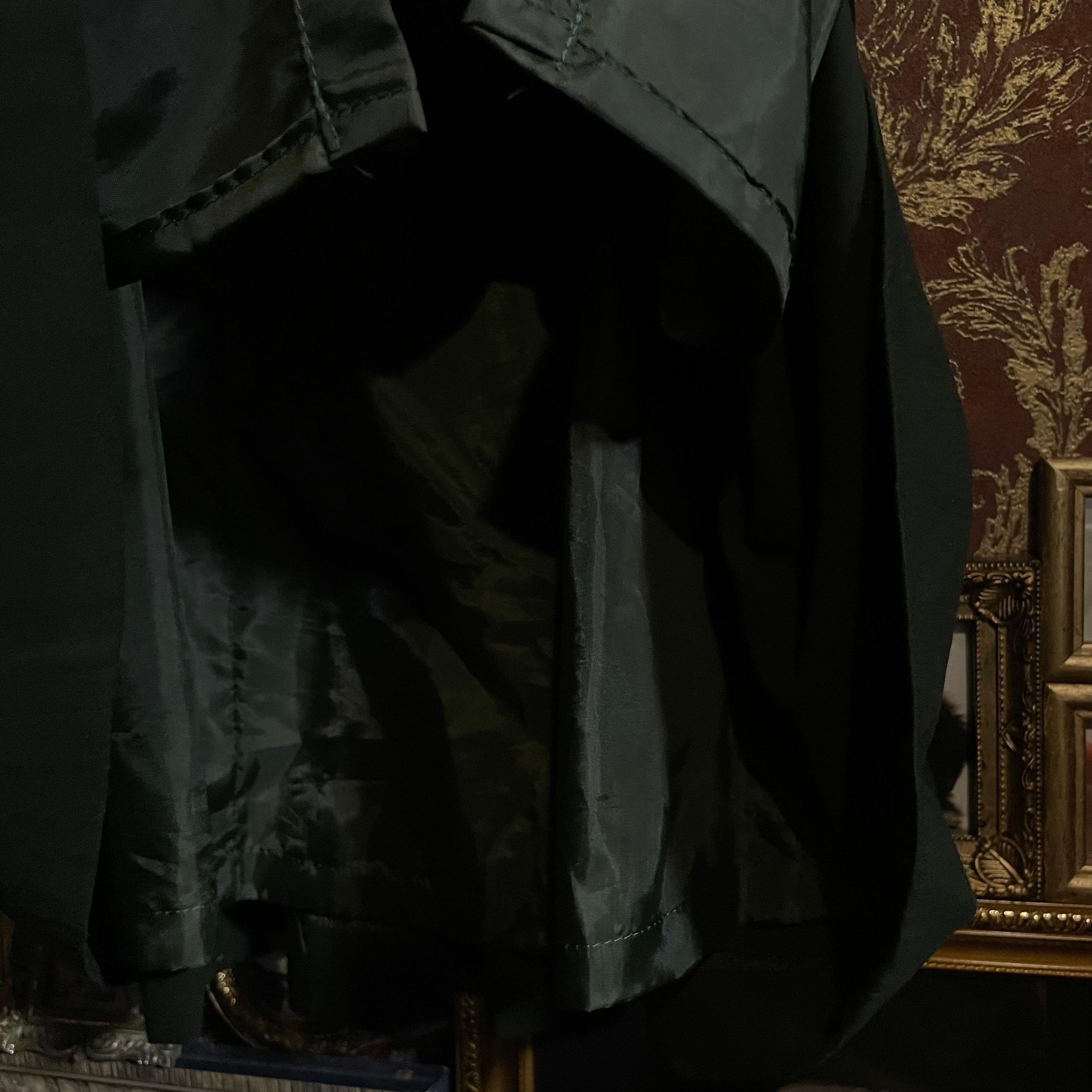 直線的で構築的なシルエットに、深みのあるダークグリーンカラー(#212922)が重なり、どこかミリタリーやオフィサーユニフォームを思わせるマニッシュなムードも漂います。