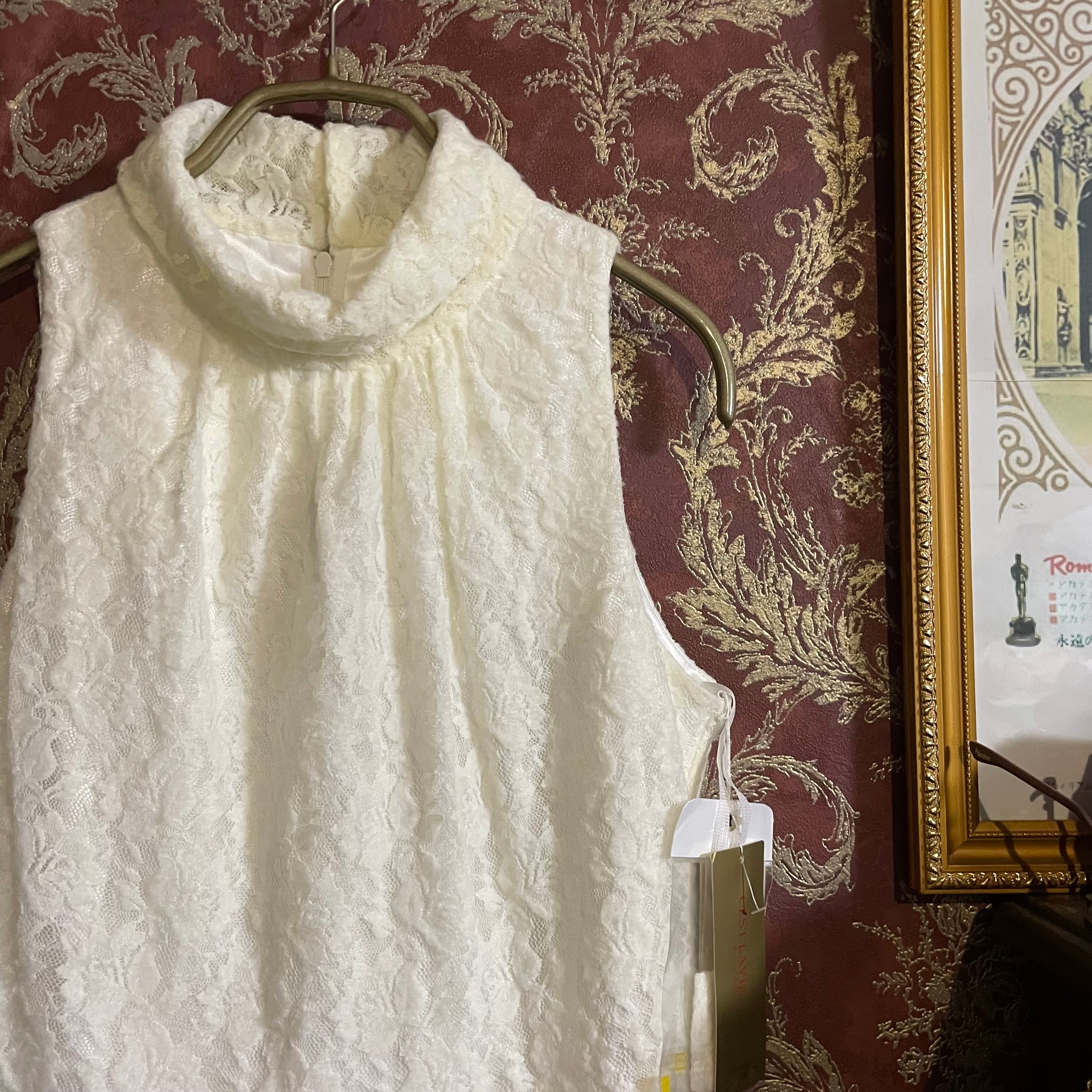 ややアイボリー系のやさしい色味で、レース特有の陰影が美しく、一枚で着ても存在感がありますが、ジャケットやカーディガンとも相性も良いです。