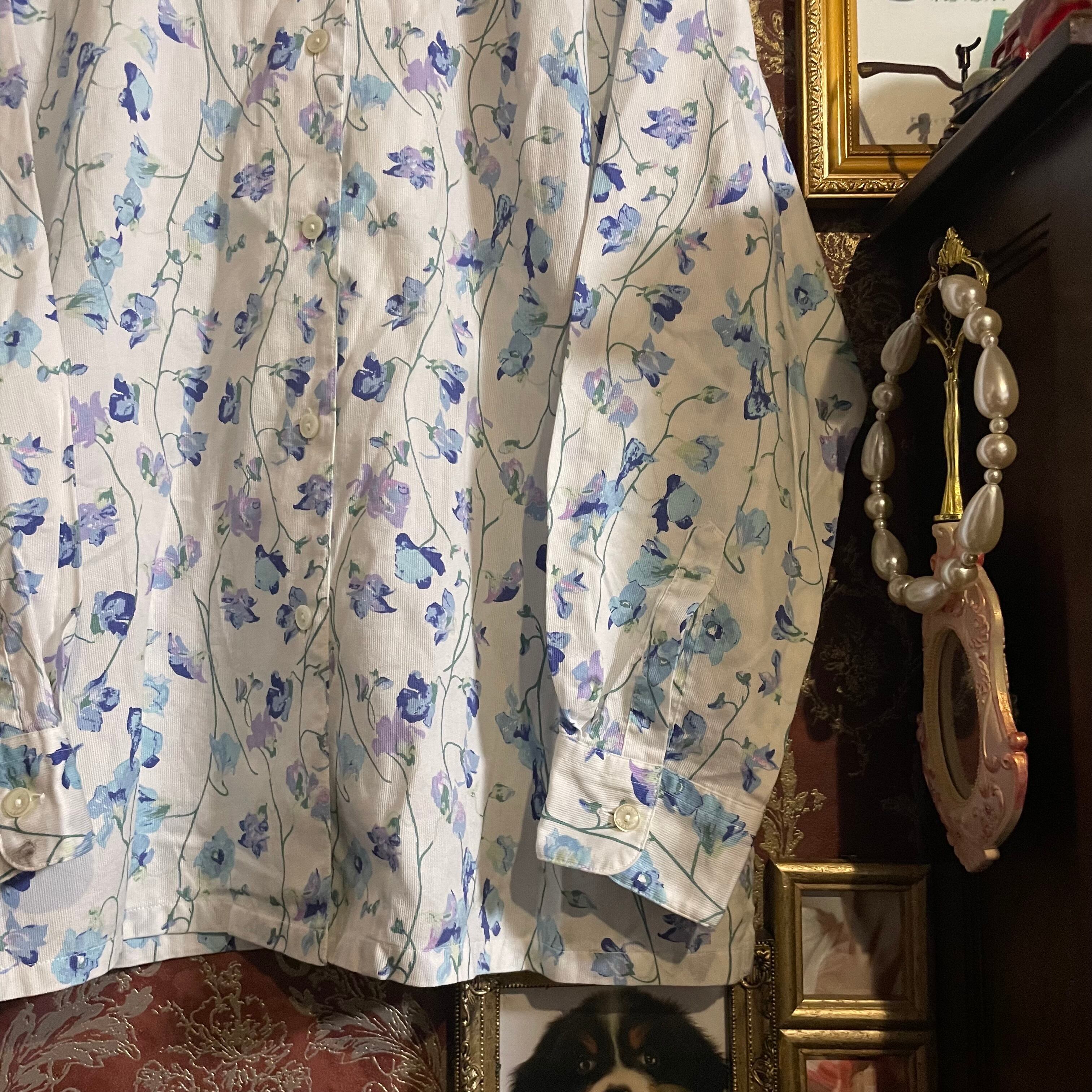 淡いホワイトベースに、ブルー〜ラベンダー系のフラワープリントが広がり、甘くなりすぎず清潔感のある印象です。