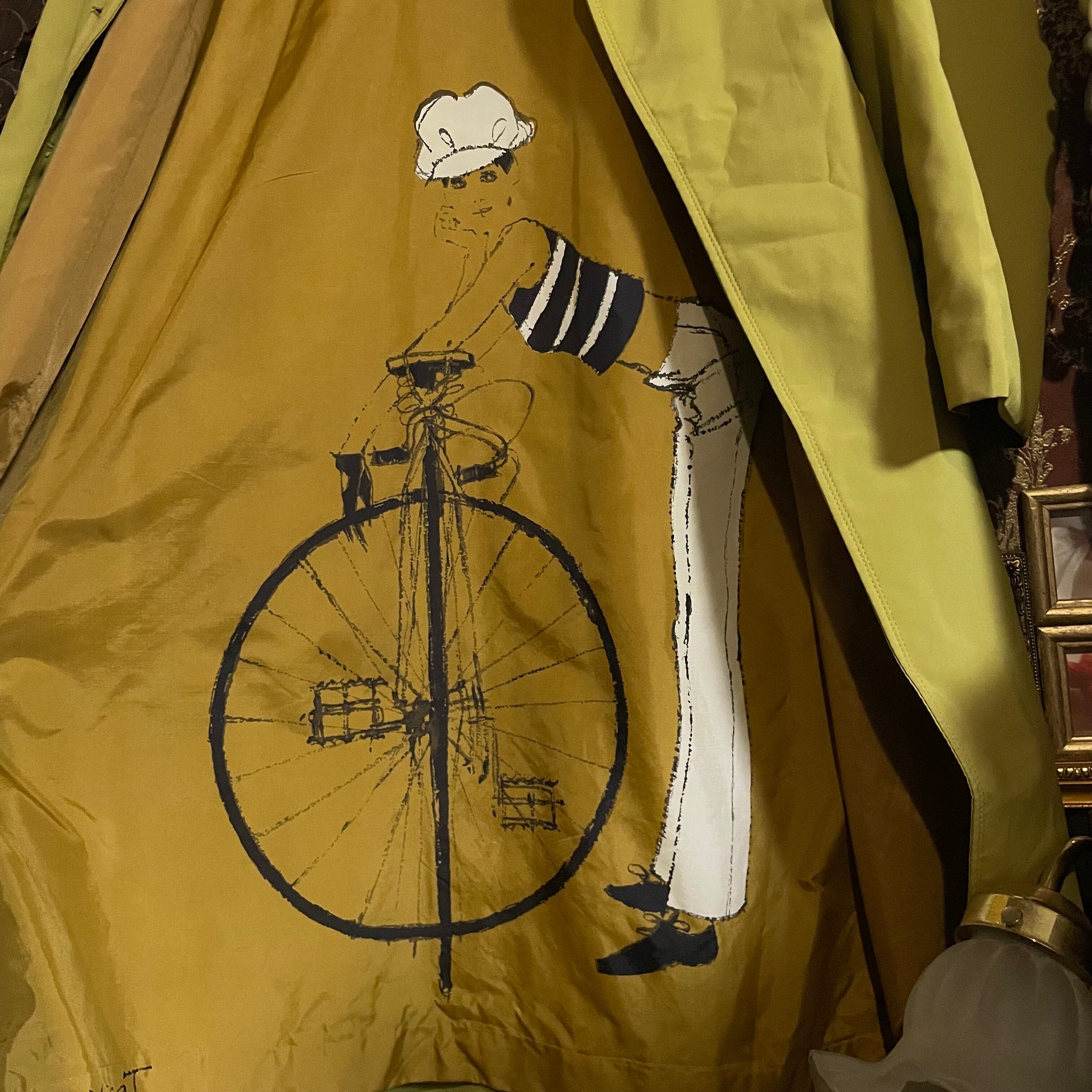 マスタードイエローをベースに、自転車に乗る少女のイラストがデザインされていて、着る人だけが楽しめるユーモアと物語性を宿しています。