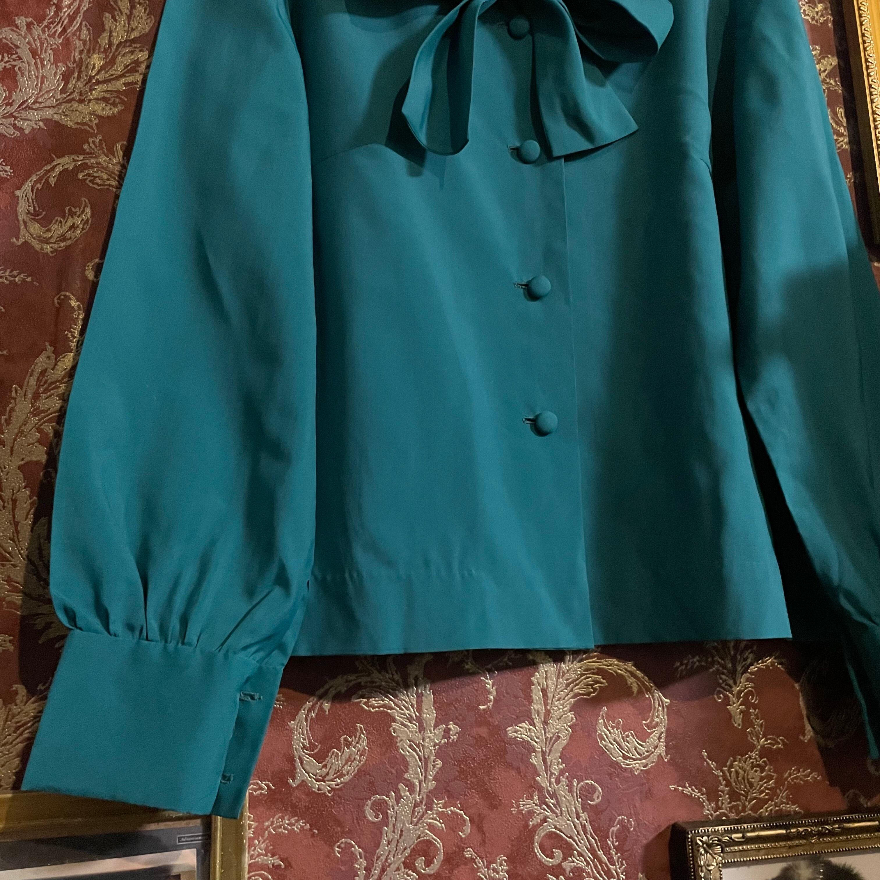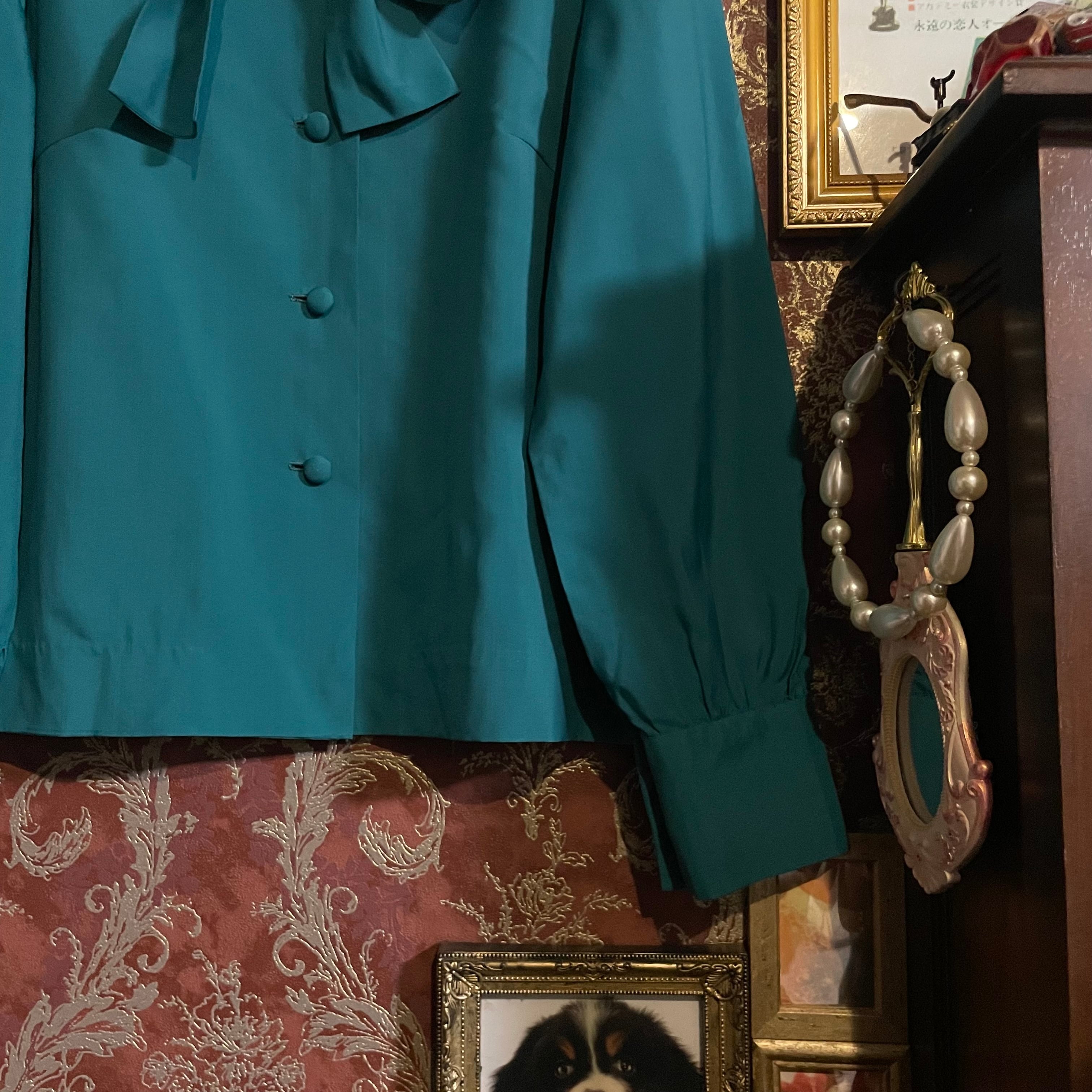 深みのあるブルーグリーン(#2b615e)が印象的な、ヴィンテージライクなボウタイブラウスです。