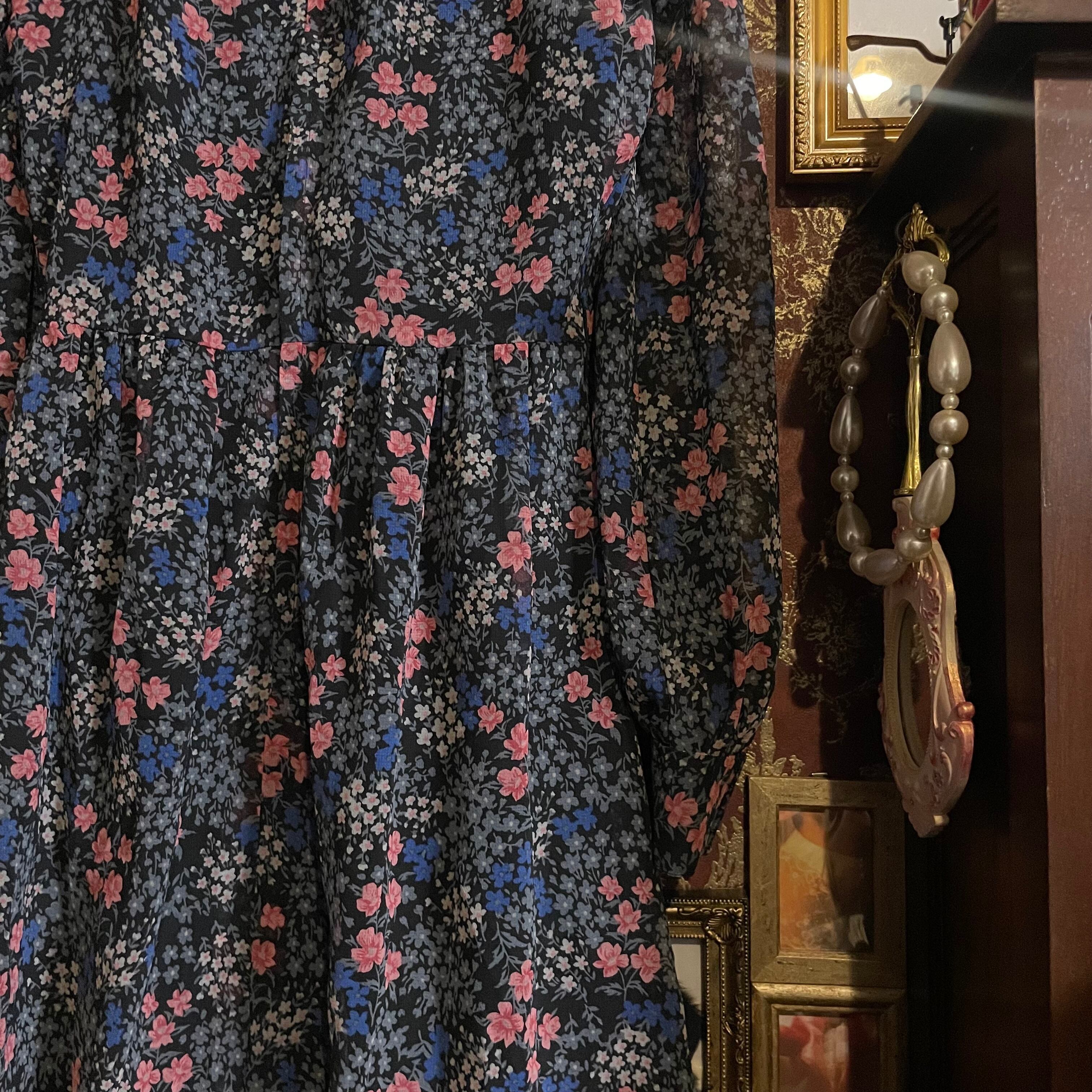 ブラックをベースに、グレー・ブルー・ピンクの小花柄のシックで上品なフラワープリントワンピースです。