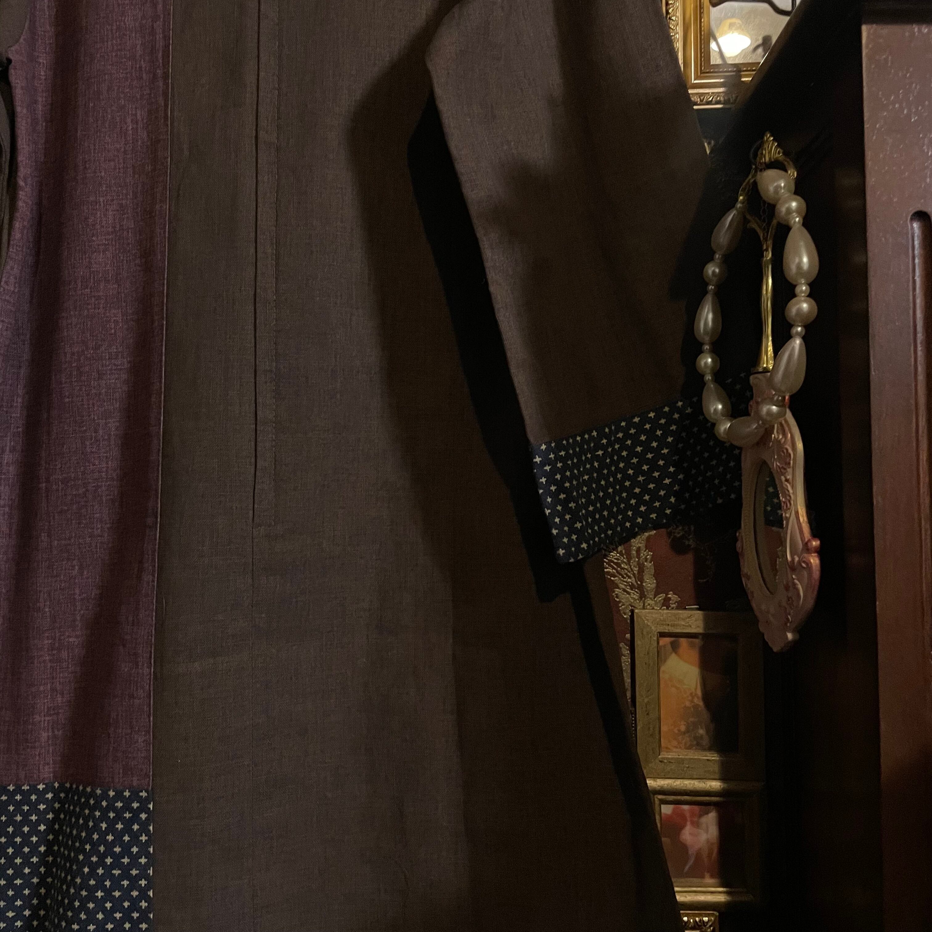 深みのあるブラウン(#4d3b34)をベースに、裾と袖口には小紋柄の切替が施されたワンピースです。