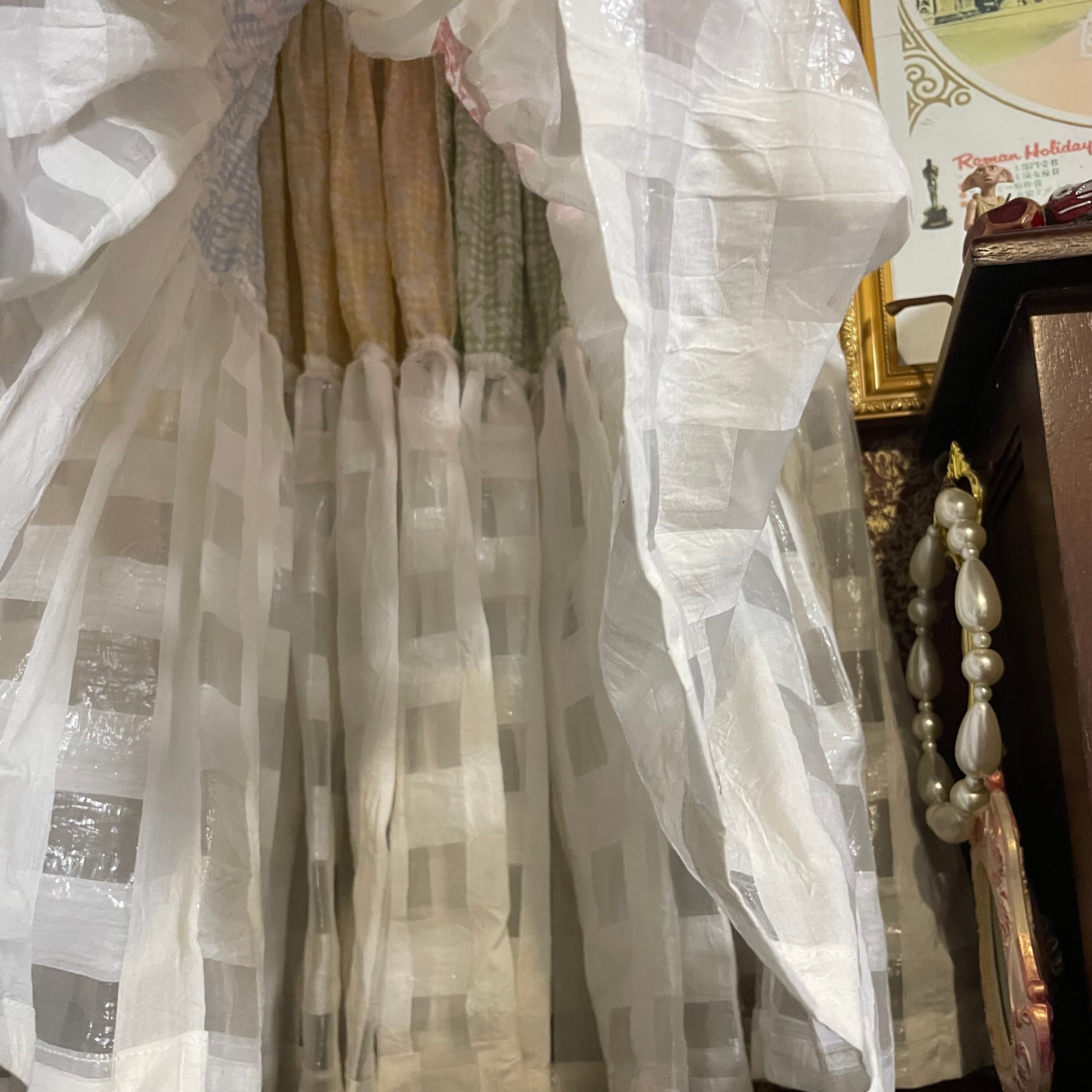 中腹から裾はチェック柄のオーガンジー切り替えが入っていて、透け感のある軽やかな素材が重なり、歩くたびにやさしく揺れます。