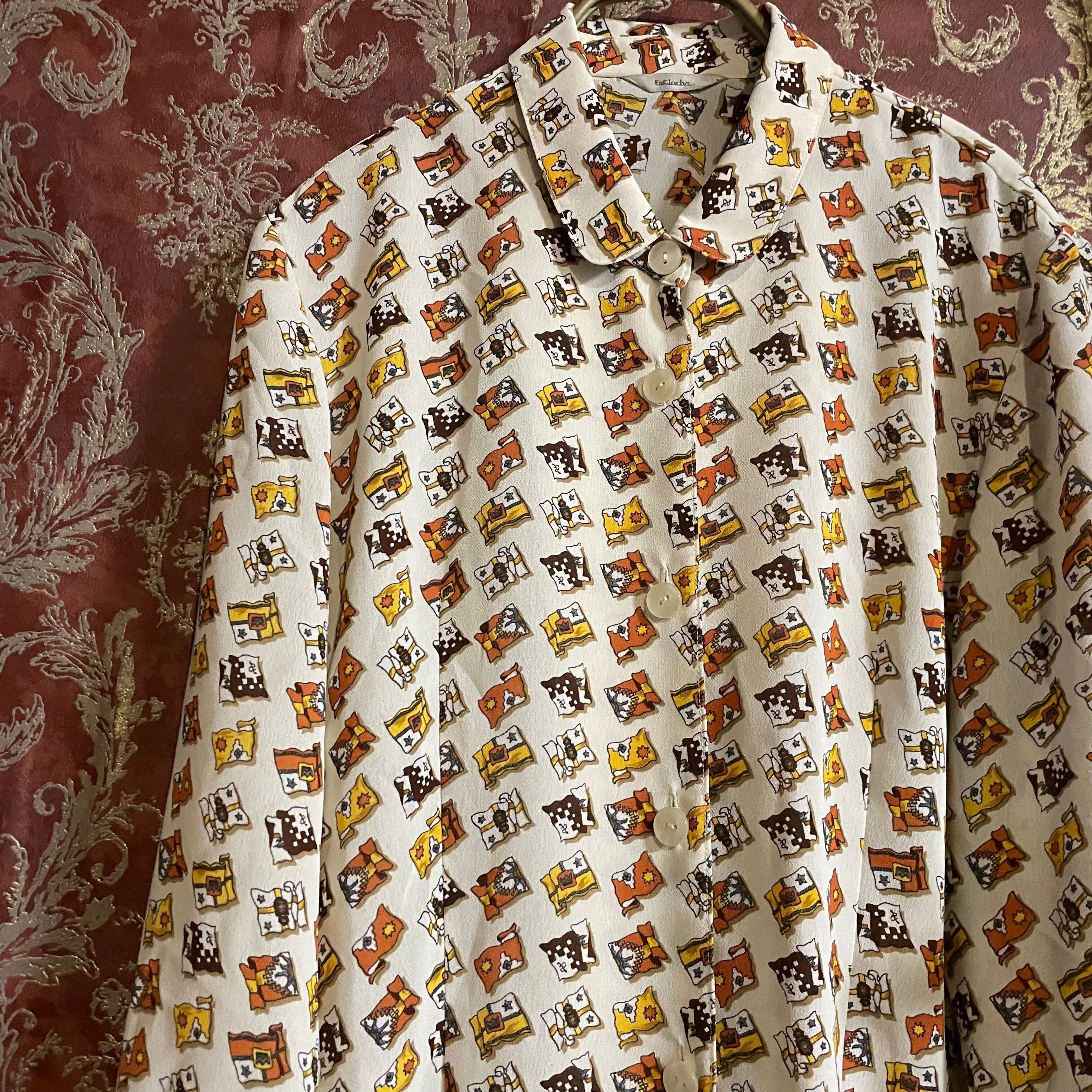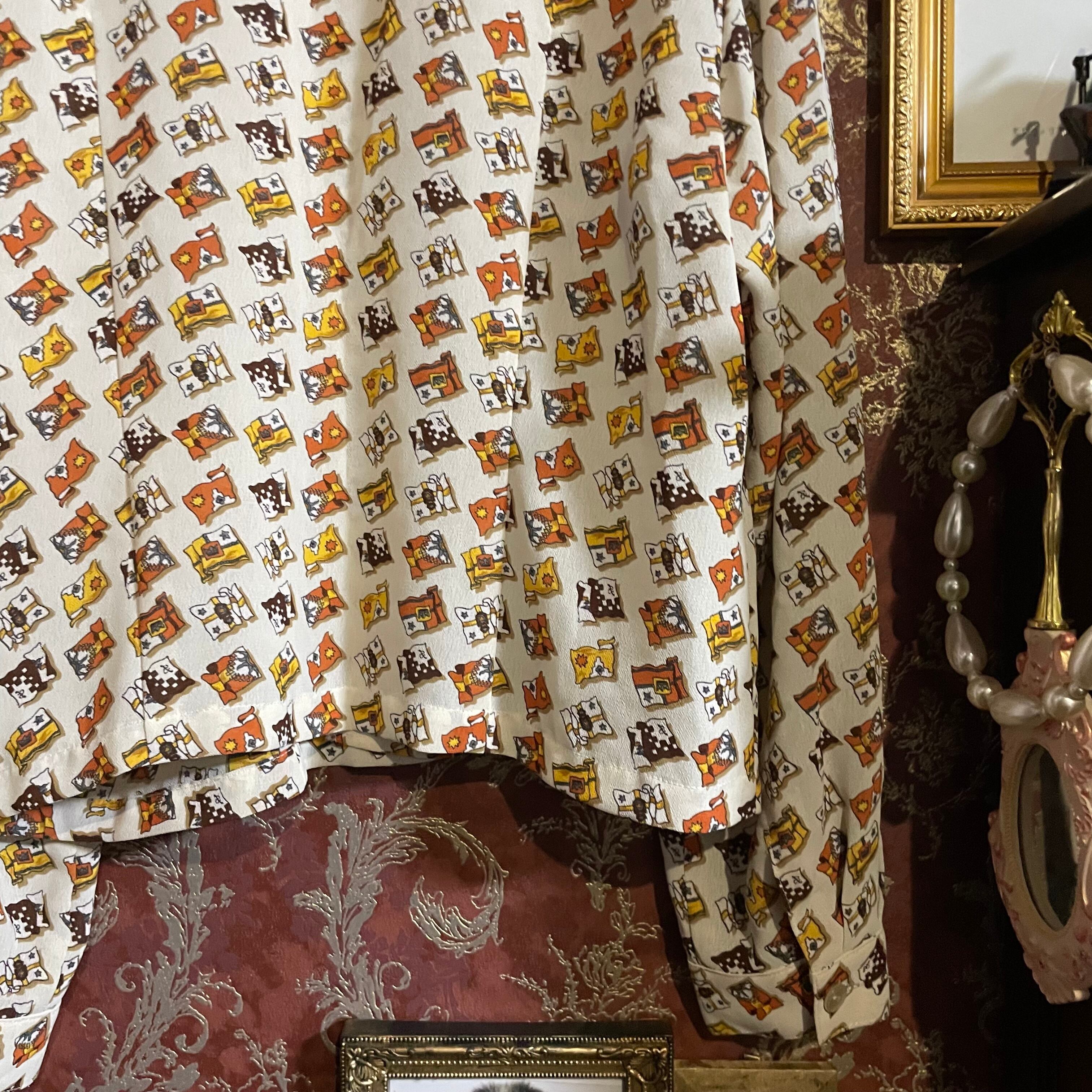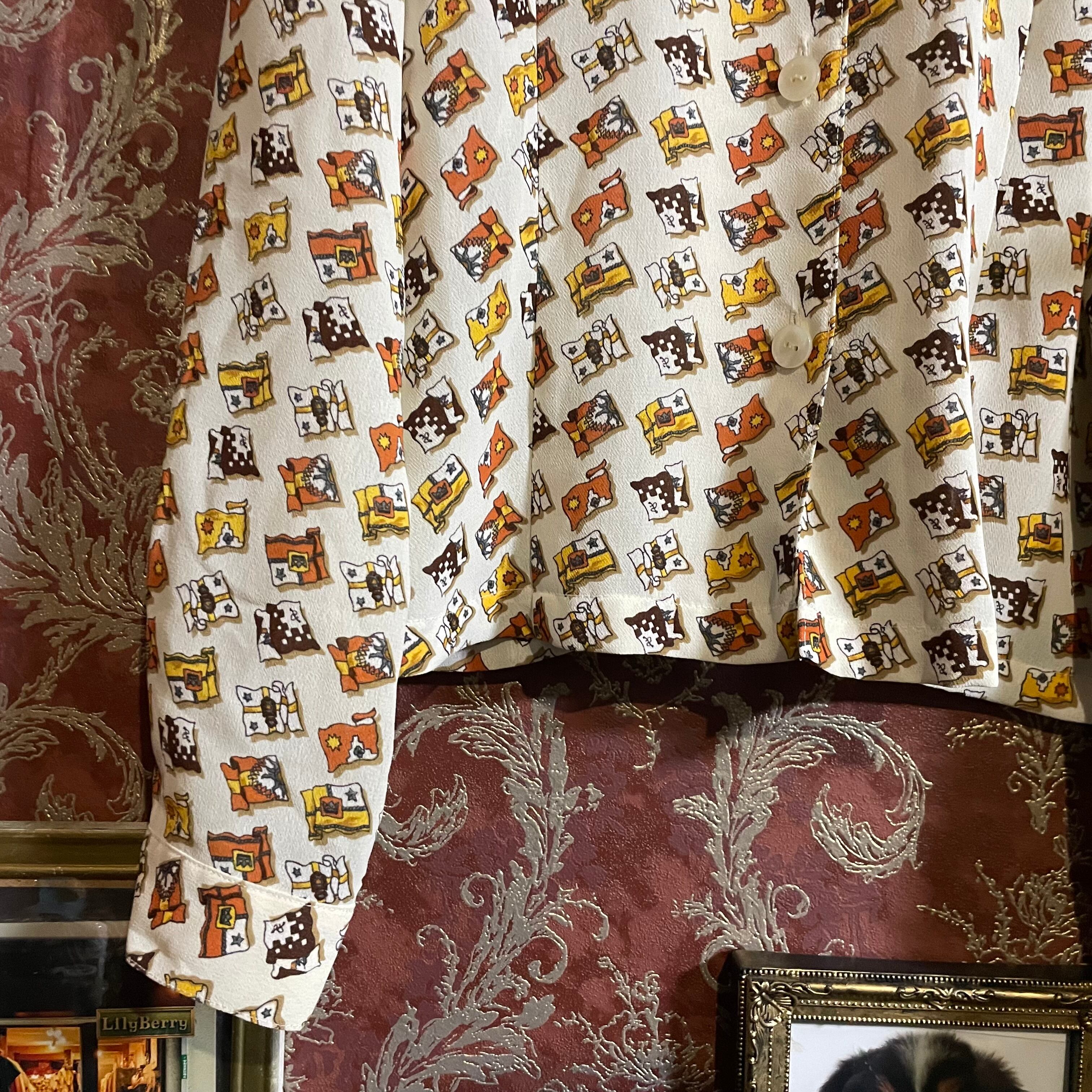 架空の国旗モチーフが並ぶユニークな総柄のセットアップです。