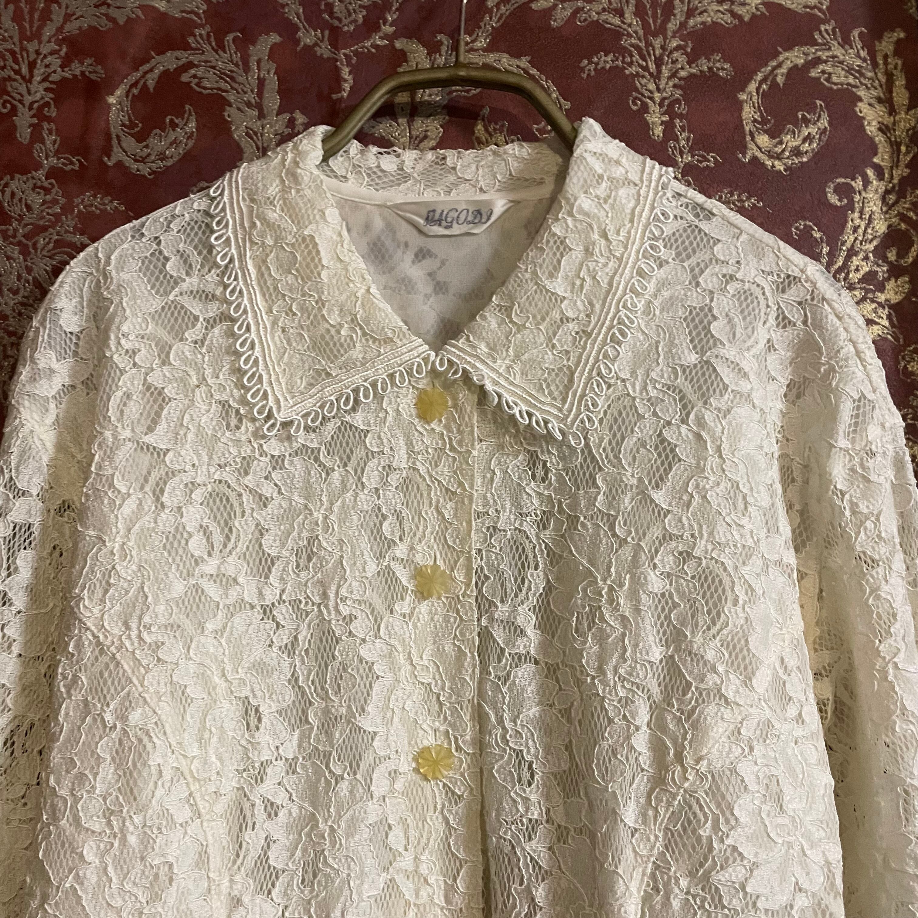 繊細なレースが全体にあしらわれた、やさしい雰囲気のブラウスです。