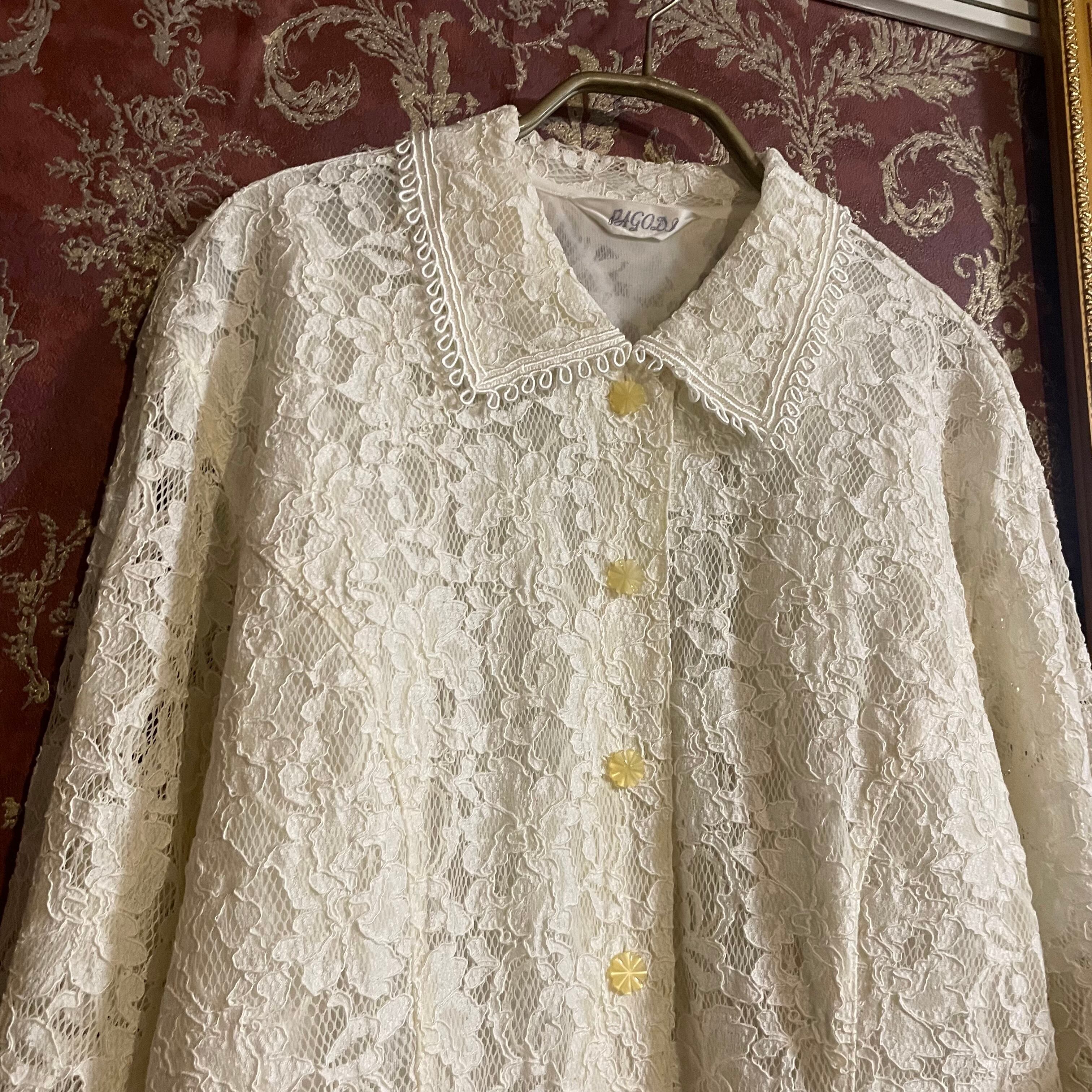 レースの軽やかな透け感と花のディテールが魅力の、フェミニンで優しい雰囲気の一着です。