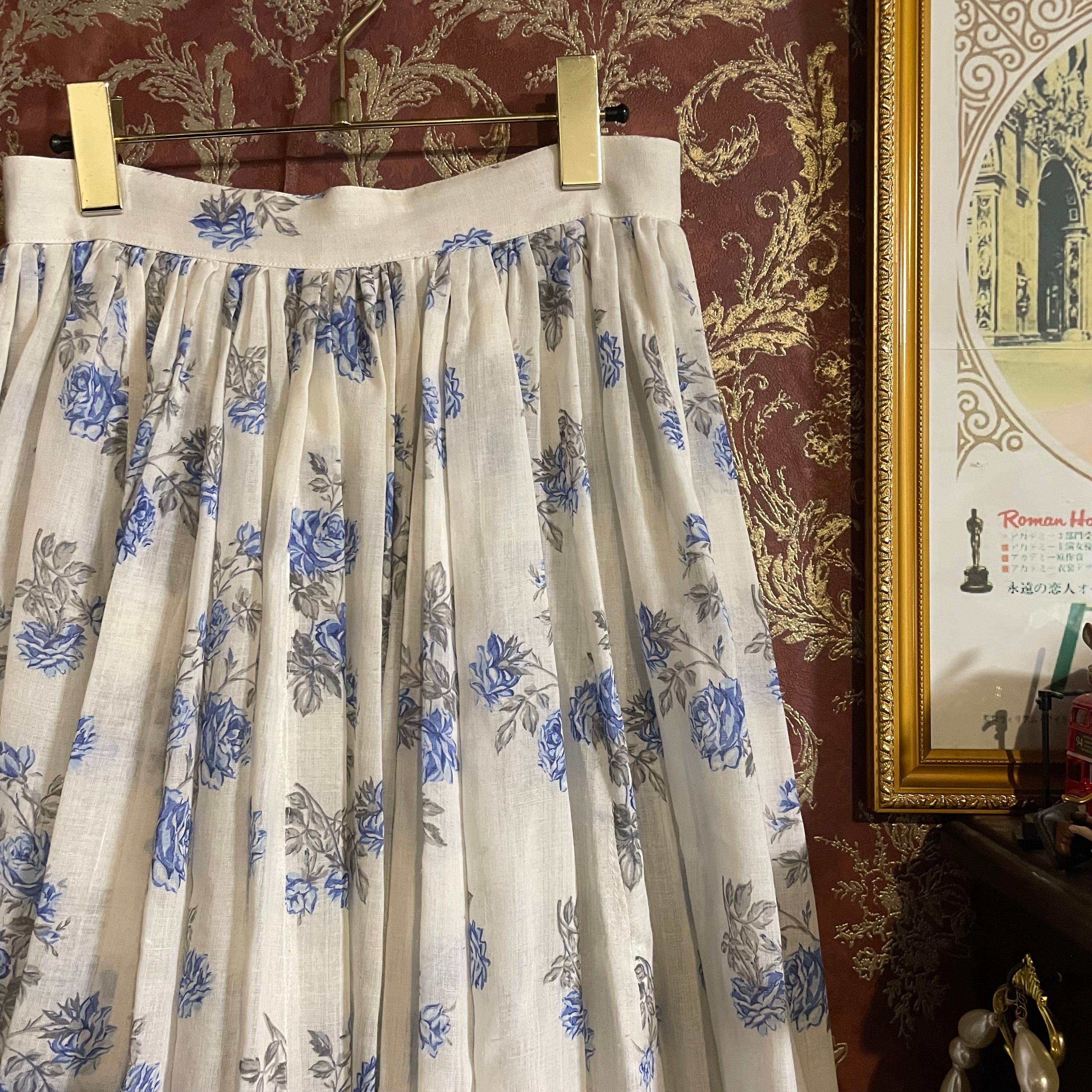 アイボリーがかったホワイトの生地に、やさしいブルーのローズが散りばめられたクラシカルなフラワースカートです。