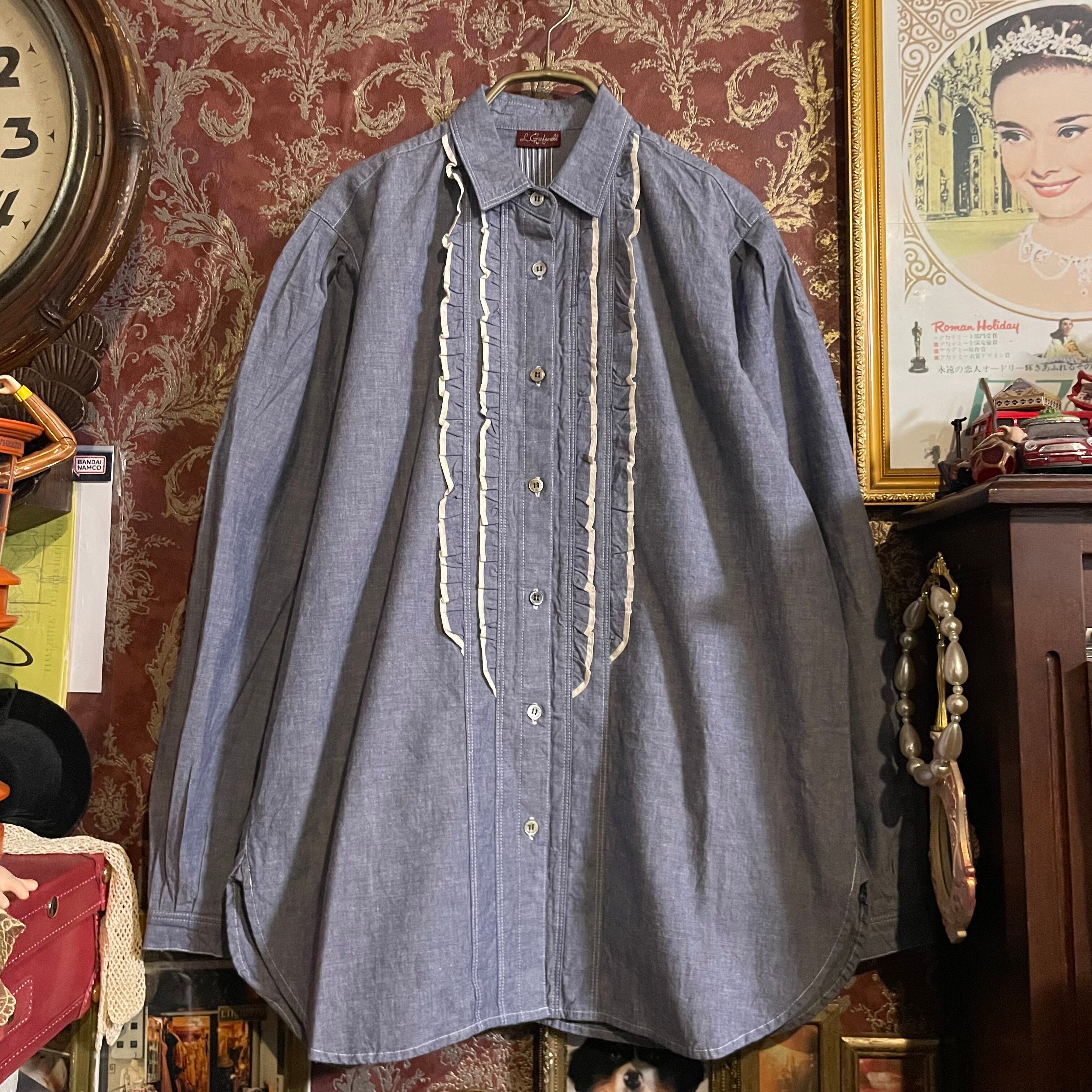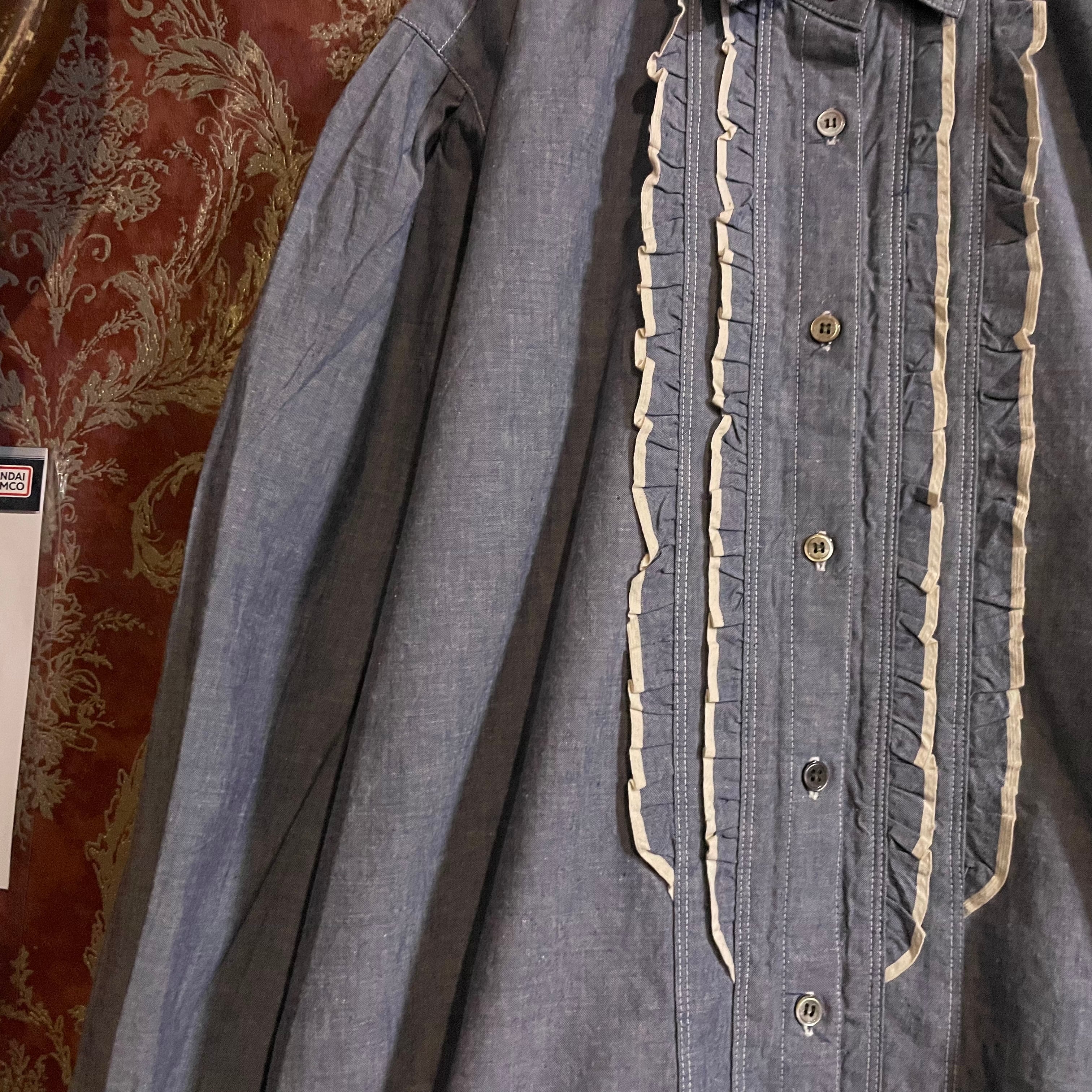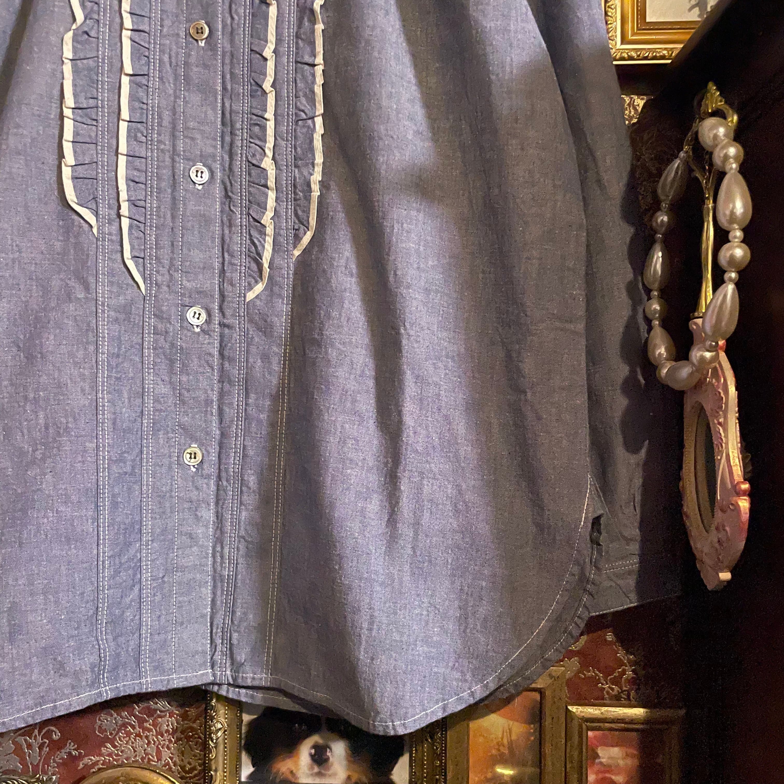 落ち着いたブルーのコットン生地に、フロントのフリルデザインが映えるクラシカルなブラウスです。