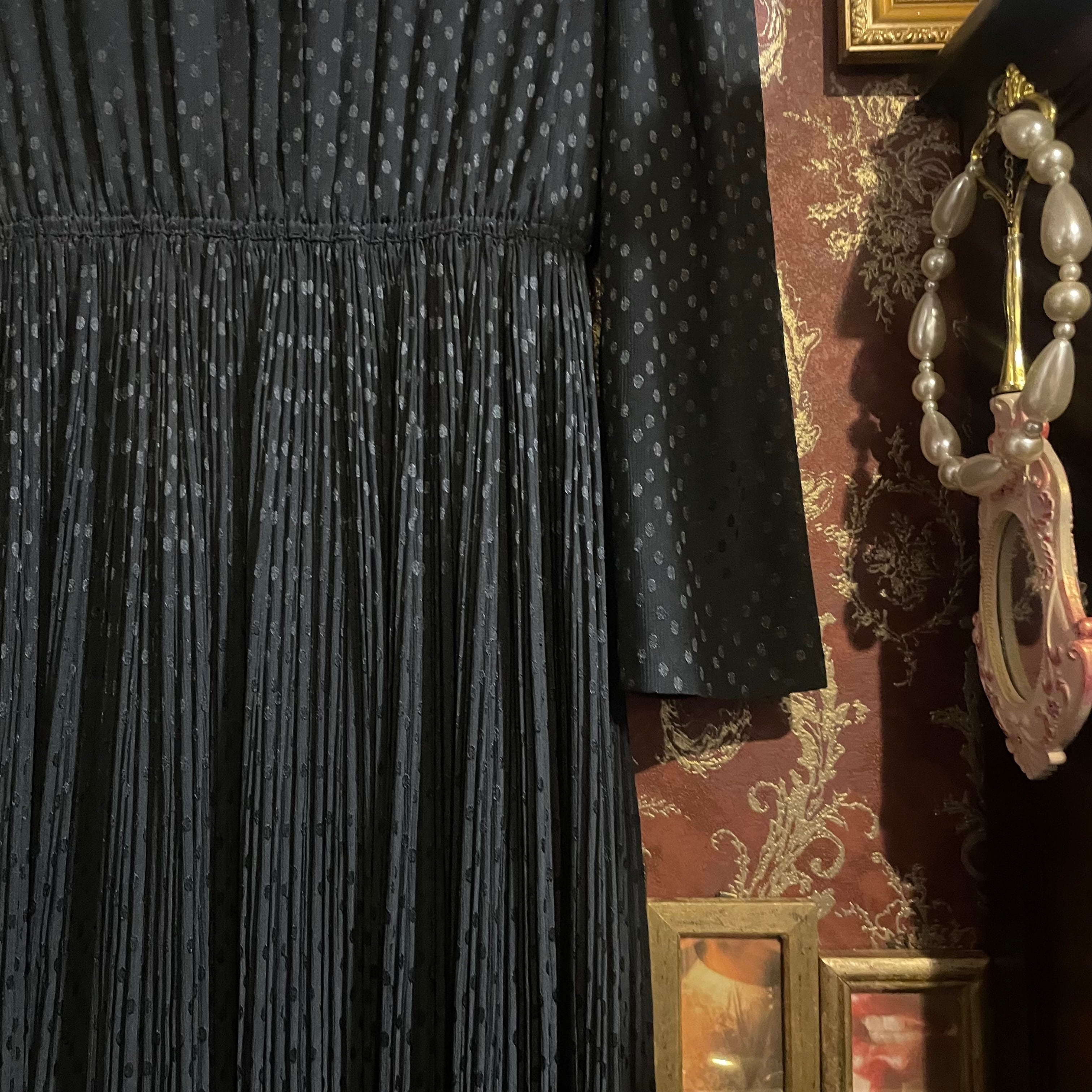 落ち着いたブラックカラーに、さりげなく浮かび上がるドット柄が印象的なロングワンピースです。