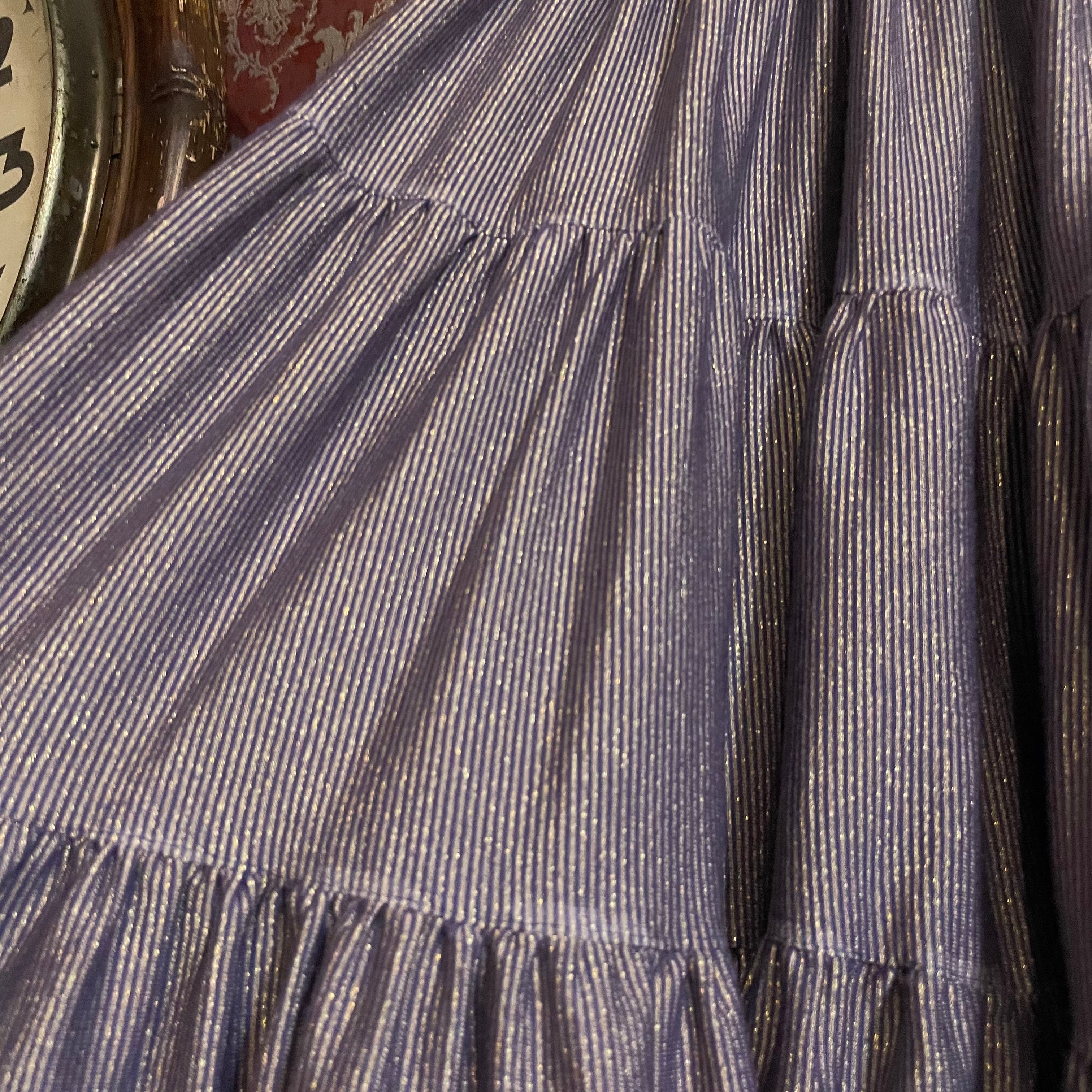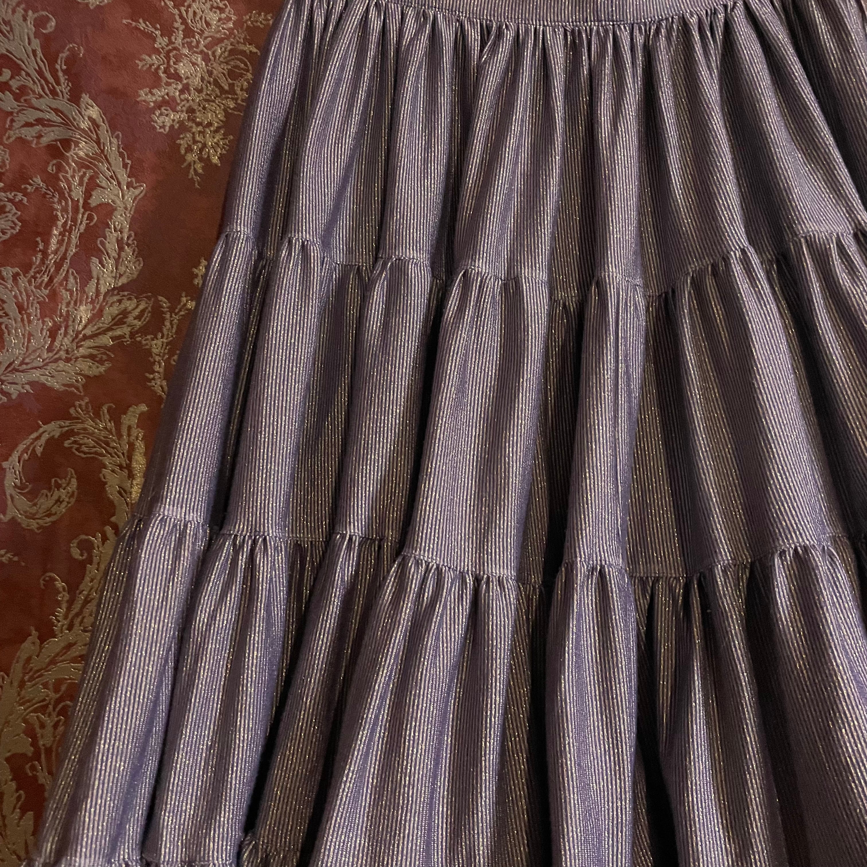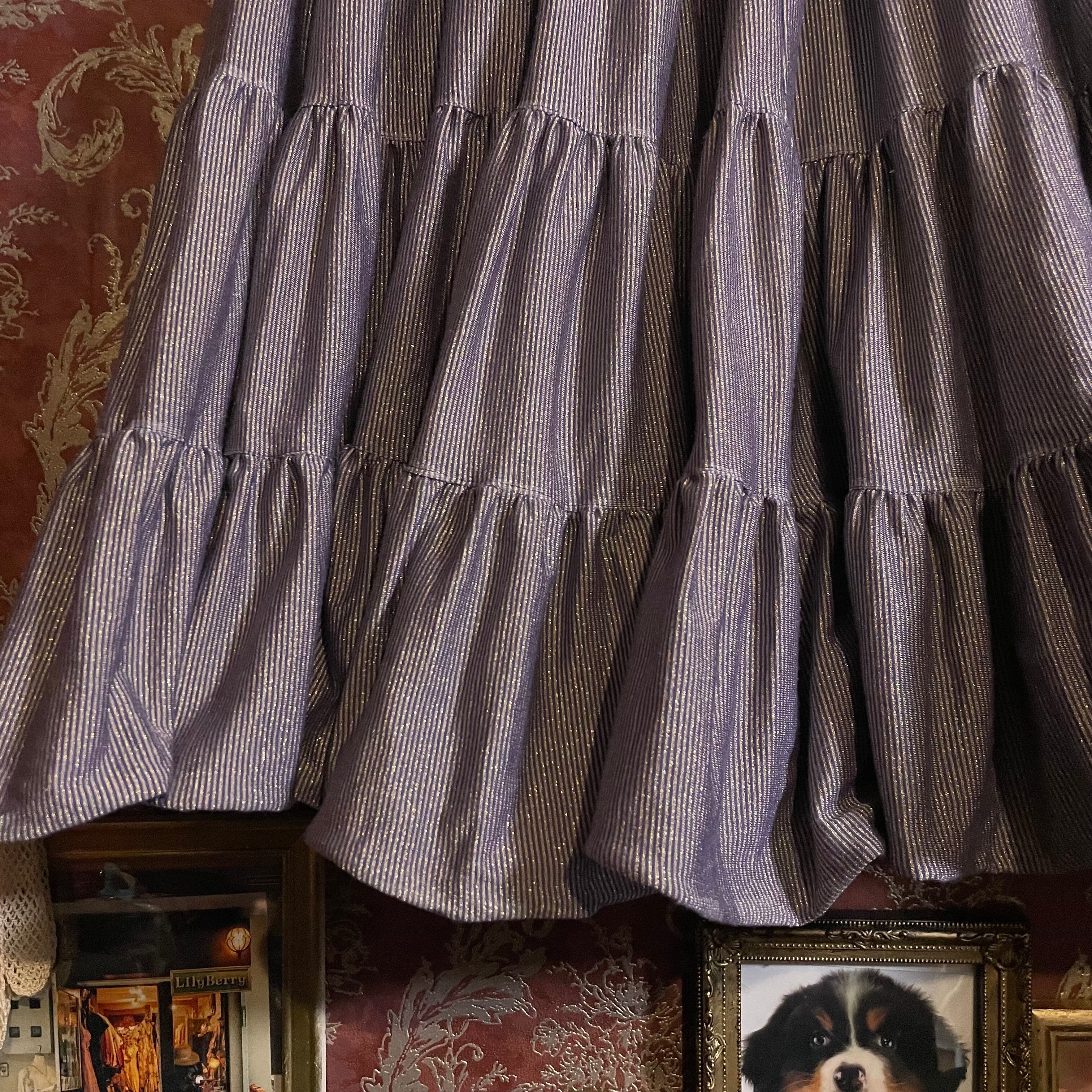 深みのあるラベンダー(#6e527d)に、ゴールドの細かなストライプがきらりと映えるティアードスカートです。