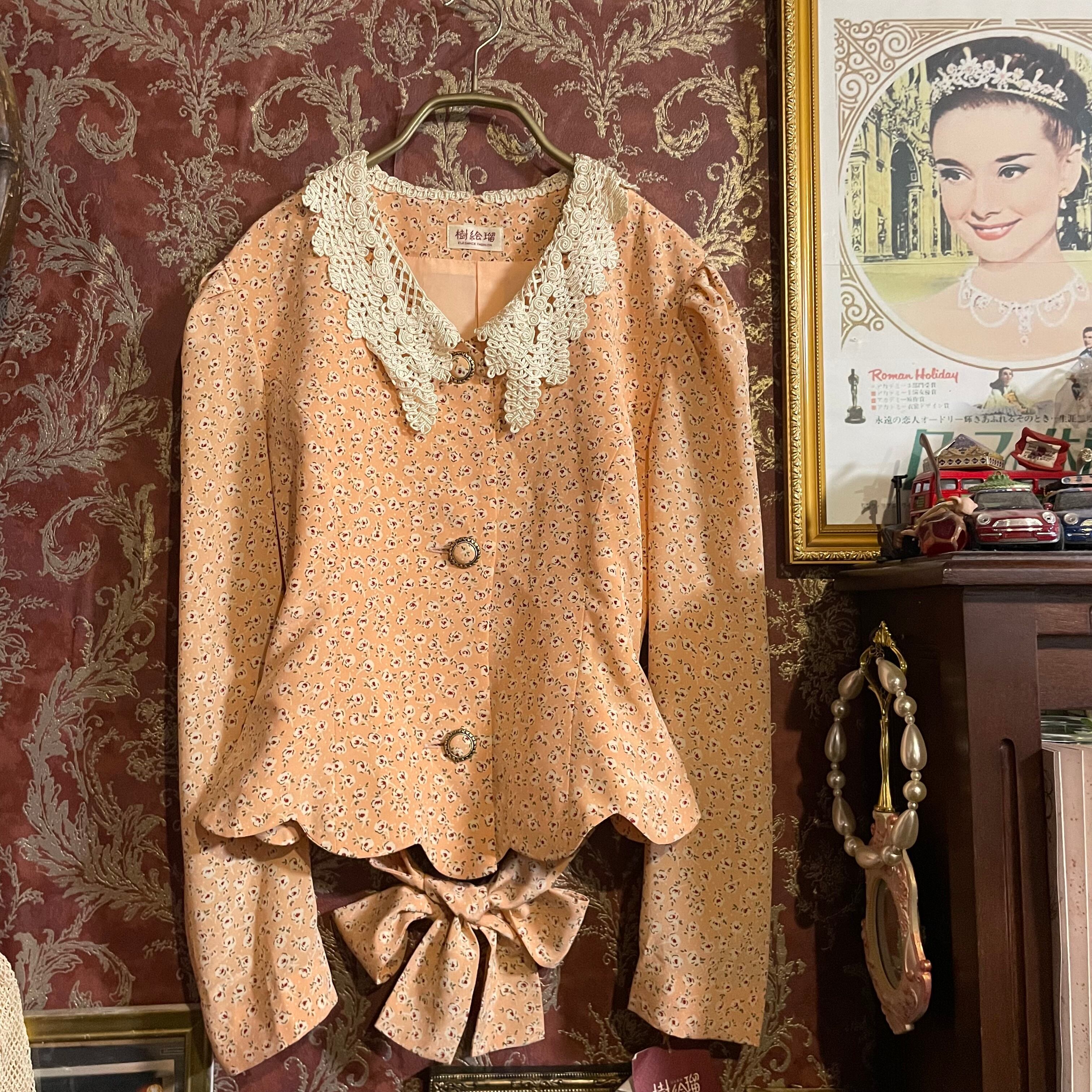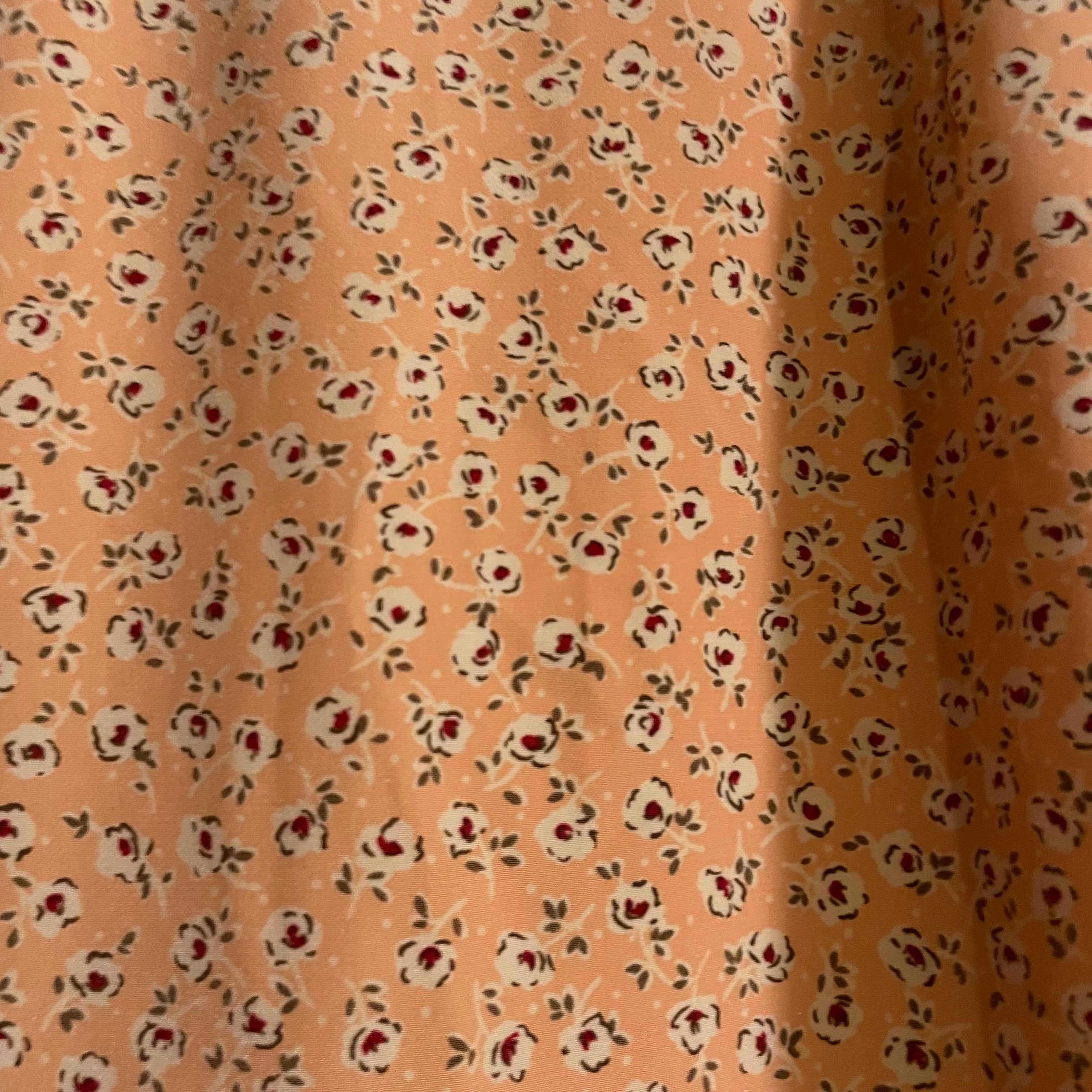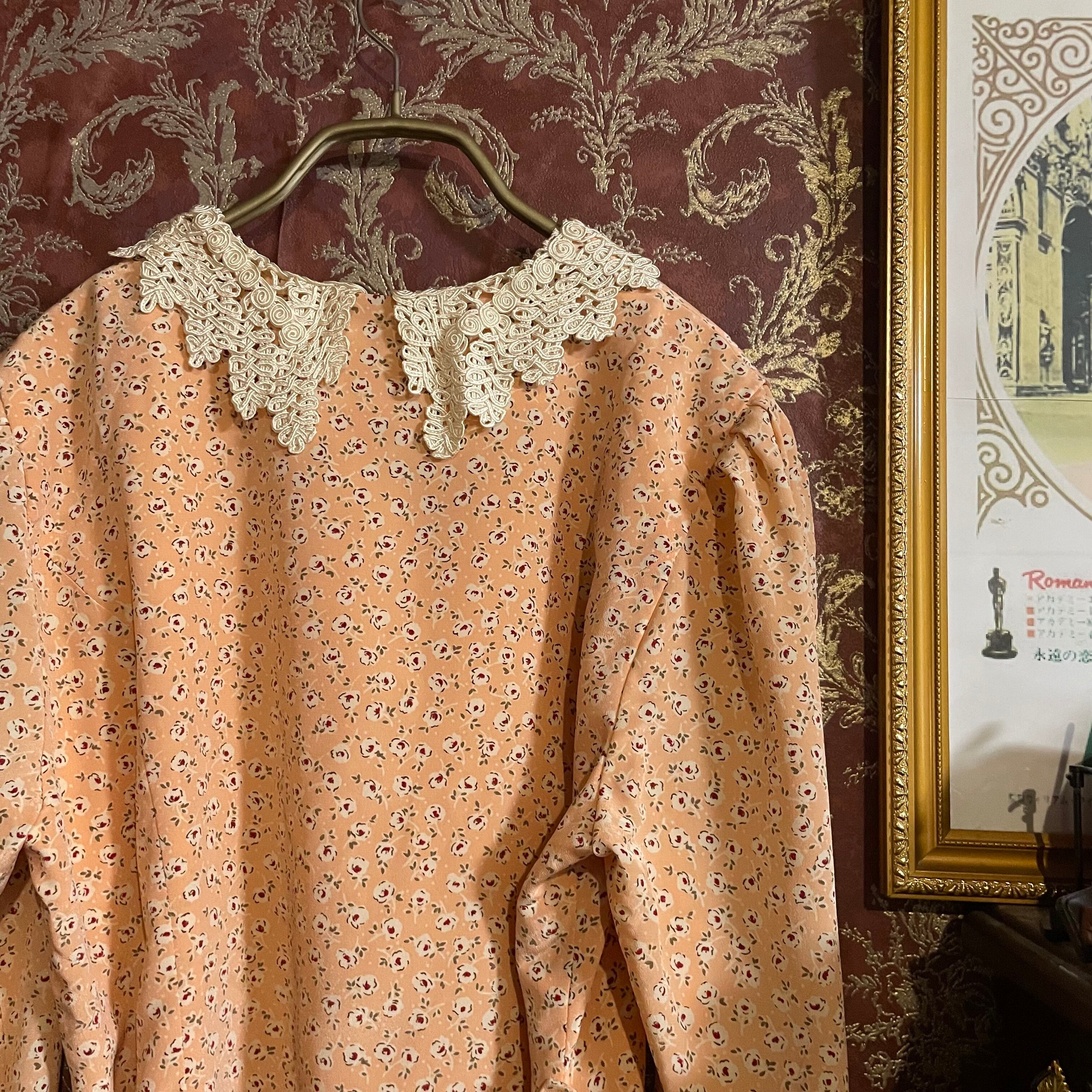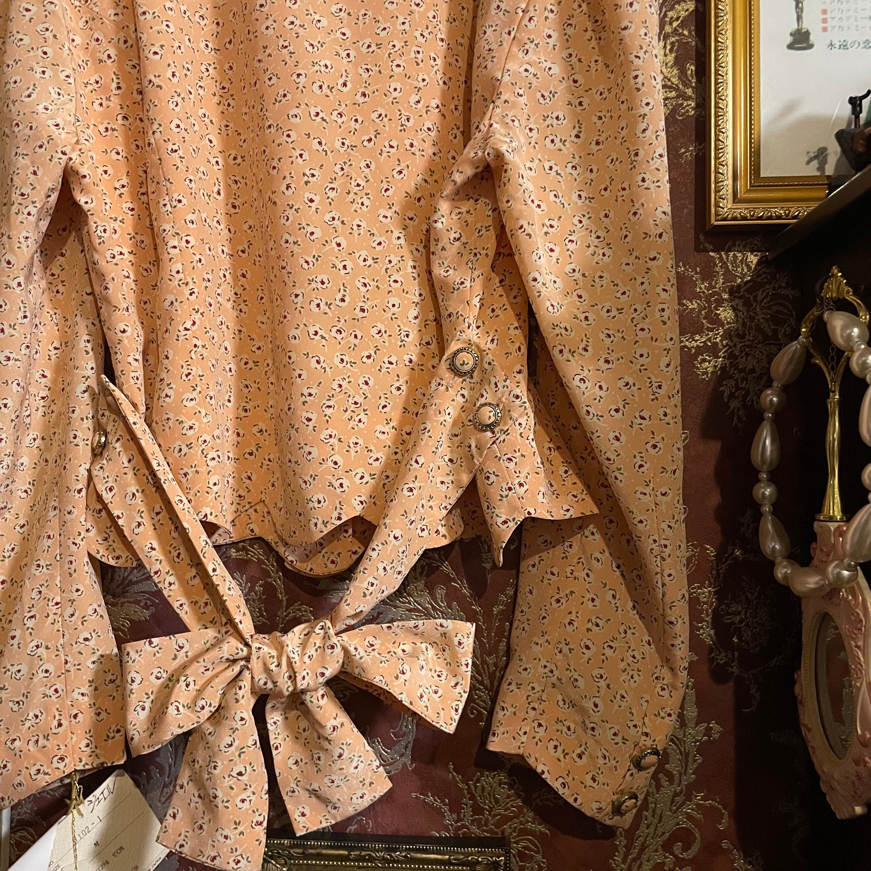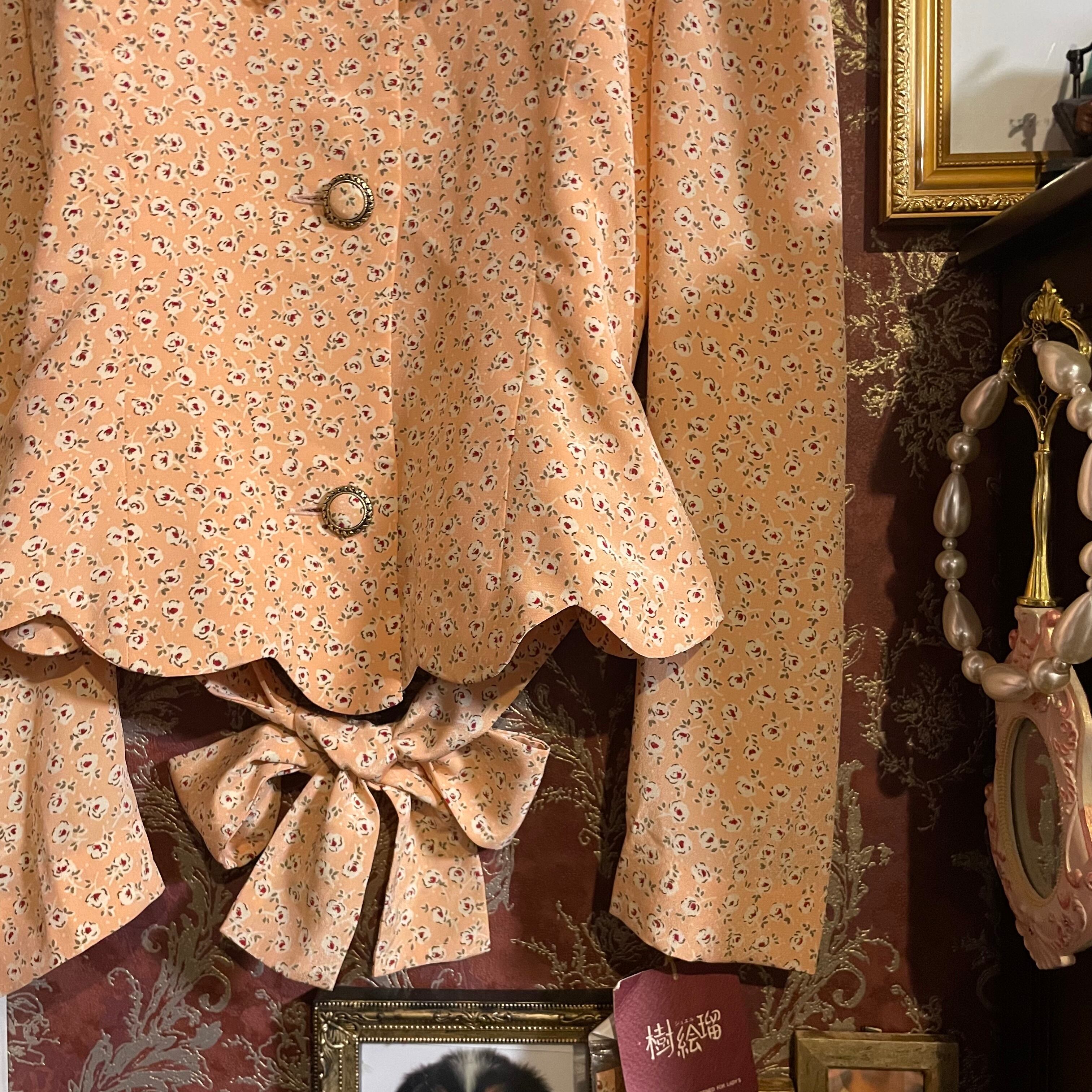落ち着いたサーモンピンク(#d6876d)カラーに、小さなローズモチーフが散りばめられた上品なセットアップです。