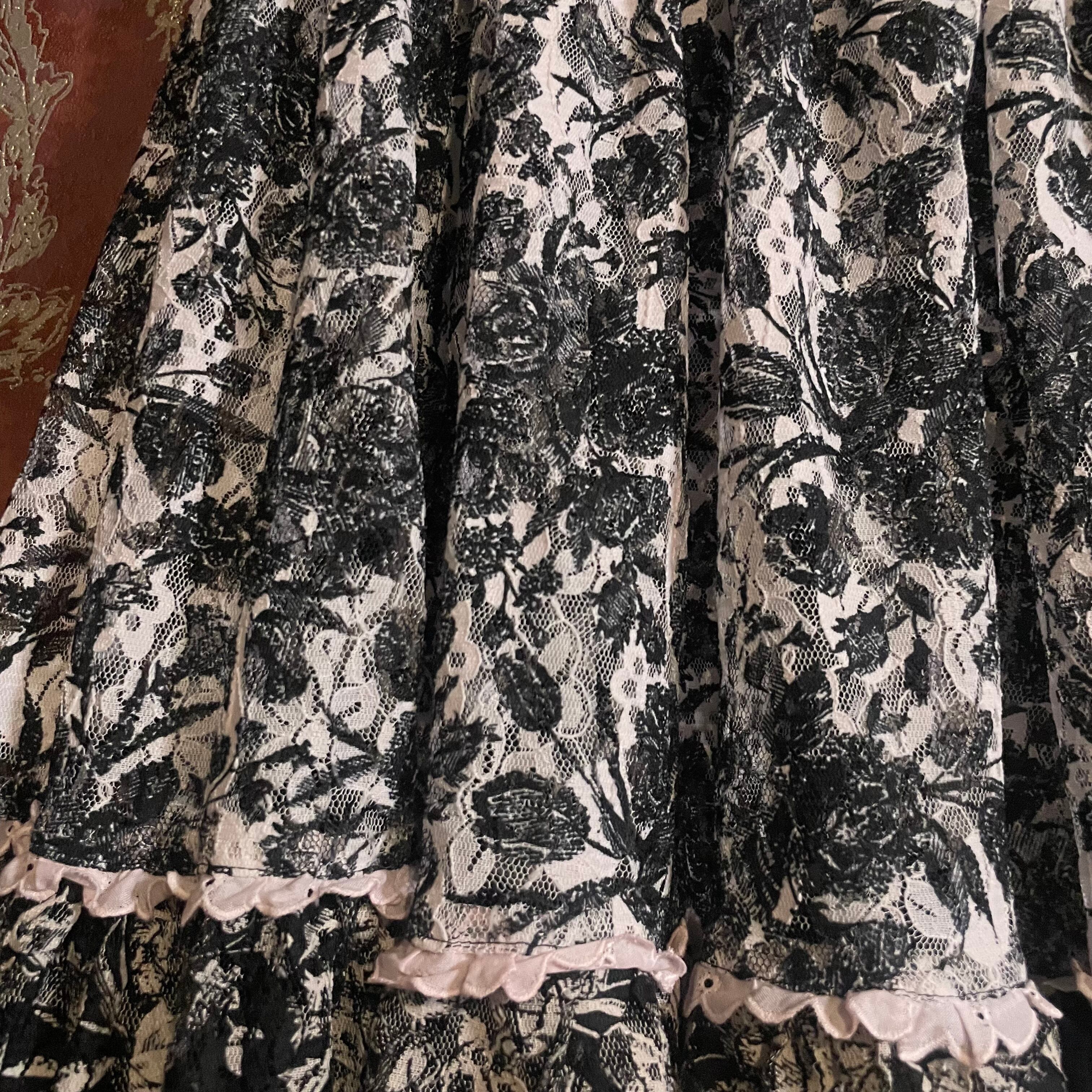ブラックとホワイトの繊細なレースにプリントされた柄が印象的で、落ち着いた色合いの中にも華やかさを感じさせるデザインです。