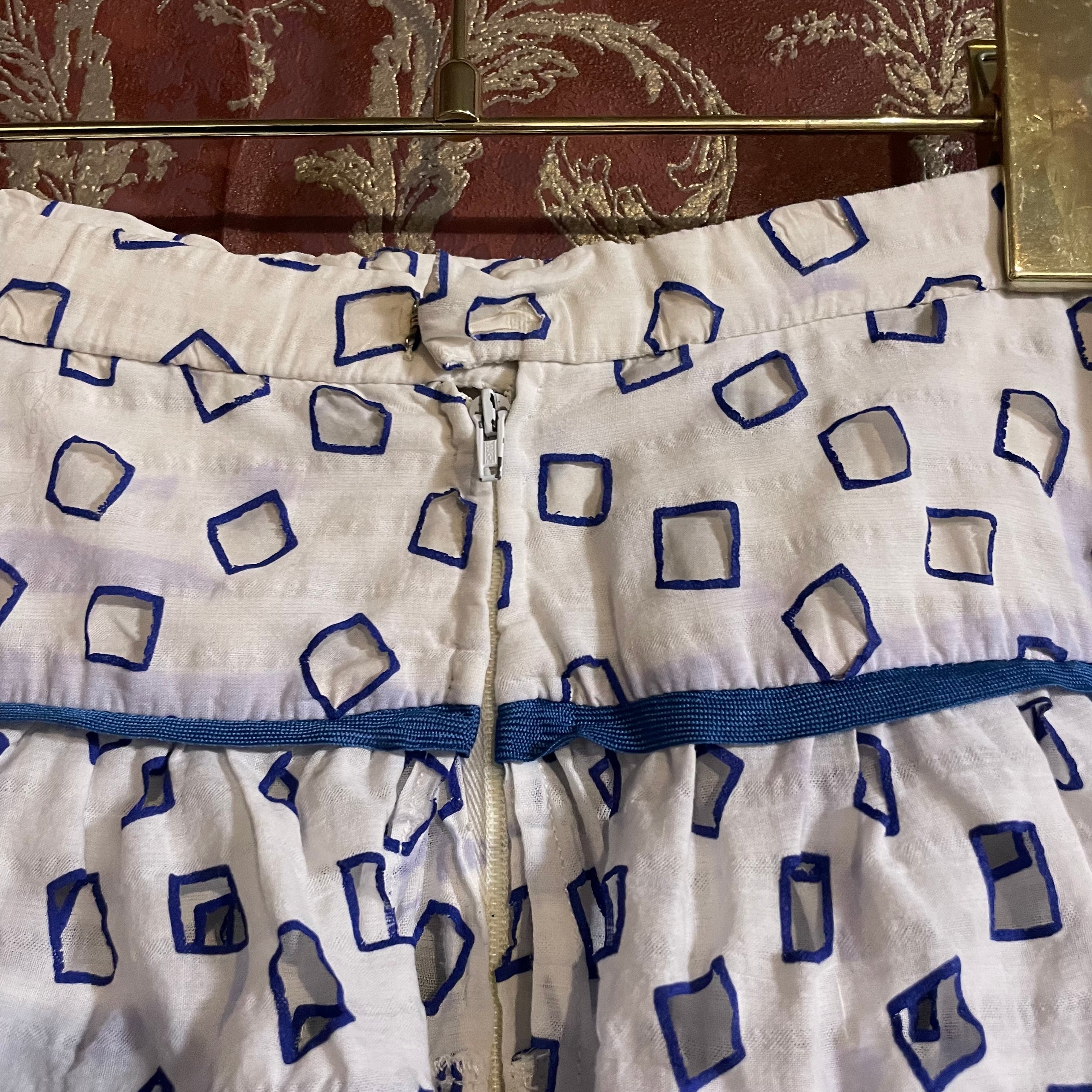 ナチュラルなホワイトの生地に、コバルトブルーのスクエアモチーフが散りばめられた軽やかなテキスタイルです。