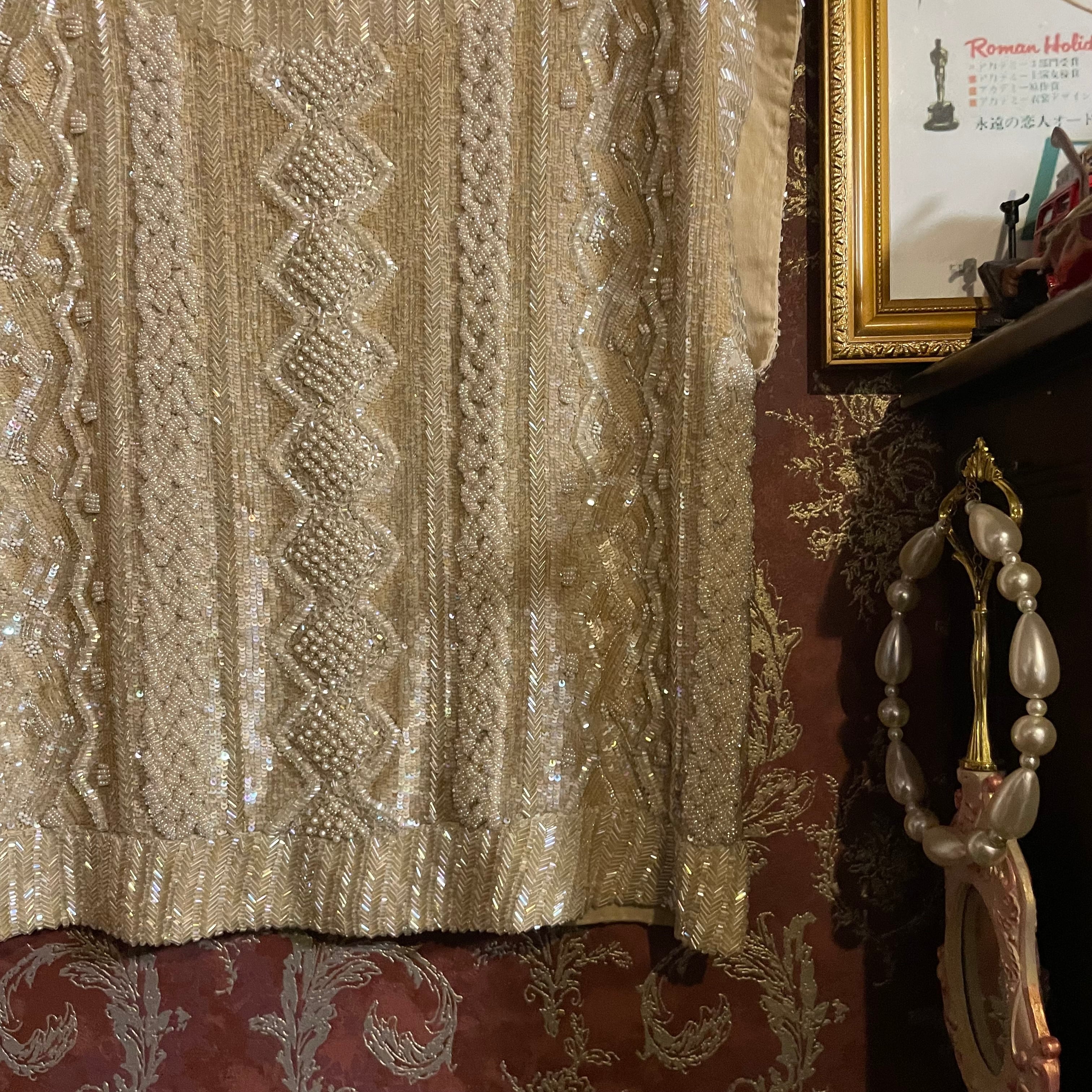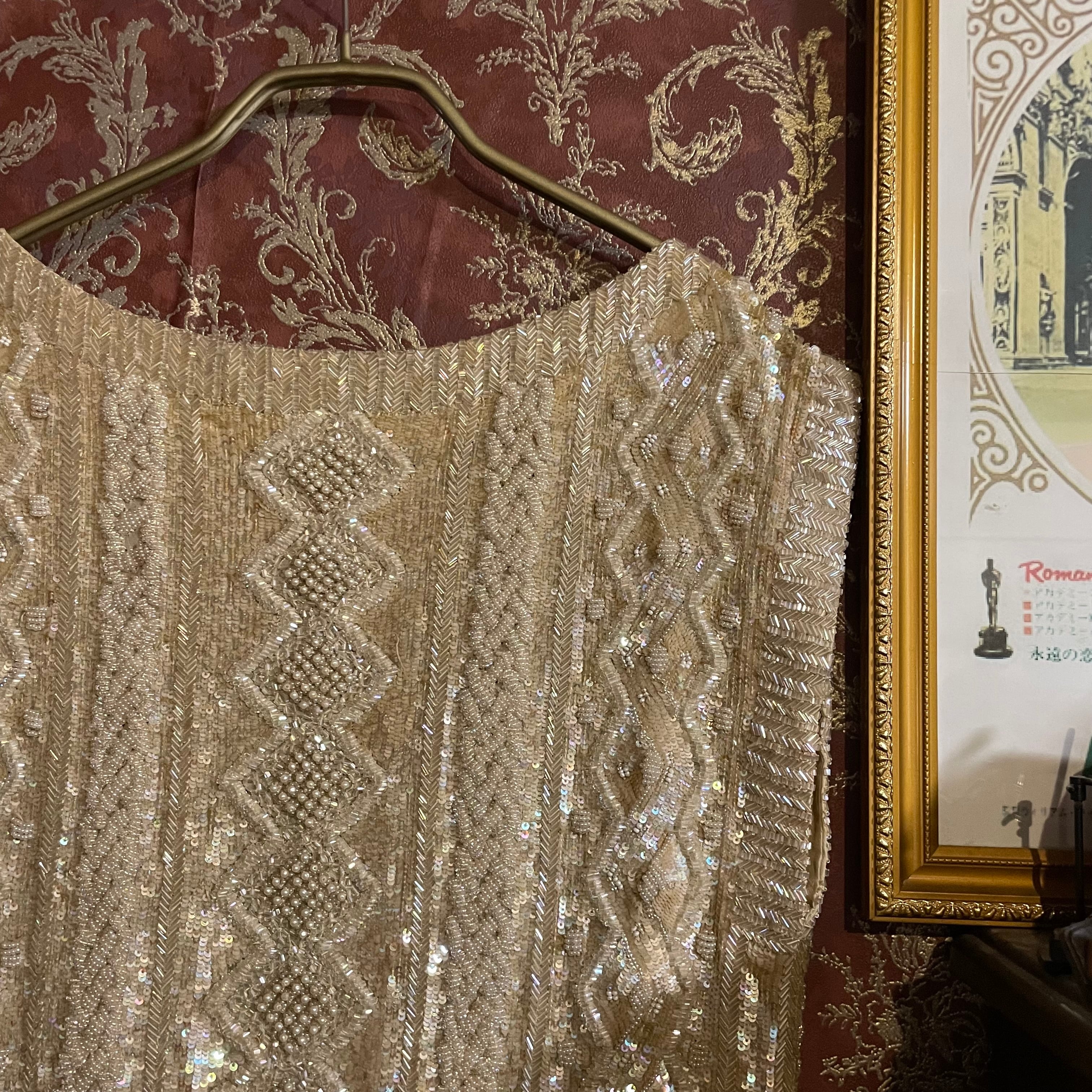 ベースは上質なシルク生地で、やわらかなベージュカラーの上に、ビーズやスパンコールを贅沢に使った刺繍が全面に施されています。
