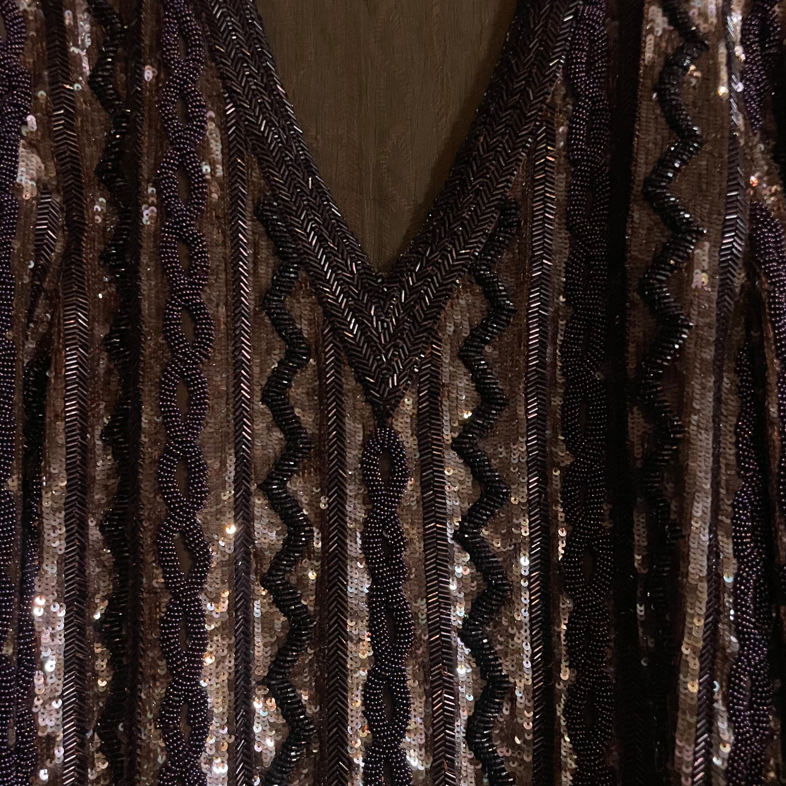ベースは上質なシルク生地に、ビーズやスパンコールを贅沢に使った刺繍が全面に施されています。