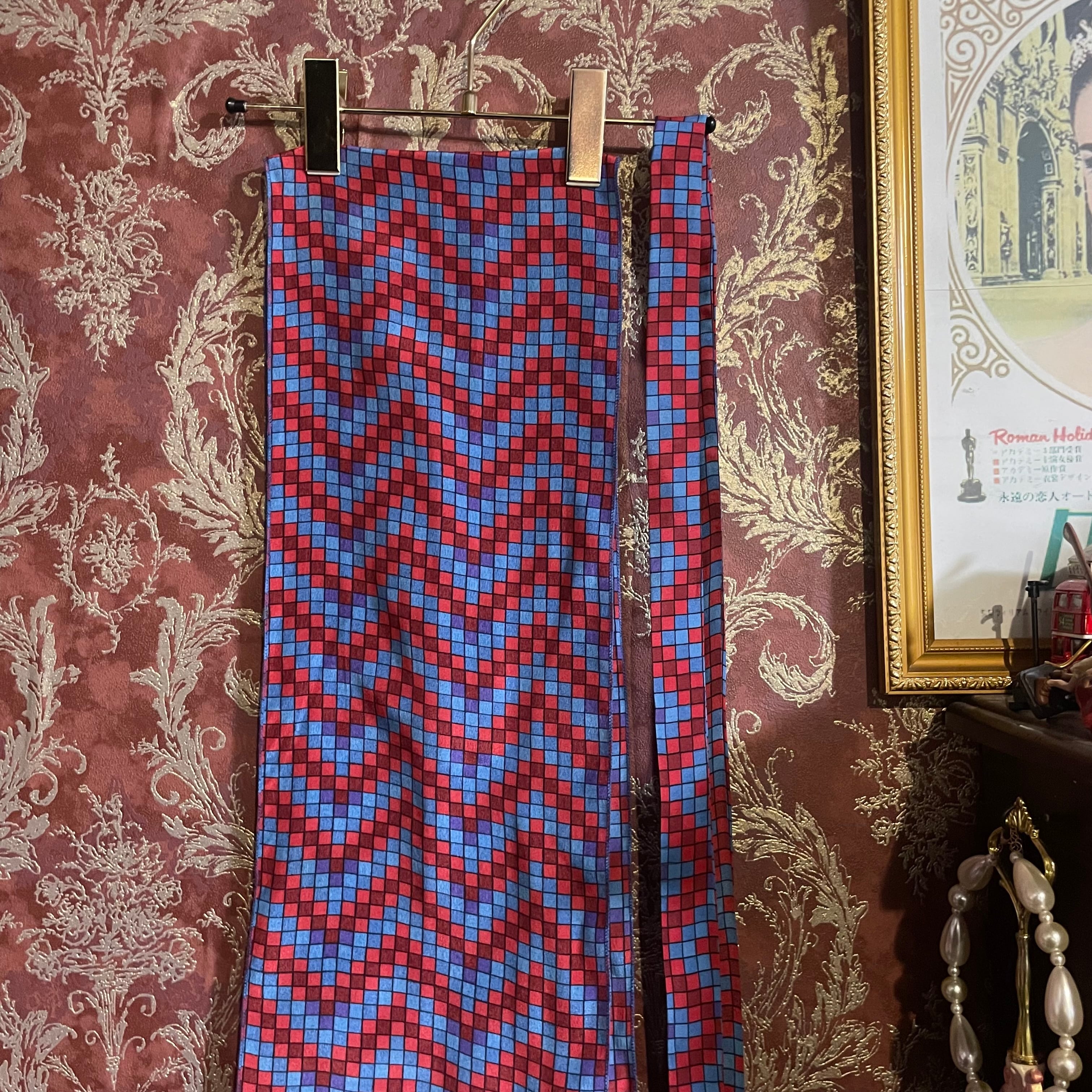 赤とブルーで構成された幾何学的なジグザグ模様が印象的で、レトロでアートのようなデザインが魅力。大きめの襟もクラシカルな雰囲気を引き立てています。