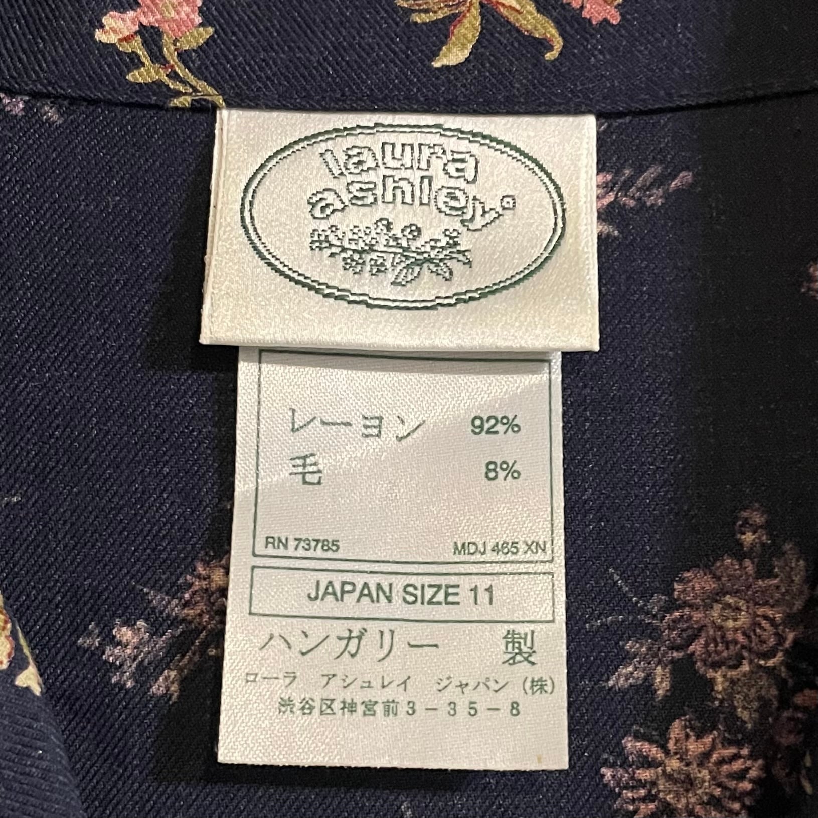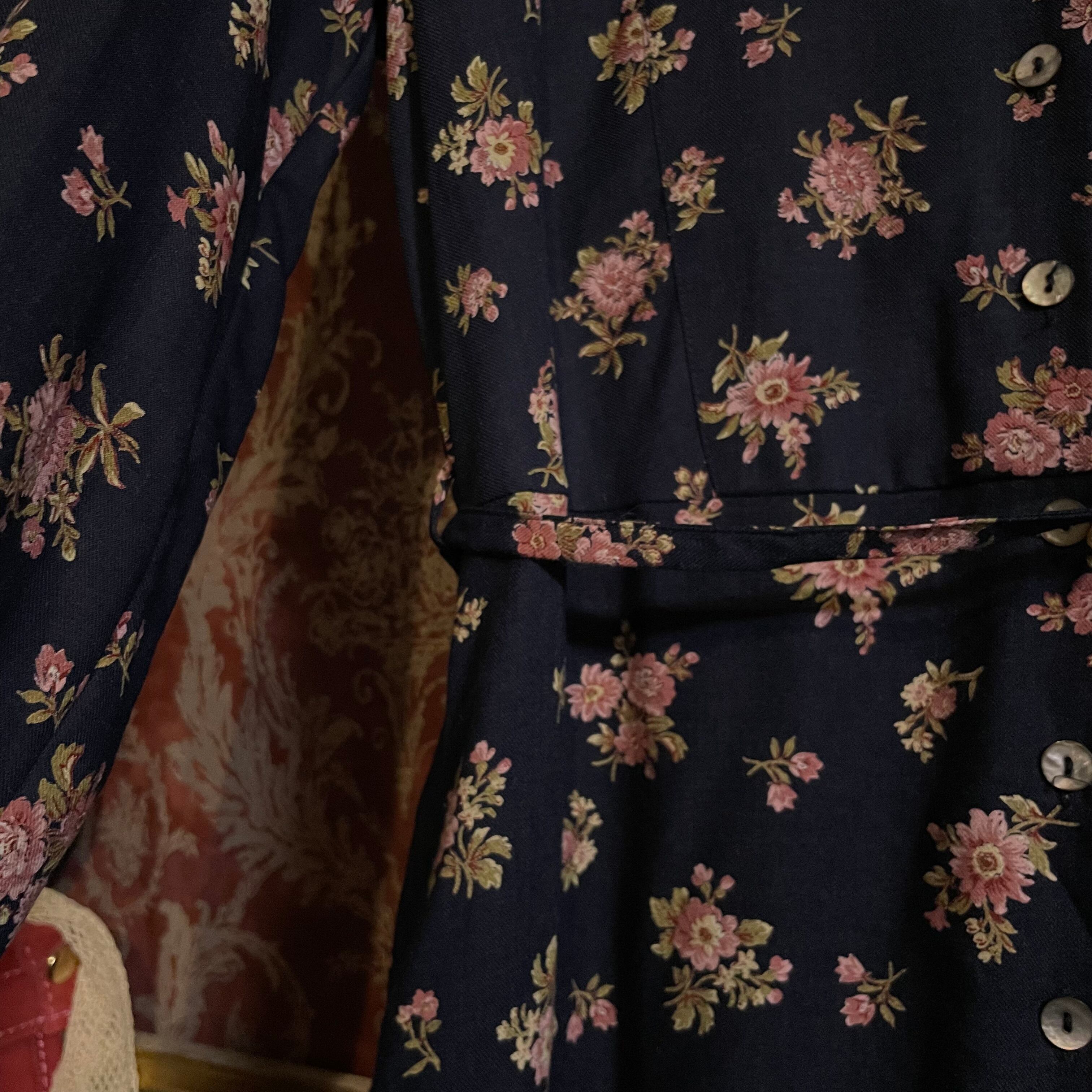 ネイビーをベースに、繊細なフラワープリントが広がるLaura Ashleyのロングワンピースです。