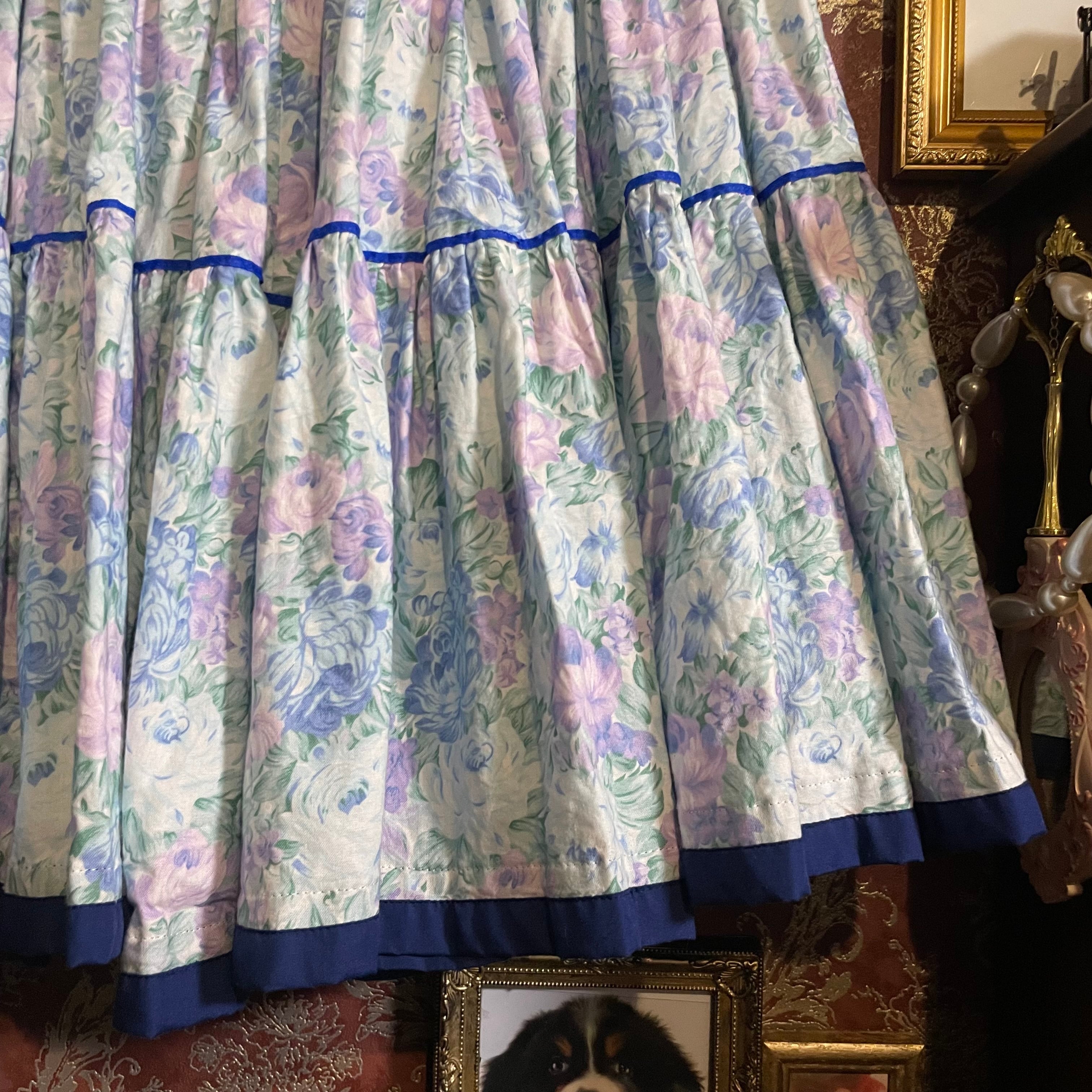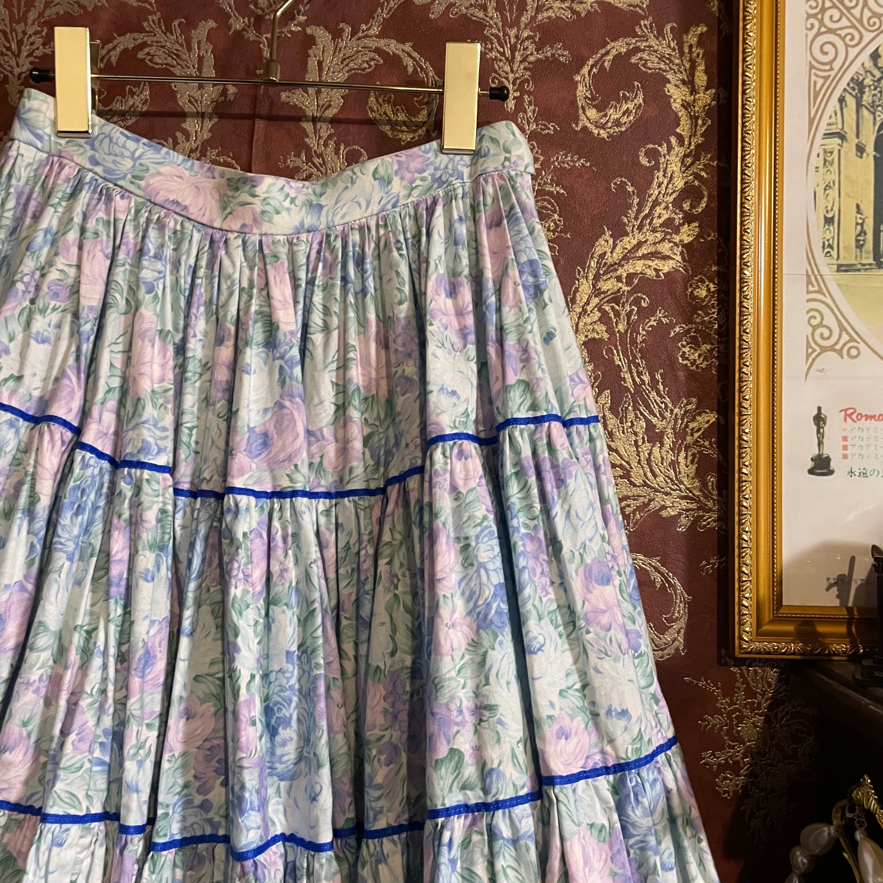 淡い花柄が優しく広がる、ティアードデザインのフレアスカートです。