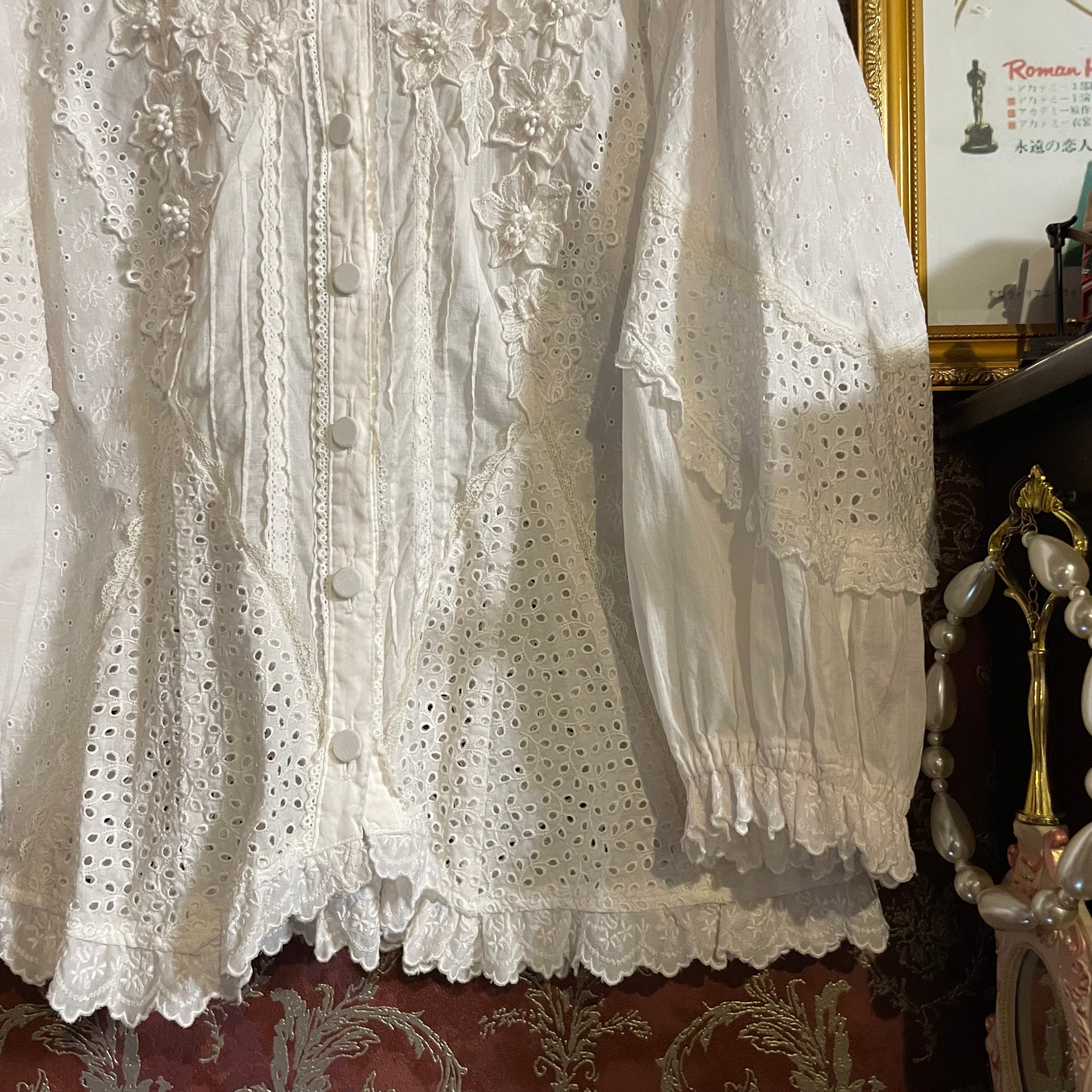 やさしいホワイトカラーに、たっぷりとあしらわれたアイレットレースと立体的なフラワーモチーフが目を惹く一着です。