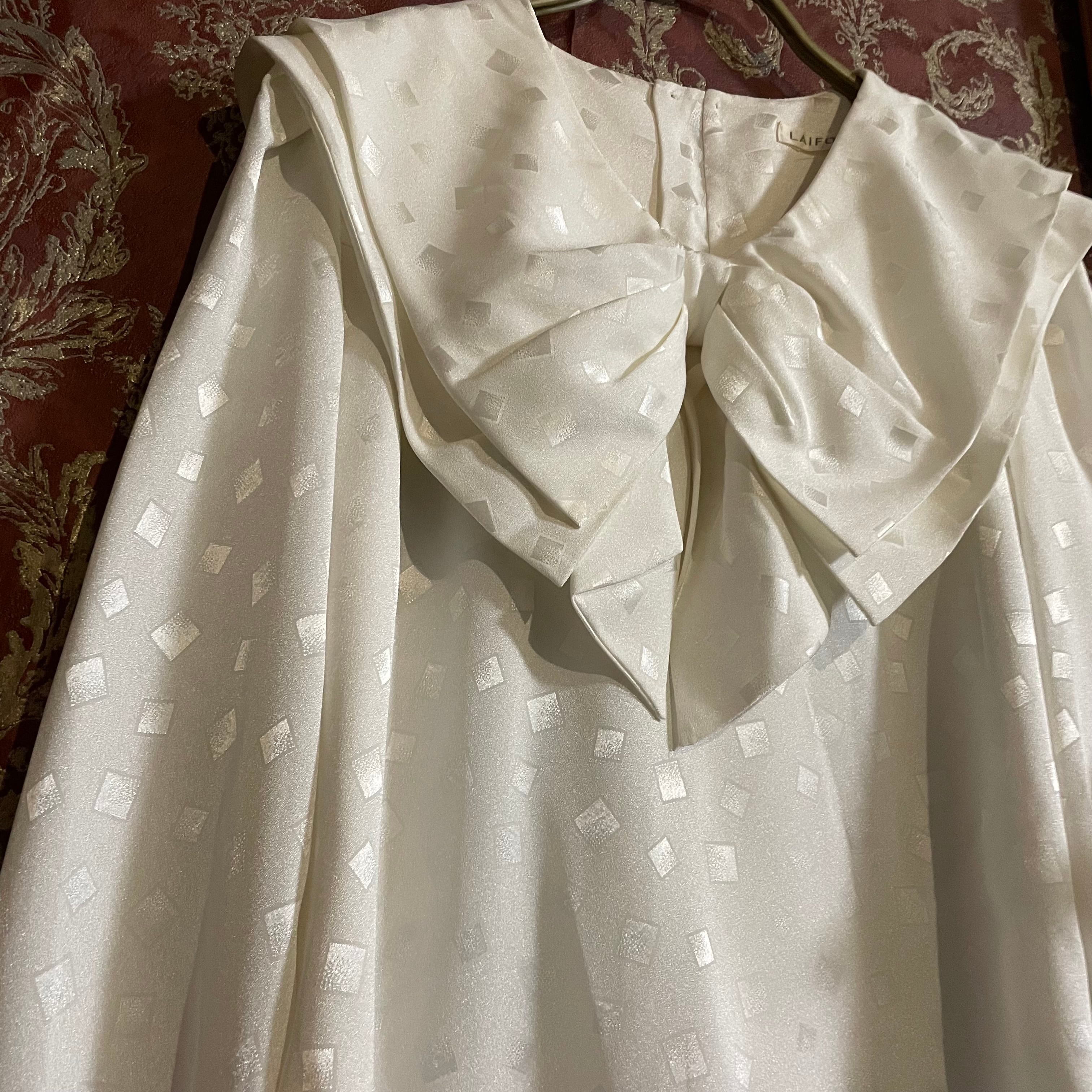 襟はリボンのようなデザインで、甘さがありつつもすっきりとした印象に仕上がっています。