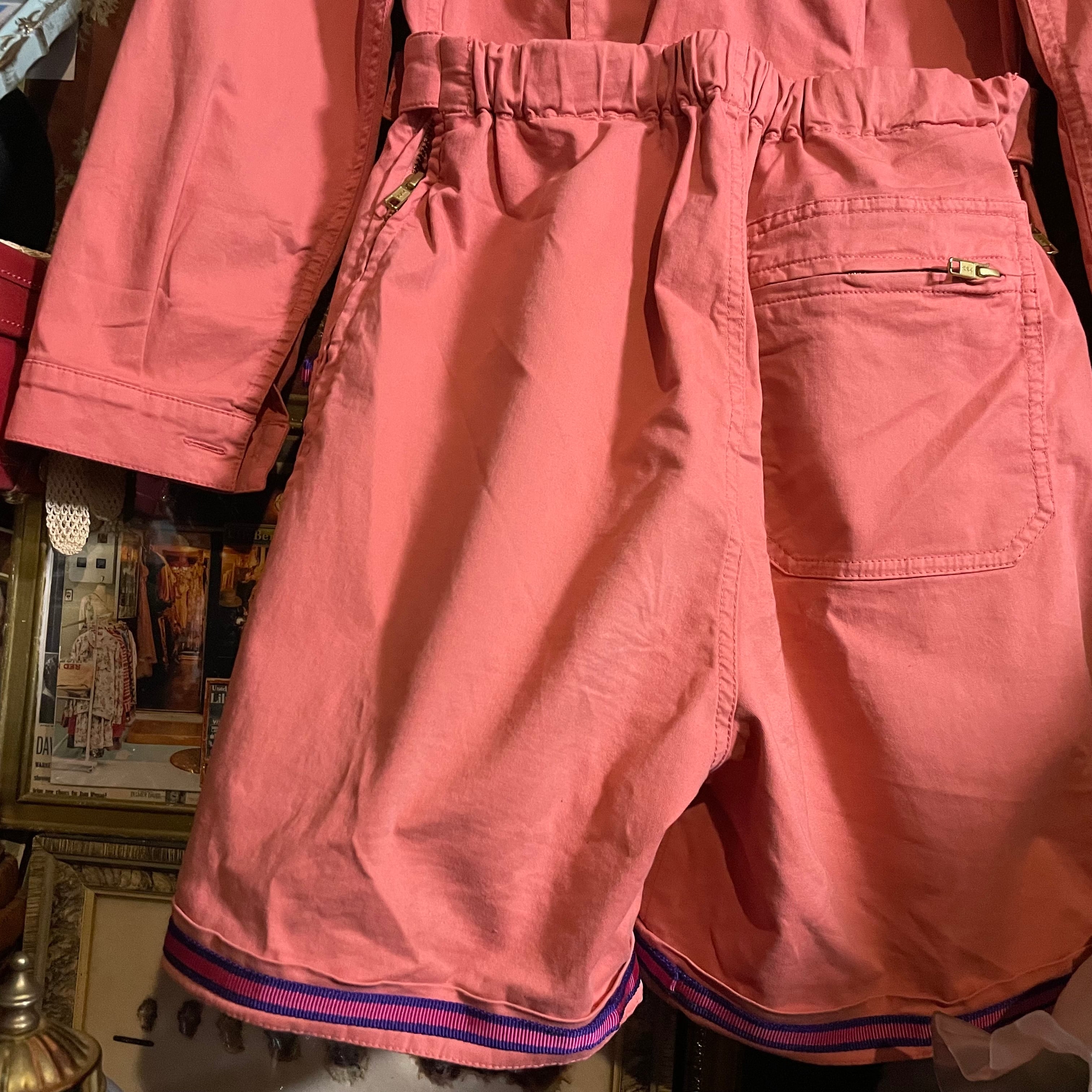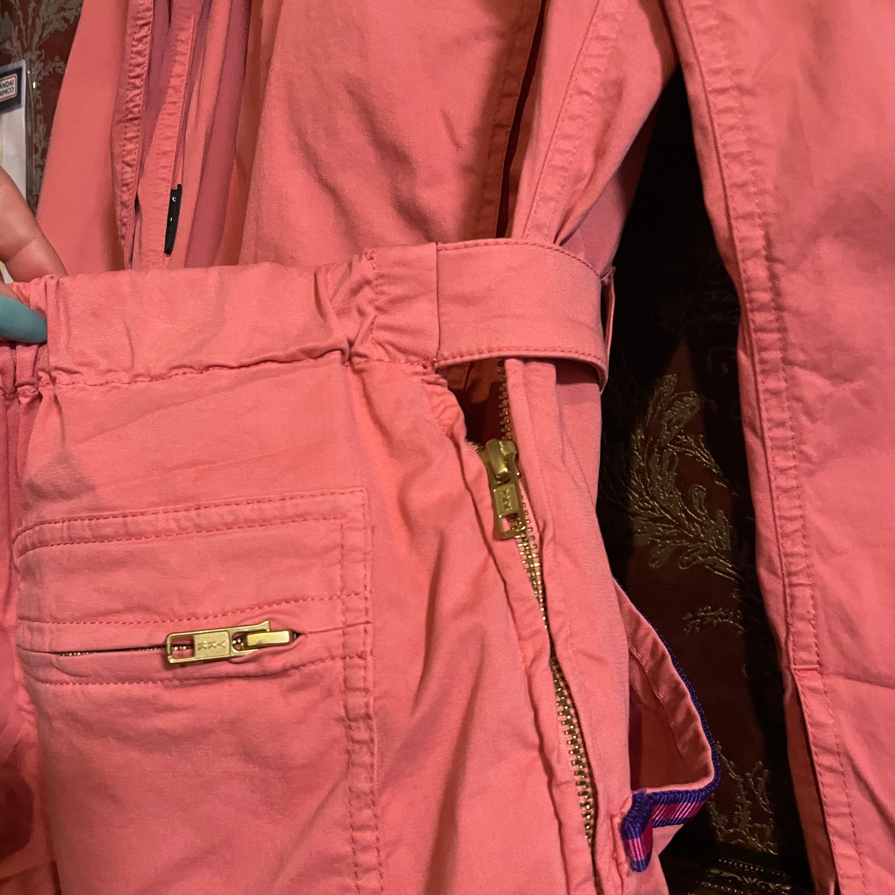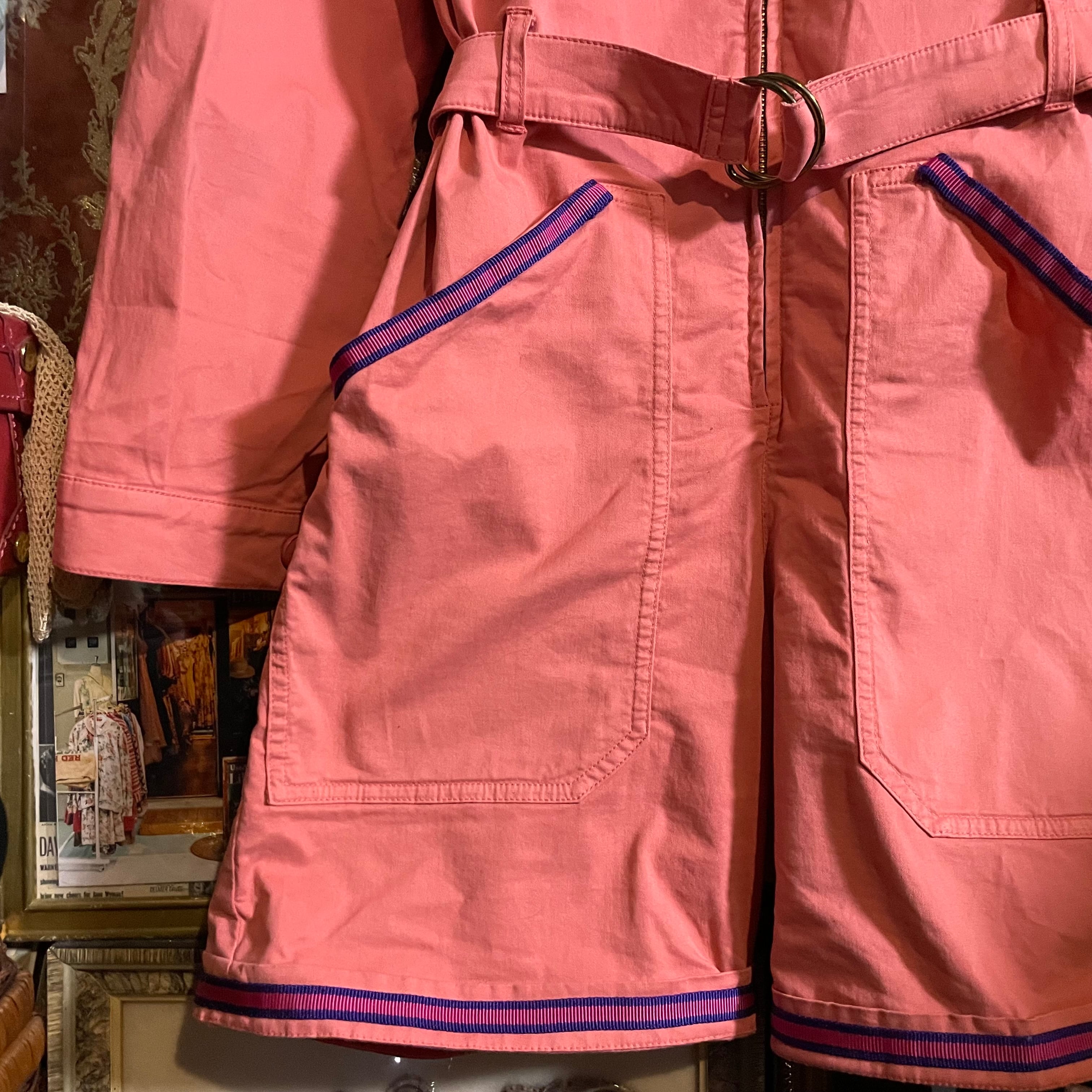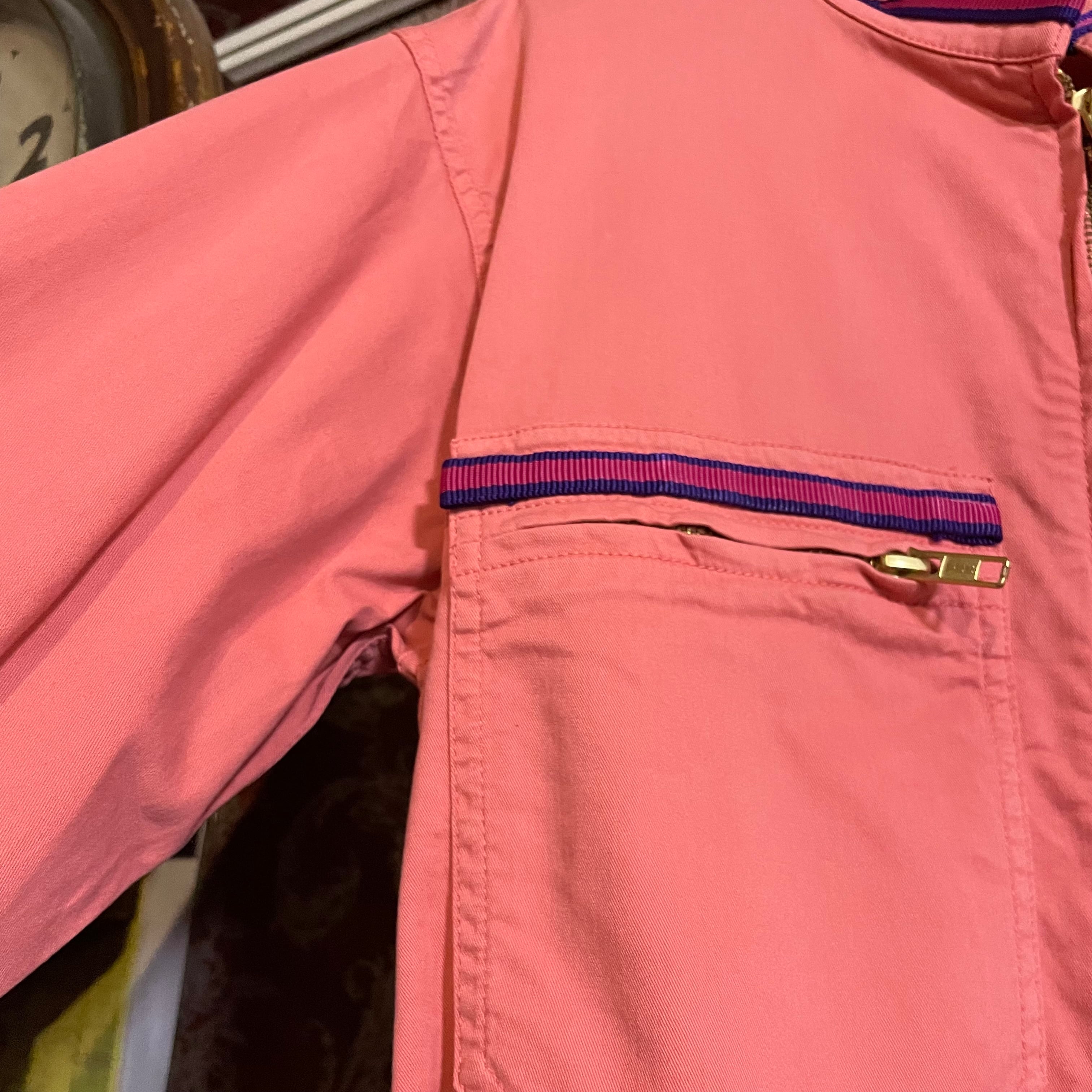 コーラルピンク(#f58282)をベースに、襟、ポケット、裾に施されたラインディテールがさりげないアクセントに。