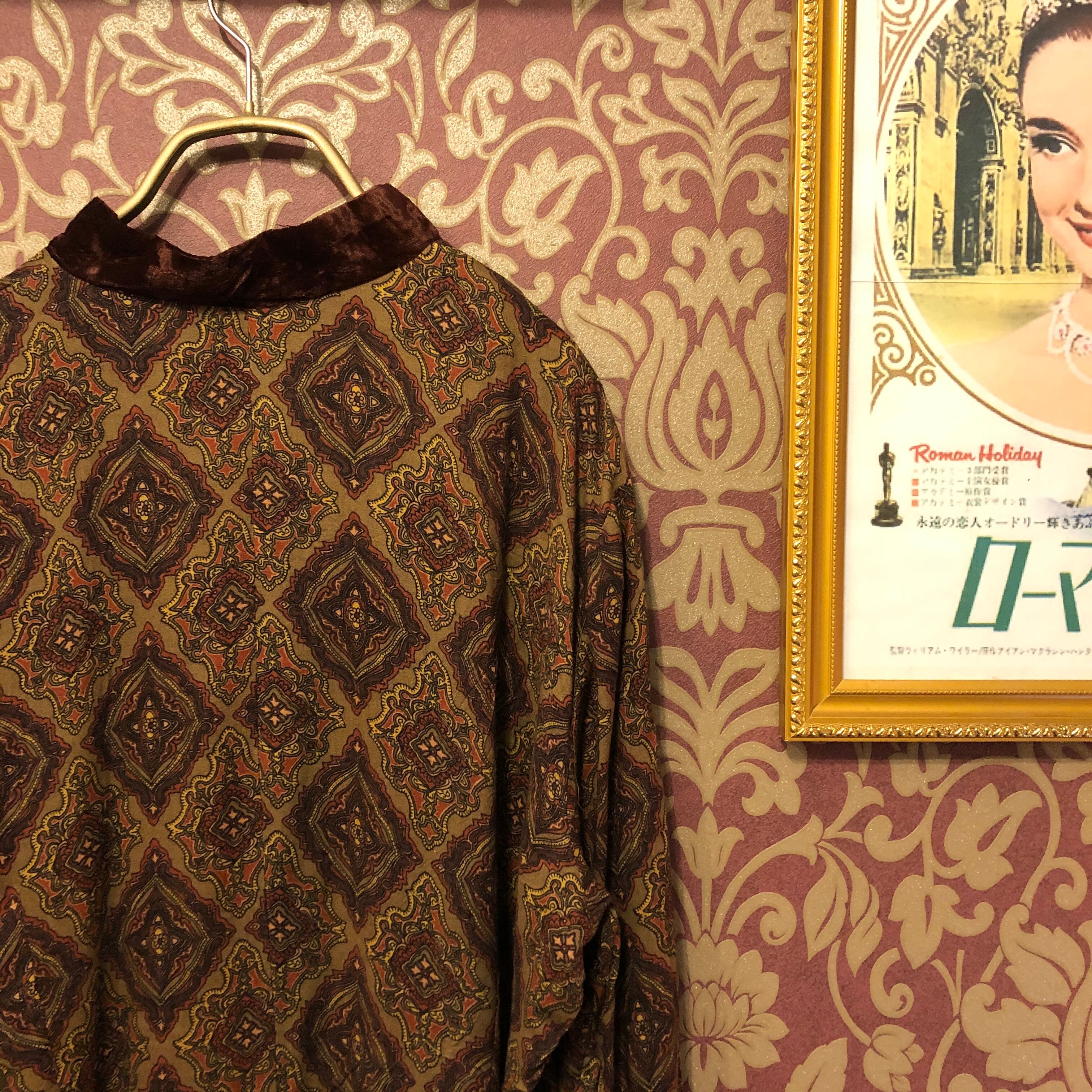 襟とボタンがベロアのペイズリー柄ワンピースです