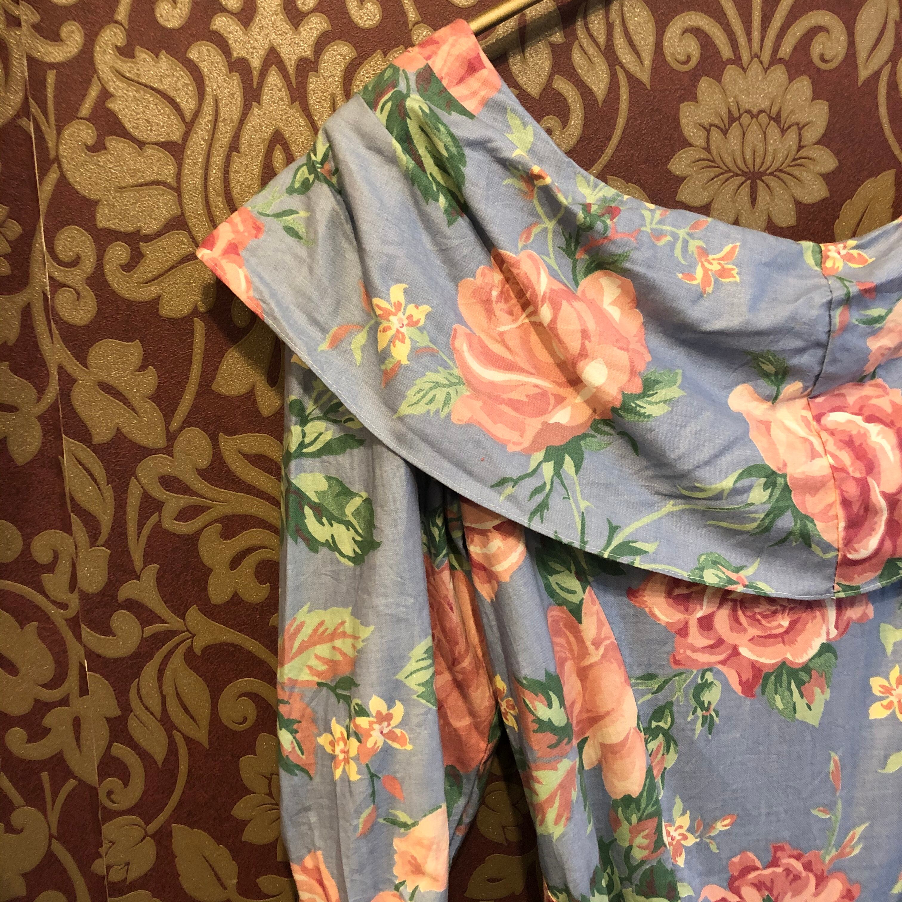 デコルテ部分がが開いた形で、ケープカラー、七部袖でローウエスト、ボリュームたっぷりなフレア