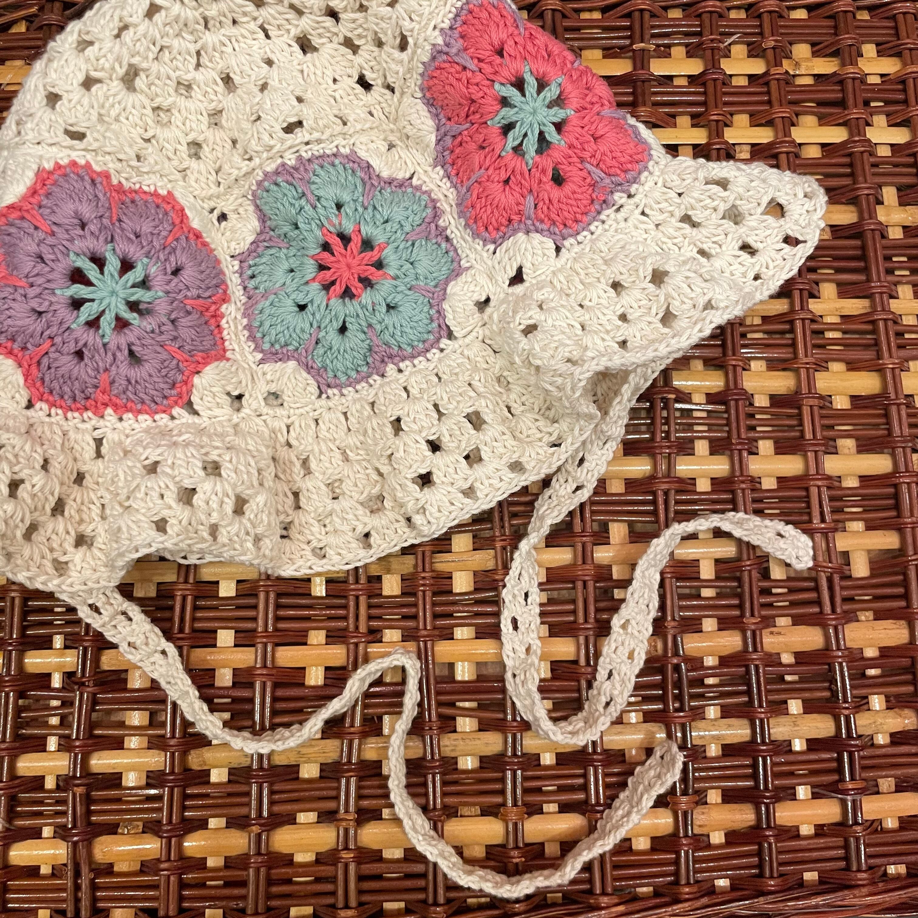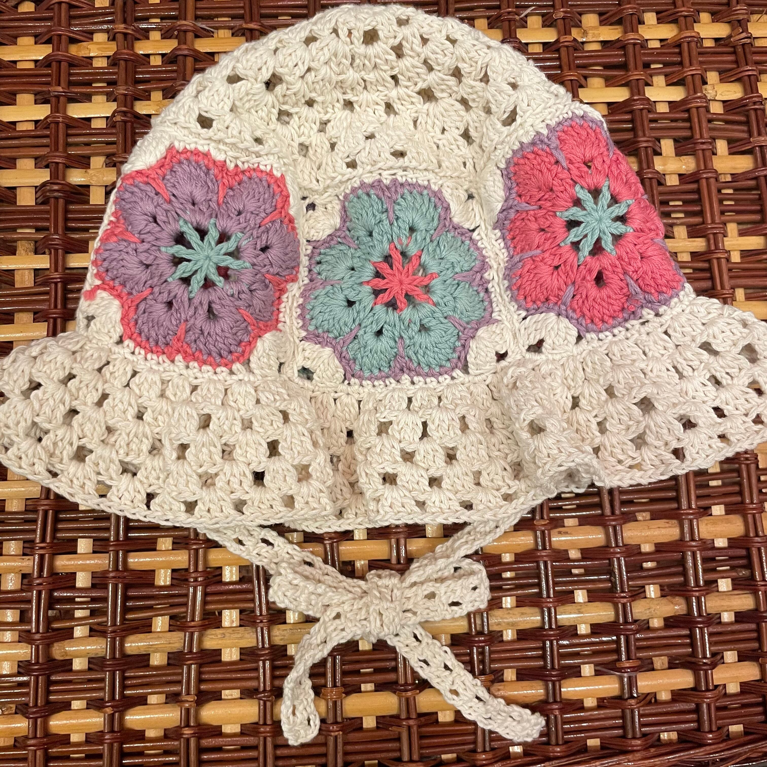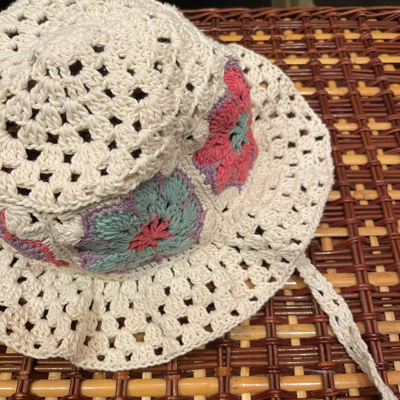 花のグラニースクエアのバケットハットタイプにあご紐が付いています。