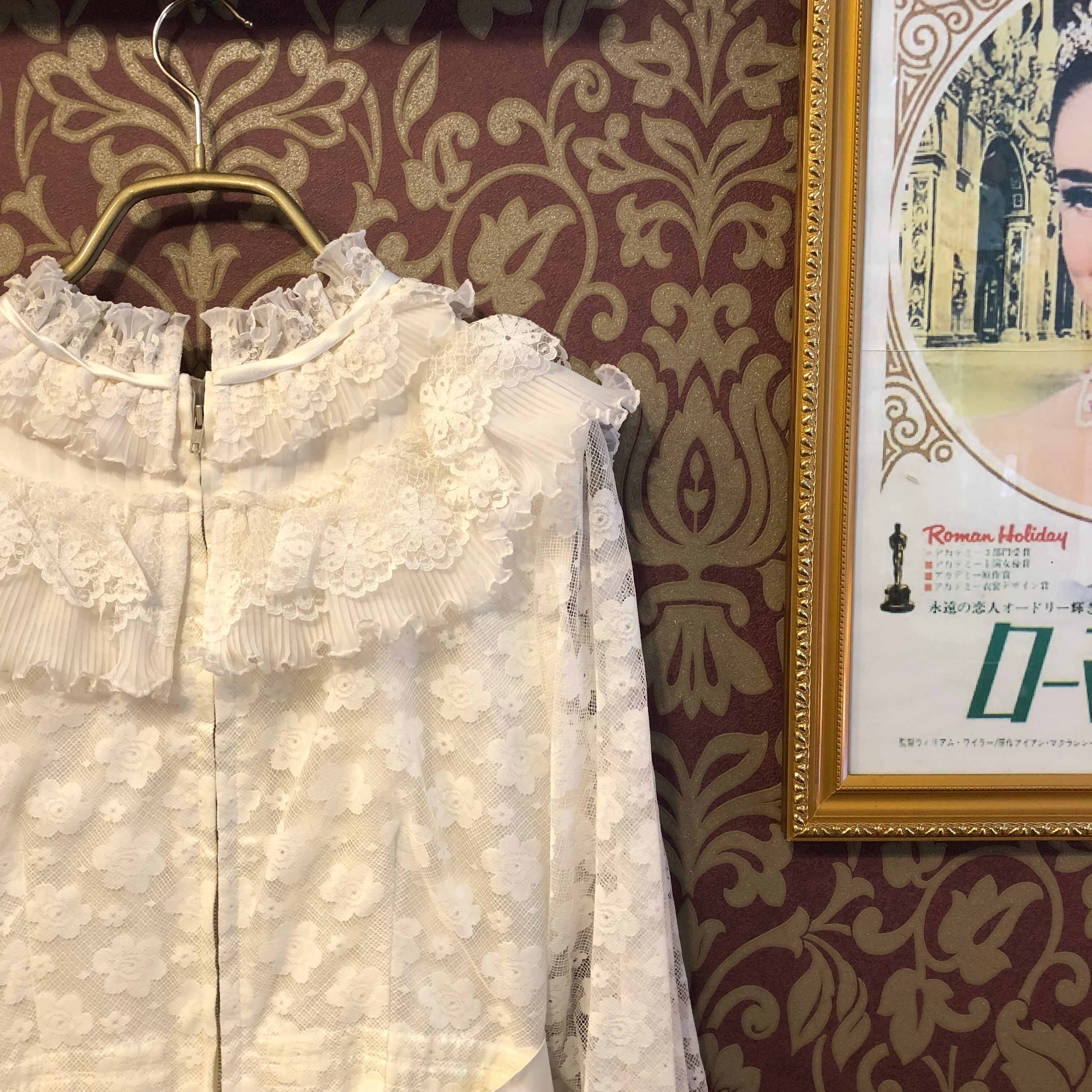 繊細な美しいレースとプリーツフリルで装飾され、首元のリボンとウエストベルトには厚手のしっかりとしたサテンが使われています。