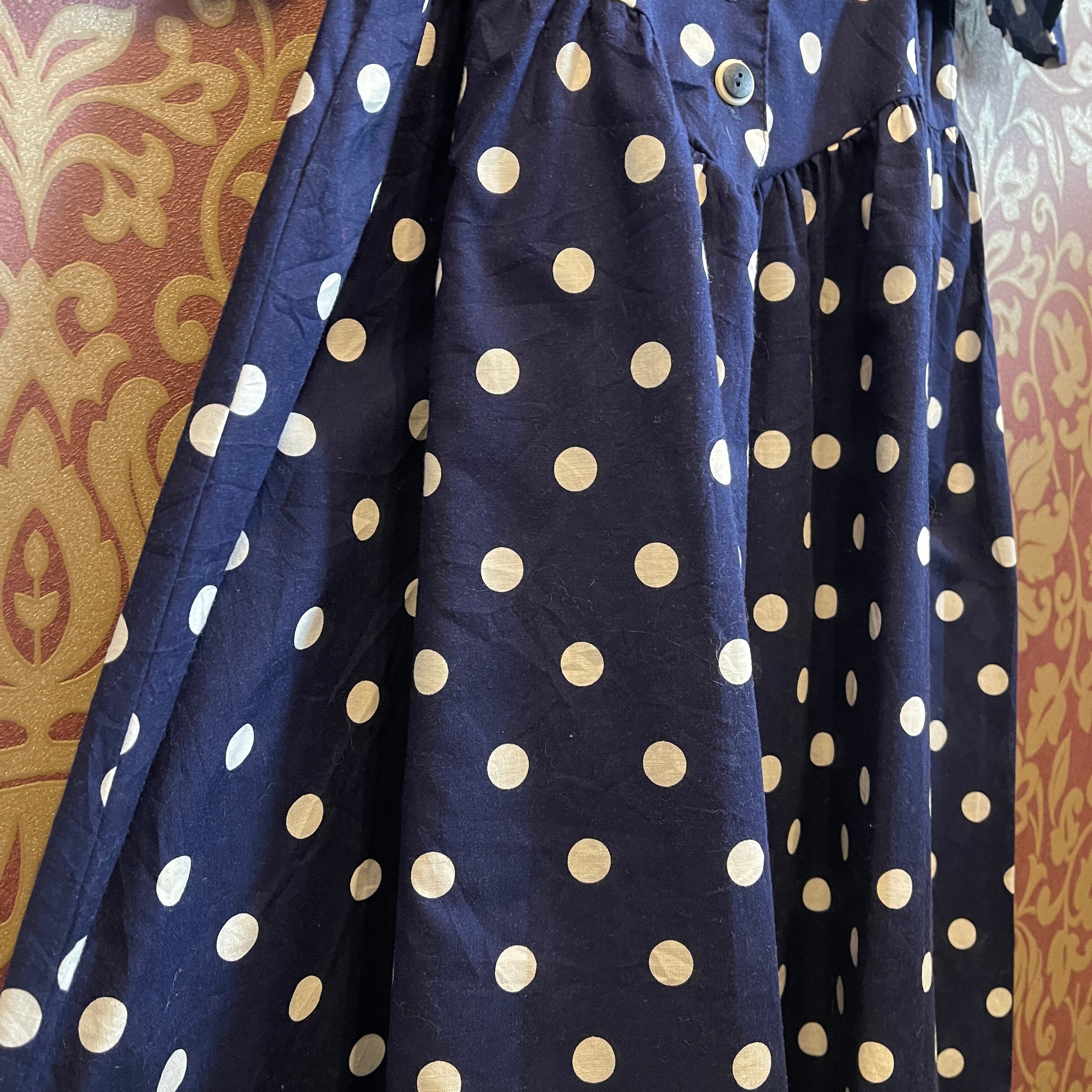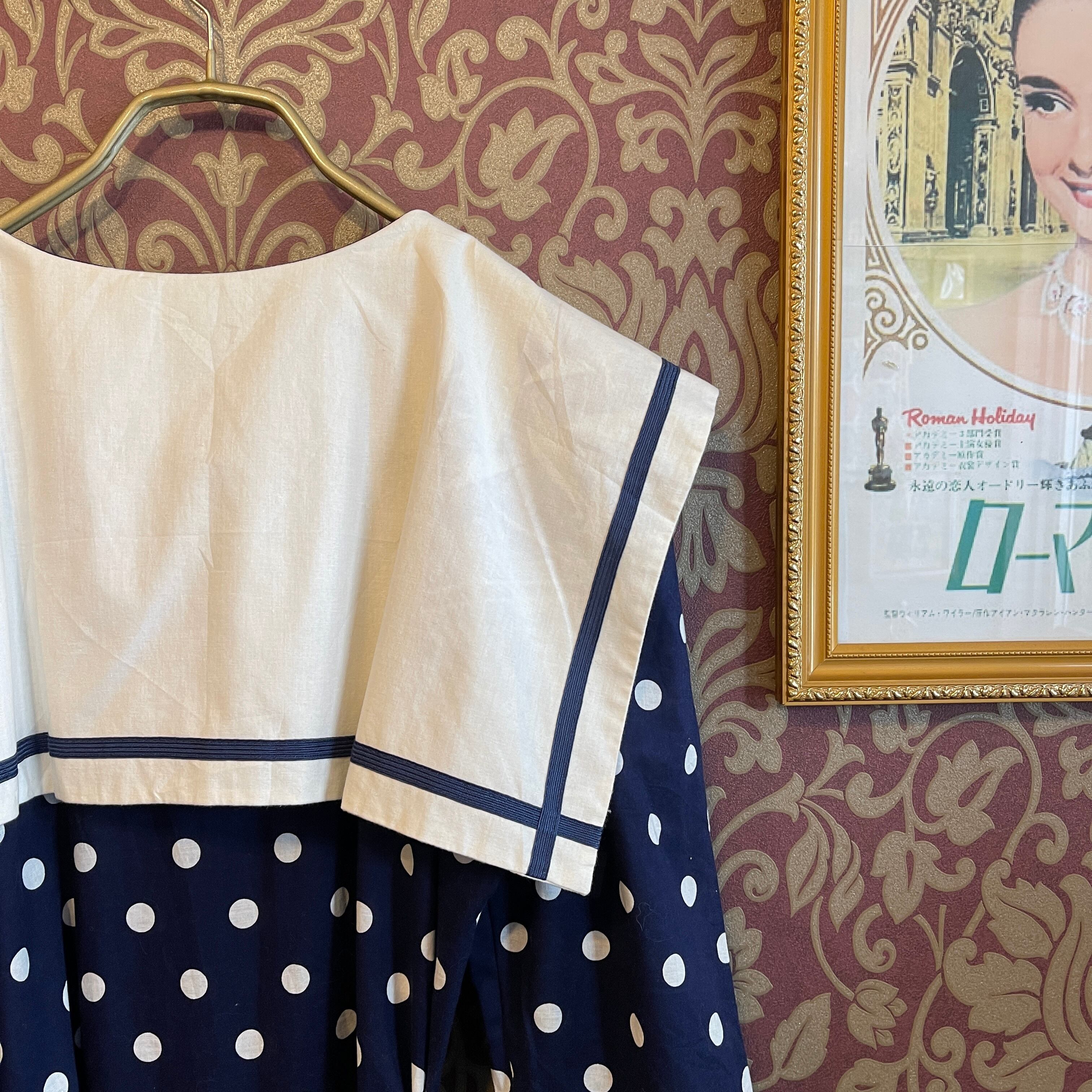 紺地に白のドット柄と、白い大きなスクエアカラーがキュートな1着です。襟に付いたテープでの縁取りもメリハリが出て◎