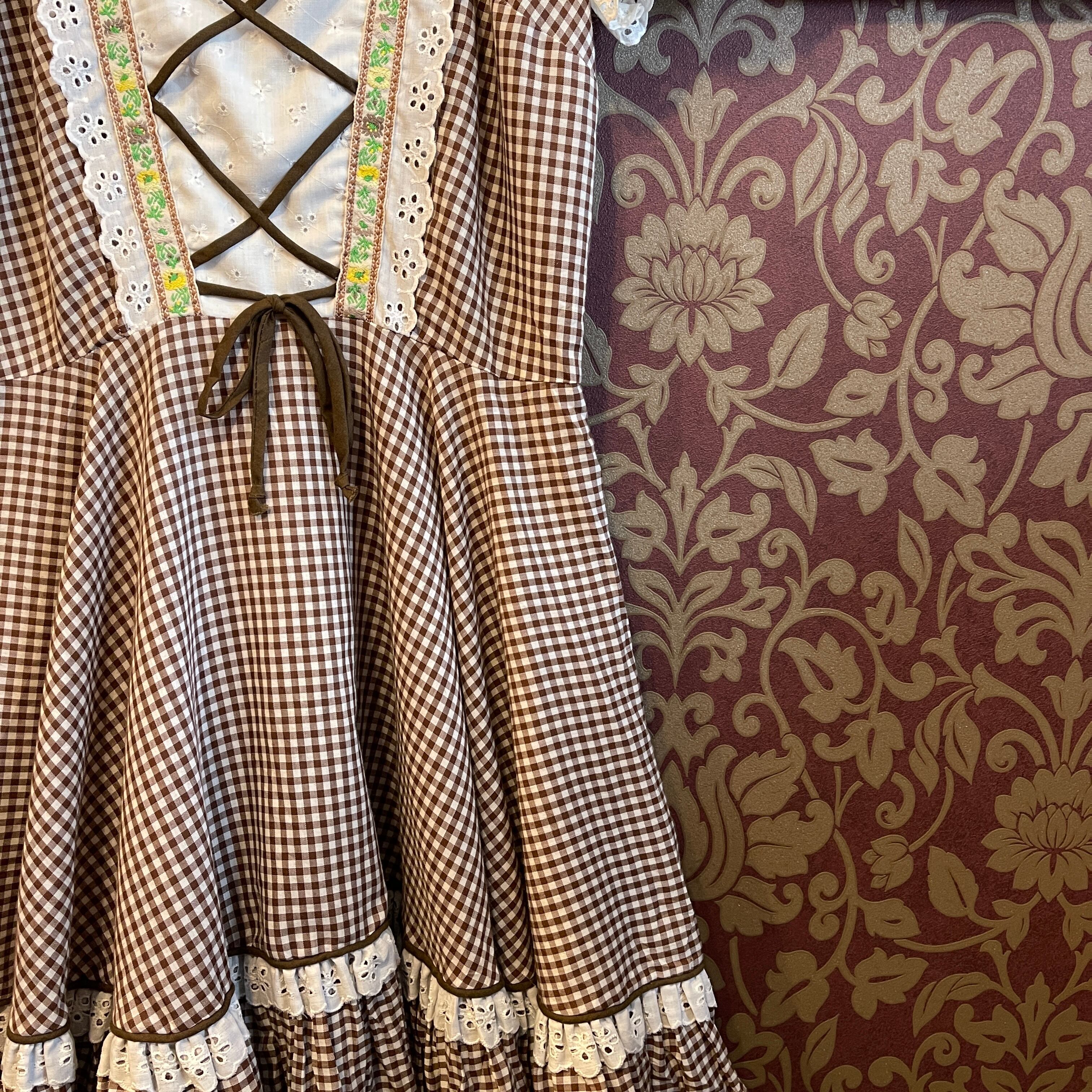 前身頃のデザインはレースアップ風で、カントリーな花刺繍が施されたブレードとレースで装飾されています。